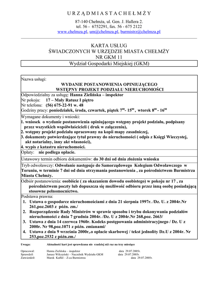 URZĄDMIASTACHEŁMŻY 87-140 Chełmża, ul. Gen. J. Hallera 2. tel. 56 - 6752291, fax. 56 - 675 2122 www.chelmza.pl, [email protected], [email protected] KARTA USŁUG ŚWIADCZONYCH W URZĘDZIE MIASTA CHEŁMŻY NR GKM 11 Wydział Gospodarki Miejskiej (GKM) Nazwa usługi: WYDANIE POSTANOWIENIA OPINIUJĄCEGO WSTĘPNY PROJEKT PODZIAŁU NIERUCHOMOŚCI Odpowiedzialny za usługę: Hanna Zielińska – inspektor Nr pokoju: 17 – Mały Ratusz I piętro Nr telefonu: (56) 675-22-91 w. 48 Godziny pracy: poniedziałek, środa, czwartek, piątek 700- 1500 , wtorek 800 - 1600 Wymagane dokumenty i wnioski: 1. wniosek o wydanie postanowienia opiniującego wstępny projekt podziału, podpisany przez wszystkich współwłaścicieli ( druk w załączeniu), 2. wstępny projekt podziału opracowany na kopii mapy zasadniczej, 3. dokumenty potwierdzające tytuł prawny do nieruchomości ( odpis z Księgi Wieczystej, akt notarialny, inny akt własności), 4. wypis z katastru nieruchomości. Opłaty: nie podlega opłacie. Ustawowy termin odbioru dokumentów: do 30 dni od dnia złożenia wniosku Tryb odwoławczy: Odwołanie następuje do Samorządowego Kolegium Odwoławczego w Toruniu, w terminie 7 dni od dnia otrzymania postanowienia , za pośrednictwem Burmistrza Miasta Chełmży. Odbiór postanowienia: osobiście ( za okazaniem dowodu osobistego) w pokoju nr 17 , za pośrednictwem poczty lub dopuszcza się możliwość odbioru przez inną osobę posiadającą stosowne pełnomocnictwo. Podstawa prawna: 1. Ustawa o gospodarce nieruchomościami z dnia 21 sierpnia 1997r. /Dz. U. z 2004r.Nr 261,poz.2603 z późn. zm./ 2. Rozporządzenie Rady Ministrów w sprawie sposobu i trybu dokonywania podziałów nieruchomości z dnia 7 grudnia 2004r. /Dz. U z 2004r.Nr 268,poz. 2663/ 3. Ustawa z dnia 14 czerwca 1960r. Kodeks postępowania administracyjnego / Dz. U z 2000r. Nr 98,poz.1071 z późn. zmianami/ 4. Ustawa z dnia 9 września 2000r,.o opłacie skarbowej / tekst jednolity Dz.U z 2004r. Nr 253,poz.2532 z późn.zm./ Uwaga: Aktualność kart jest sprawdzana nie rzadziej niż raz na trzy miesiące Opracował: Sprawdził: Zatwierdził: Hanna Zielińska – inspektor Janusz Wilczyński – Naczelnik Wydziału GKM Marek Kuffel – Z-ca Burmistrza data 29.07.2005r. data 29.07.2005r. data 29.07.2005r. Chełmża, dnia ....................................... ....................................................................... ....................................................................... ....................................................................... ....................................................................... ....................................................................... ....................................................................... ....................................................................... ....................................................................... BURMISTRZ MIASTA CHEŁMŻY ....................................................................... ....................................................................... (Nazwisko, imię , adres oraz numer telefonu) WNIOSEK o wydanie postanowienia opiniującego wstępny projekt podziału nieruchomości Zwracam się z wnioskiem o wydanie postanowienia opiniującego wstępny projekt podziału nieruchomości. Dane dotyczące nieruchomości: • • • • • położenie nieruchomości ................................................................................................................... obręb ewidencyjny ............................................................................................................................ numer działki .................................................................................................................................... powierzchnia nieruchomości............................................................................................................... nr księgi wieczystej ........................................................................................................................... • stanowiącej własność ......................................................................................................................................................... • (imię i nazwisko właściciela/li) .......................................................................................................................................................... (adres/y) .......................................................................................................................................................... .......................................................................................................................................................... Do wydzielenia proponowane jest wydzielenie ................................ działek, które oznaczone są we wstępnym projekcie ( liczba działek) następującymi numerami: .................................................................................................................. Przeznaczenie działek po podziale ..................................................................................................... ....................................................... ....................................................... (podpis właściciela/li nieruchomości) Załączniki: Wstępny projekt podziału opracowany na kopii mapy zasadniczej, a w przypadku jej braku – na kopii mapy katastralnej, uzupełniony w razie potrzeby niezbędnymi dla projektu podziału elementami zagospodarowania terenu. Dokumenty stwierdzające tytuł prawny do nieruchomości (odpis z KW, akt notarialny, akt własności ziemi). Wypis z katastru nieruchomości.