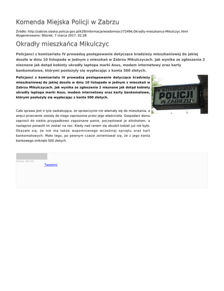 Komenda Miejska Policji w Zabrzu Źródło: http://zabrze.slaska.policja.gov.pl/k29/informacje/wiadomosci/72494,Okradly-mieszkanca-Mikulczyc.html Wygenerowano: Wtorek, 7 marca 2017, 02:28 Okradły mieszkańca Mikulczyc Policjanci z komisariatu IV prowadzą postępowanie dotyczące kradzieży mieszkaniowej do jakiej doszło w dniu 10 listopada w jednym z mieszkań w Zabrzu Mikulczycach. Jak wynika ze zgłoszenia 2 nieznane jak dotąd kobiety ukradły laptopa marki Asus, modem internetowy oraz karty bankomatowe, którymi posłużyły się wypłacając z konta 500 złotych. Policjanci z komisariatu IV prowadzą postępowanie dotyczące kradzieży mieszkaniowej do jakiej doszło w dniu 10 listopada w jednym z mieszkań w Zabrzu Mikulczycach. Jak wynika ze zgłoszenia 2 nieznane jak dotąd kobiety ukradły laptopa marki Asus, modem internetowy oraz karty bankomatowe, którymi posłużyły się wypłacając z konta 500 złotych. Cała sprawa jest o tyle zaskakująca, że sprawczynie nie włamały się do mieszkania, a wręcz przeciwnie zostały do niego zaproszone przez jego właściciela. Gospodarz domu zaprosił do siebie przypadkowo zapoznane panie, poczęstował je alkoholem, a następnie pozwolił im zostać na noc. Kiedy nad ranem się obudził kobiet już nie było. Okazało się, że nie ma także wspomnianego wcześniej sprzętu oraz kart bankomatowych. Mało tego, po pewnym czasie zorientował się, że z jego konta bankowego zniknęło 500 złotych. Ocena: 0/5 (0) Tweetnij