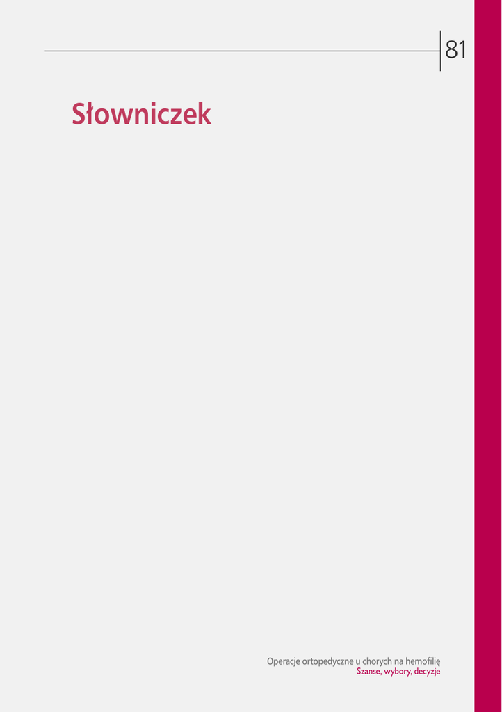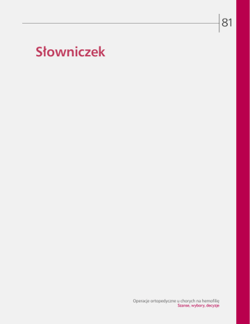 81 Słowniczek Operacje ortopedyczne u chorych na hemofilię Szanse, wybory, decyzje 82 Słowniczek Artropatia hemofilowa. Uszkodzenie stawu spowodowane ostrym lub nawracającym krwawieniem do stawu. Błona maziowa. Wewnętrzna warstwa torebki stawowej wydzielająca gęstą i lepką maź stawową, która ułatwia ruch w stawie oraz umożliwia odżywienie chrząstki stawowej. Chrząstka stawowa. Rodzaj tkanki łącznej pokrywającej powierzchnie kości w miejscu, gdzie tworzą ze sobą staw. Chrząstka stawowa amortyzuje wstrząsy i umożliwia łagodne ruchy stawu (bez bólu). Jest odporna na ścieranie. Ciężka postać hemofilii. Postać hemofilii, przy której aktywność czynnika VIII lub IX we krwi jest niższa niż 1% normy. Powoduje to występowanie częstych krwawień samoistnych, a także krwawień po niewielkich lub poważniejszych urazach, a także po zabiegach operacyjnych. Czynnik krzepnięcia. Białko osocza krwi biorące udział w procesach krzepnięcia. U osób chorych na hemofilię występuje jego obniżona aktywność, co może powodować występowanie wylewów dostawowych, domięśniowych albo innych wylewów wewnętrznych lub zewnętrznych (np. krwawienie z nosa). Obniżenie aktywności czynnika powoduje wydłużenie czasu krzepnięcia (powstania skrzepu). Endoproteza. Element, wykonany zazwyczaj ze stopów metali oraz tworzywa ceramicznego i/ lub polimerów (specjalny typ plastiku), wszczepiany operacyjnie do organizmu, zastępujący lub wspomagający utraconą funkcję narządów. Termin ten odnosi się głównie do implantów zastępujących uszkodzone części stawów, zwłaszcza biodrowego i kolanowego. Operacje ortopedyczne u chorych na hemofilię Szanse, wybory, decyzje Słowniczek Fizjoterapia. Dział rehabilitacji medycznej zajmujący się stymulowaniem procesu leczenia fizycznego przez zastosowanie ruchu (kinezyterapii), czynników fizykalnych (fizykoterapii), takich jak np. pole magnetyczne, oraz masażu. Celem fizjoterapii osób chorych na hemofilię jest utrzymanie bądź poprawa: siły i elastyczności mięśni, propriocepcji (czucia głębokiego), zakresu ruchu w stawie, równowagi ciała, prawidłowej postawy i lokomocji oraz ogólnej wytrzymałości organizmu. Guz rzekomy. Otorebkowany krwiak powstający w tkankach miękkich. Na skutek powtarzających się wylewów krwi powiększa się on do znacznych rozmiarów, niszcząc okoliczne tkanki – mięśniową, kostną, nerwową i niekiedy naczyniową. Mogą powstawać przetoki, a sam guz może ulec zakażeniu. Klinicznie guz czasem zachowuje jak nowotwór miejscowo złośliwy, stąd jego nazwa – pseudoguz. Guzy rzekome najczęściej lokalizują się w obrębie kończyn, okolicy lędźwiowej i pośladkowej, ale mogą też umiejscawiać się w ośrodkowym układzie nerwowym, oczodole czy ścianie jelita cienkiego. Pojawiają się u 1–2% osób z ciężką i umiarkowaną hemofilią. Wymagają leczenia chirurgicznego. Hemofilia. Genetyczna skaza krwotoczna, której objawem jest obniżona aktywność jednego z czynników krzepnięcia – białka krwi zapewniającego prawidłowy przebieg hemostazy. U osób chorych na hemofilię mogą występować wylewy krwi do stawów, mięśni lub innych tkanek miękkich, jak również krwawienia zewnętrzne. W przebiegu tej choroby czas krwawienia jest prawidłowy (prawidłowo działają inne mechanizmy hemostazy), znacznemu wydłużeniu ulega natomiast czas krzepnięcia. Objawy hemofilii leczy się przez podawanie koncentratów odpowiedniego czynnika krzepnięcia. Operacje ortopedyczne u chorych na hemofilię Szanse, wybory, decyzje 83 84 Słowniczek Hemofilia typu A. Choroba genetyczna charakteryzująca się częstymi krwawieniami do stawów, mięśni i innych tkanek miękkich. Przedłużające się krwawienia są spowodowane niskim poziomem czynnika VIII. Choroba ta nazywana jest również klasyczną hemofilią lub niedoborem czynnika VIII. Hemofilia typu B. Choroba genetyczna charakteryzująca się częstymi krwawieniami do stawów, mięśni i innych tkanek miękkich. Przedłużające się krwawienia są spowodowane niskim poziomem czynnika IX. Choroba ta nazywana jest również chorobą Christmasa lub niedoborem czynnika IX. Hemostaza. Zespół procesów fizjologicznych mających na celu utrzymanie stanu równowagi pomiędzy krzepnięciem i kontrolowanymi procesami antyzakrzepowymi (fibrynolizą), zabezpieczające przed utratą krwi po uszkodzeniu naczyń krwionośnych, utrzymujące szczelność naczyń oraz płynność krwi krążącej. Indukcja immunotolerancji (tolerancji immunologicznej). Metoda leczenia osób chorych na hemofilię powikłaną inhibitorem, mająca na celu „przyzwyczajenie” układu odpornościowego do dużych ilości uczulającego białka (w tym przypadku koncentratu czynnika krzepnięcia). Leczenie polega na podawaniu dużych dawek czynnika kilka razy w tygodniu, przez odpowiednio długi czas (od kilku miesięcy do kilku lat). Efektem skutecznego leczenia jest zaprzestanie wytwarzania przez organizm przeciwciał niszczących podawany koncentrat czynnika i przywrócenie skuteczności leczenia z zastosowaniem standardowych dawek. Operacje ortopedyczne u chorych na hemofilię Szanse, wybory, decyzje Słowniczek Inhibitory czynnika krzepnięcia. Zwykle przeciwciała skierowane przeciwko obcemu białku, jakim dla układu odpornościowego jest podawany koncentrat czynnika krzepnięcia. W pewnych sytuacjach inhibitor może występować u osób zdrowych, prowadząc do rozwoju tzw. hemofilii nabytej. Koncentrat czynnika krzepnięcia. Liofilizowany preparat odpowiedniego białka krzepnięcia, który po rozpuszczeniu w jałowej wodzie (aqua pro injectione) jest wprowadzany drogą dożylną do organizmu osoby chorej, w celu przywrócenia oczekiwanej aktywności brakującego czynnika krzepnięcia. Koncentraty czynnika mogą być wytwarzane z osocza ludzkiego lub przy użyciu metod biotechnologii, takich jak rekombinacja DNA. Kość piszczelowa. Jedna z dw