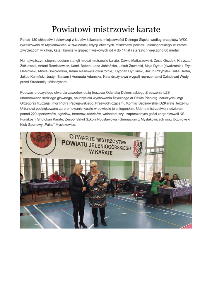 Powiatowi mistrzowie karate Ponad 130 chłopców i dziewcząt z klubów kilkunastu miejscowości Dolnego Śląska według przepisów WKC rywalizowało w Mysłakowicch w dwunastej edycji otwartych mistrzostw powiatu jeleniogórskiego w karate. Zwycięzcom w kihon, kata i kumite w grupach wiekowych od 4 do 14 lat i starszych wręczono 60 medali. Na najwyższym stopniu podium stanęli młodzi mistrzowie karate: Dawid Matiaszewski, Zosia Gozdek, Krzysztof Ziółkowski, Antoni Remiszewicz, Kamil Bęben, Lena Jabłońska, Jakub Zaworski, Maja Dybur (dwukrotnie), Eryk Getkowski, Mirela Sokołowska, Adam Rasiewicz dwukrotnie), Cyprian Cyruliński, Jakub Przybyłek, Julia Herba, Jakub Kamiński, Justyn Balsam i Honorata Adamska. Kata drużynowe wygrali reprezentanci Dziadowej Wody przed Stradomią i Miłoszycami. Podczas uroczystego otwarcia zawodów dużą brązową Odznaką Dolnośląskiego Zrzeszenia LZS uhonorowano sędziego głównego, nauczyciela wychowania fizycznego dr Pawła Piepiorę, nauczycieli mgr Grzegorza Kuczaja i mgr Piotra Paciejewskiego. Przewodniczącemu Komisji Sędziowskiej DZKarate Jerzemu Urbanowi podziękowano za promowanie karate w powiecie jeleniogórskim. Udane mistrzostwa z udziałem ponad 220 sportowców, sędziów, trenerów, rodziców, wolontariuszy i zaproszonych gości zorganizowali KS Funakoshi Shotokan Karate, Zespół Szkół Szkoła Podstawowa i Gimnazjum z Mysłakowicach oraz Uczniowski Klub Sportowy „Pałac” Mysłakowice.