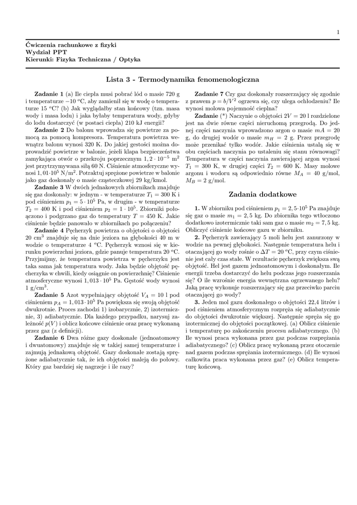 Lista 3 - Termodynamika fenomenologiczna Zadania dodatkowe
