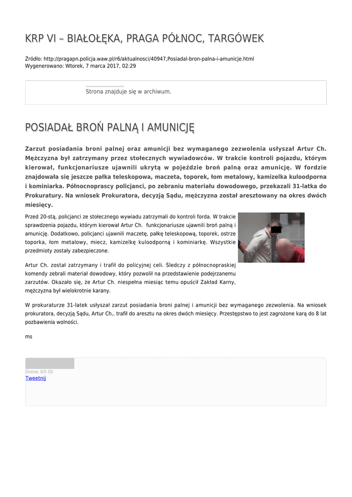 KRP VI – BIAŁOŁĘKA, PRAGA PÓŁNOC, TARGÓWEK Źródło: http://pragapn.policja.waw.pl/r6/aktualnosci/40947,Posiadal-bron-palna-i-amunicje.html Wygenerowano: Wtorek, 7 marca 2017, 02:29 Strona znajduje się w archiwum. POSIADAŁ BROŃ PALNĄ I AMUNICJĘ Zarzut posiadania broni palnej oraz amunicji bez wymaganego zezwolenia usłyszał Artur Ch. Mężczyzna był zatrzymany przez stołecznych wywiadowców. W trakcie kontroli pojazdu, którym kierował, funkcjonariusze ujawnili ukrytą w pojeździe broń palną oraz amunicję. W fordzie znajdowała się jeszcze pałka teleskopowa, maczeta, toporek, łom metalowy, kamizelka kuloodporna i kominiarka. Północnoprascy policjanci, po zebraniu materiału dowodowego, przekazali 31-latka do Prokuratury. Na wniosek Prokuratora, decyzją Sądu, mężczyzna został aresztowany na okres dwóch miesięcy. Przed 20-stą, policjanci ze stołecznego wywiadu zatrzymali do kontroli forda. W trakcie sprawdzenia pojazdu, którym kierował Artur Ch. funkcjonariusze ujawnili broń palną i amunicję. Dodatkowo, policjanci ujawnili maczetę, pałkę teleskopową, toporek, ostrze toporka, łom metalowy, miecz, kamizelkę kuloodporną i kominiarkę. Wszystkie przedmioty zostały zabezpieczone. Artur Ch. został zatrzymany i trafił do policyjnej celi. Śledczy z północnopraskiej komendy zebrali materiał dowodowy, który pozwolił na przedstawienie podejrzanemu zarzutów. Okazało się, że Artur Ch. niespełna miesiąc temu opuścił Zakład Karny, mężczyzna był wielokrotnie karany. W prokuraturze 31-latek usłyszał zarzut posiadania broni palnej i amunicji bez wymaganego zezwolenia. Na wniosek prokuratora, decyzją Sądu, Artur Ch,. trafił do aresztu na okres dwóch miesięcy. Przestępstwo to jest zagrożone karą do 8 lat pozbawienia wolności. ms Ocena: 0/5 (0) Tweetnij