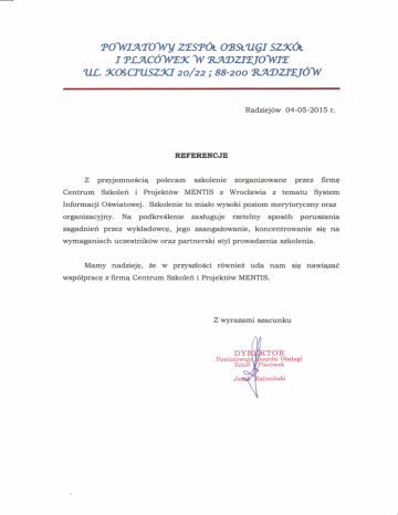 PO'WIJ\T01Vy ZTSPÓŁ O'BStU@I SZXÓŁ I PLJ\CÓ'WTX 'W 1UtlJZITJO'WIT UL. XOśCIUSZXI 20/22 ; 88-200 1Ut.1JZITJÓ'W Radziejów 04-05-2015 r. REFERENCJE Z Centrum przyjemnością polecam szkolenie zorganizowane przez Szkoleń i Projektów MENTIS z Wrocławia z tematu firmę System Informacji Oświatowej. Szkolenie to miało wysoki poziom merytoryczny oraz organizacyjny. Na podkreślenie zasługuje rzetelny zagadnień przez wykładowcę, jego zaangażowanie, sposób poruszania koncentrowanie się na wymaganiach uczestników oraz partnerski styl prowadzenia szkolenia. Mamy nadzieję, że w przyszłości również uda nam współpracę z firmą Centrum Szkoleń i Projektów MENTIS. Z wyrazami szacunku SIę nawiązać