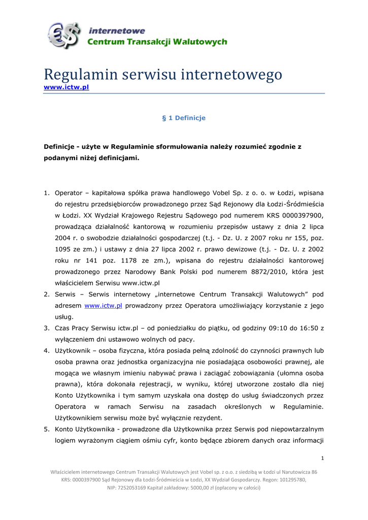Regulamin serwisu internetowego www.ictw.pl § 1 Definicje Definicje - użyte w Regulaminie sformułowania należy rozumieć zgodnie z podanymi niżej definicjami. 1. Operator – kapitałowa spółka prawa handlowego Vobel Sp. z o. o. w Łodzi, wpisana do rejestru przedsiębiorców prowadzonego przez Sąd Rejonowy dla Łodzi-Śródmieścia w Łodzi. XX Wydział Krajowego Rejestru Sądowego pod numerem KRS 0000397900, prowadząca działalność kantorową w rozumieniu przepisów ustawy z dnia 2 lipca 2004 r. o swobodzie działalności gospodarczej (t.j. - Dz. U. z 2007 roku nr 155, poz. 1095 ze zm.) i ustawy z dnia 27 lipca 2002 r. prawo dewizowe (t.j. - Dz. U. z 2002 roku nr 141 poz. 1178 ze zm.), wpisana do rejestru działalności kantorowej prowadzonego przez Narodowy Bank Polski pod numerem 8872/2010, która jest właścicielem Serwisu www.ictw.pl 2. Serwis – Serwis internetowy „internetowe Centrum Transakcji Walutowych” pod adresem www.ictw.pl prowadzony przez Operatora umożliwiający korzystanie z jego usług. 3. Czas Pracy Serwisu ictw.pl – od poniedziałku do piątku, od godziny 09:10 do 16:50 z wyłączeniem dni ustawowo wolnych od pacy. 4. Użytkownik – osoba fizyczna, która posiada pełną zdolność do czynności prawnych lub osoba prawna oraz jednostka organizacyjna nie posiadająca osobowości prawnej, ale mogąca we własnym imieniu nabywać prawa i zaciągać zobowiązania (ułomna osoba prawna), która dokonała rejestracji, w wyniku, której utworzone zostało dla niej Konto Użytkownika i tym samym uzyskała ona dostęp do usług świadczonych przez Operatora w ramach Serwisu na zasadach określonych w Regulaminie. Użytkownikiem serwisu może być wyłącznie rezydent. 5. Konto Użytkownika - prowadzone dla Użytkownika przez Serwis pod niepowtarzalnym logiem wyrażonym ciągiem ośmiu cyfr, konto będące zbiorem danych oraz informacji 1 Właścicielem internetowego Centrum Transakcji Walutowych jest Vobel sp. z o.o. z siedzibą w Łodzi ul Narutowicza 86 KRS: 0000397900 Sąd Rejonowy dla Łodzi-Śródmieścia w Łodzi, XX Wydział Gospodarczy. Regon: 101295780, NIP: 7252053169 Kapitał zakładowy: 5000,00 zł (opłacony w całości) o jego działaniach w ramach serwisu. Konto jest dostępne po zarejestrowaniu się na stronie www.ictw.pl i służy do zarządzania danymi, wydawania dyspozycji wymiany walut oraz dyspozycji przelewów. 6. Rezydent - osoby fizyczne mające miejsce zamieszkania w kraju oraz osoby prawne mające siedzibę w kraju, a także inne podmioty mające siedzibę w kraju, posiadające zdolność zaciągania zobowiązań i nabywania praw we własnym imieniu; rezydentami są również znajdujące się w kraju oddziały, przedstawicielstwa i przedsiębiorstwa utworzone przez nierezydentów oraz polskie przedstawicielstwa dyplomatyczne, urzędy konsularne i inne polskie przedstawicielstwa oraz misje specjalne, korzystające z immunitetów i przywilejów dyplomatycznych lub konsularnych. 7. Nierezydent - osoba fizyczna, posiadająca miejsce zamieszkania za granicą, oraz osoba prawna, posiadająca siedzibę za granicą, a także inny podmiot posiadający siedzibę za granicą, posiadająca zdolność zaciągania zobowiązań i nabywania praw we własnym imieniu. Nierezydentami są również znajdujące się za granicą oddziały, przedstawicielstwa i przedsiębiorstwa utworzone przez rezydentów, oraz obce przedstawicielstwa dyplomatyczne, urzędy konsularne i inne obce przedstawicielstwa oraz misje specjalne i organizacje międzynarodowe, korzystające z immunitetów i przywilejów dyplomatycznych lub konsularnych. 8. Waluta bazowa – waluta, której cena jednostkowa jest wyrażona w walucie kwotowanej (pierwsza waluta w parze walutowej). 9. Waluta kwotowana – waluta, w której wyrażona jest cena jednostki (lub określonej liczby jednostek) waluty bazowej (druga waluta w parze walutowej). 10. Kurs walutowy - ustalony w danym momencie zawarcia transakcji kurs wymiany waluty bazowej na walutę kwotowaną, prezentowany w serwisie. Kurs walutowy może być ustalany także w inny sposób - określony w aneksie do niniejszego Regulaminu. 11. Kwota transakcji – wyrażona w walucie bazowej kwota, której kupno lub sprzedaż jest przedmiotem transakcji. 12. Login i hasło - unikalne dane wprowadzone przez Użytkownika podczas rejestracji w serwisie, które nie mogą być udostępniane osobom trzecim, służące do logowania w serwisie. 13. Adres e-mail Użytkownika – konto poczty elektronicznej Użytkownika, zdefiniowane w panelu rejestracyjnym. 14. Potwierdzenie - potwierdzeniem transakcji wymiany walut jest wygenerowana przez Operatora faktura elektroniczna w formacie PDF (Portable Document Format), 2 Właścicielem internetowego Centrum Transakcji Walutowych jest Vobel sp. z o.o. z siedzibą w Łodzi ul Narutowicza 86 KRS: 0000397900 Sąd Rejonowy dla Łodzi-Śródmieścia w Łodzi, XX Wydział Gospodarczy. Regon: 101295780, NIP: 7252053169 Kapitał zakładowy: 5000,00 zł (opłacony w całości) udostępniana do samodzielnego pobrania w serwisie przez Użytkownika. Akceptując Regulamin Użytkownik wyraża zgodę na otrzymywanie potwierdzeń tą drogą. 15. Rachunek rozliczeniowy Operatora – zwany dalej Rachunkiem Operatora, służy do przeprowadzania rozliczeń Użytkownika z Operatorem, w szczególności wpłacania środków przeznaczanych na transakcje wymiany walut. Rachunki rozliczeniowe operatora prowadzone są w walutach PLN, EUR, USD, CHF, GBP, numery rachunków rozliczeniowych dostępne są w zakładce „Informacje”. 16. Rachunek rozliczeniowy Klienta – zwany dalej Rachunkiem rozliczeniowym Użytkownika, musi być prowadzony na rzecz Użytkownika w Polskim Banku zarejestrowanym w Narodowym Banku Polskim posiadającym kod SWIFT/BIC. Służy do dokonywania przelewów przez Operatora środków pieniężnych wynikających z dokonania Transakcji Walutowej lub przelewu zwrotnego środków pieniężnych Użytkownika bez dokonani
