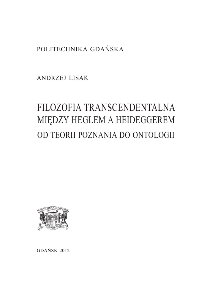 POLITECHNIKA GDAŃSKA ANDRZEJ LISAK FILOZOFIA TRANSCENDENTALNA MIĘDZY HEGLEM A HEIDEGGEREM OD TEORII POZNANIA DO ONTOLOGII GDAŃSK 2012 PRZEWODNICZĄCY KOMITETU REDAKCYJNEGO WYDAWNICTWA POLITECHNIKI GDAŃSKIEJ Romuald Szymkiewicz REDAKTOR PUBLIKACJI NAUKOWYCH Janusz T. Cieśliński REDAKTOR SERII Przemysław Parszutowicz RECENZENCI Ewa Starzyńska-Kościuszko Mirosław Żelazny PROJEKT OKŁADKI Jolanta Cieślawska Wydano za zgodą Rektora Politechniki Gdańskiej Oferta wydawnicza Politechniki Gdańskiej jest dostępna pod adresem www.pg.gda.pl/WydawnictwoPG © Copyright by Wydawnictwo Politechniki Gdańskiej Gdańsk 2012 Utwór nie może być powielany i rozpowszechniany, w jakiejkolwiek formie i w jakikolwiek sposób, bez pisemnej zgody wydawcy ISBN 978-83-7348-412-2 SPIS TREŚCI WSTĘP .......................................................................................................................................... 7 1. WPROWADZENIE: PROBLEM PRZEDMIOTU FILOZOFII PO HEGLU ......................... 1.1. Kontekst ............................................................................................................................ 1.2. Główne postheglowskie określenia przedmiotu filozofii .................................................. 1.2.1. Filozofia jako teoria poznania ............................................................................. 1.2.2. Filozofia jako teoria poznania historii ................................................................. 1.2.3. Filozofia jako teoria nauki ................................................................................... 1.2.4. Filozofia jako psychologia ................................................................................... 1.2.5. Filozofia jako historia filozofii ............................................................................ 1.2.6. Filozofia jako teoria wartości .............................................................................. 1.2.7. Filozofia jako światopogląd ................................................................................. 1.2.8. Filozofia jako metafizyka .................................................................................... 1.2.9. Filozofia jako ontologia ....................................................................................... 1.2.10. Filozofia jako analiza języka ............................................................................... 11 11 22 22 26 26 28 34 35 36 37 42 42 2. POWSTANIE, ROZWÓJ I UPADEK NEOKANTYZMU JAKO NATURALNEGO CZYNNIKA ROZWOJU FILOZOFII TRANSCENDENTALNEJ ....................................................... 2.1. Wstęp ................................................................................................................................ 2.2. Recepcja Kanta przed powstaniem neokantyzmu ............................................................. 2.3. Kształtowanie się podstaw programu neokantyzmu ......................................................... 2.4. Wczesny neokantyzm ....................................................................................................... 2.4.1. Otto Liebmann ....................................................................................................... 2.4.2. Friedrich Albert Lange – neokantowski naturalizm .............................................. 2.4.3. Spór Fischera z Trendelenburgiem ........................................................................ 2.5. Neokantyzm klasyczny ..................................................................................................... 2.5.1. Poglądy Hermanna Cohena w odniesieniu do wczesnego neokantyzmu .............. 2.5.2. Neokantyzm lat siedemdziesiątych XIX wieku ..................................................... 2.5.3. Wilhelm Windelband ............................................................................................. 2.5.4. Alois Riehl ............................................................................................................. 2.5.5. Inni neokantyści .................................................................................................... 2.5.6. Koniec neokantyzmu ............................................................................................. 45 45 50 52 67 67 71 79 82 82 86 95 103 119 126 3. IDEA FILOZOFII TRANSCENDENTALNEJ W SZKOLE MARBURSKIEJ ...................... 3.1. Marburska szkoła neokantyzmu ....................................................................................... 3.2. Poglądy Hermanna Cohena .............................................................................................. 3.2.1. Logika transcendentalna a ogólny charakter myśli Cohena .................................. 3.2.2. Przezwyciężenie dualizmu naoczności i myślenia ................................................ 3.2.3. Pojęcie „źródła” (Ursprung) .................................................................................. 3.2.4. System filozofii i pozostałe jego działy ................................................................. 3.2.4.1. Idea systemu ............................................................................................ 3.2.4.2. Etyka ........................................................................................................ 3.2.4.3. Estetyka ................................................................................................... 3.2.4.4. Religia ...................................................................................................... 3.2.4.5. Psychologia .............................................................................................. 3.3. Poglądy Paula Natorpa ..................................................................................................... 3.3.1. Logika transcendentalna ........................................................................................ 3.3.2. Pojęcie poznania .........