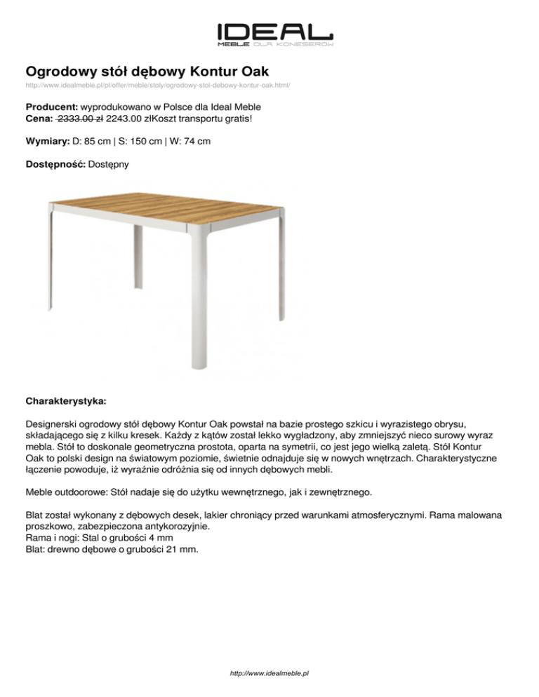 Ogrodowy stół dębowy Kontur Oak http://www.idealmeble.pl/pl/offer/meble/stoly/ogrodowy-stol-debowy-kontur-oak.html/ Producent: wyprodukowano w Polsce dla Ideal Meble Cena: 2333.00 zł 2243.00 złKoszt transportu gratis! Wymiary: D: 85 cm | S: 150 cm | W: 74 cm Dostępność: Dostępny Charakterystyka: Designerski ogrodowy stół dębowy Kontur Oak powstał na bazie prostego szkicu i wyrazistego obrysu, składającego się z kilku kresek. Każdy z kątów został lekko wygładzony, aby zmniejszyć nieco surowy wyraz mebla. Stół to doskonale geometryczna prostota, oparta na symetrii, co jest jego wielką zaletą. Stół Kontur Oak to polski design na światowym poziomie, świetnie odnajduje się w nowych wnętrzach. Charakterystyczne łączenie powoduje, iż wyraźnie odróżnia się od innych dębowych mebli. Meble outdoorowe: Stół nadaje się do użytku wewnętrznego, jak i zewnętrznego. Blat został wykonany z dębowych desek, lakier chroniący przed warunkami atmosferycznymi. Rama malowana proszkowo, zabezpieczona antykorozyjnie. Rama i nogi: Stal o grubości 4 mm Blat: drewno dębowe o grubości 21 mm. http://www.idealmeble.pl Dostępne wersje produktu: nazwa produktu Stół dębowy Kontur Oak warianty kolor biały, czarny cena dostępne 2333.00zł 2243.00zł Dostępny Stół dębowy Kontur Oak kolor czerwony, 2333.00zł 2243.00zł do 2 tygodni granatowy, jasnoniebieski, szary, zielony http://www.idealmeble.pl Zdjęcia produktu: http://www.idealmeble.pl Powered by TCPDF (www.tcpdf.org)