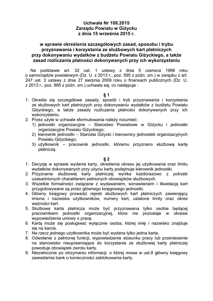 Uchwała Nr 108.2015 Zarządu Powiatu w Giżycku z dnia 15 września 2015 r. w sprawie określenia szczegółowych zasad, sposobu i trybu przyznawania i korzystania ze służbowych kart płatniczych przy dokonywaniu wydatków z budżetu Powiatu Giżyckiego, a także zasad rozliczania płatności dokonywanych przy ich wykorzystaniu Na podstawie art. 32 ust. 1 ustawy z dnia 5 czerwca 1998 roku o samorządzie powiatowym (Dz. U. z 2013 r., poz. 595 z późn. zm.) w związku z art. 247 ust. 3 ustawy z dnia 27 sierpnia 2009 roku o finansach publicznych (Dz. U. z 2013 r., poz. 885 z późn. zm.) uchwala się, co następuje : §1 1. Określa się szczegółowe zasady, sposób i tryb przyznawania i korzystania ze służbowych kart płatniczych przy dokonywaniu wydatków z budżetu Powiatu Giżyckiego, a także zasady rozliczania płatności dokonywanych przy ich wykorzystaniu. 2. Przez użyte w uchwale sformułowania należy rozumieć: 1) jednostki organizacyjne – Starostwo Powiatowe w Giżycku i jednostki organizacyjne Powiatu Giżyckiego; 2) kierownik jednostki – Starosta Giżycki i kierownicy jednostek organizacyjnych Powiatu Giżyckiego; 3) użytkownik – pracownik jednostki, któremu przyznano służbową kartę płatniczą. §2 1. Decyzję w sprawie wydania karty, określenia okresu jej użytkowania oraz limitu wydatków dokonywanych przy użyciu karty podejmuje kierownik jednostki. 2. Przyznanie służbowej karty płatniczej wynika każdorazowo z potrzeb uzasadnionych charakterem pełnionych obowiązków służbowych. 3. Wszelkie formalności związane z wydawaniem, wznawianiem i likwidacją kart przygotowywane są przez głównego księgowego jednostki. 4. Główny księgowy prowadzi rejestr służbowych kart płatniczych zawierający imiona i nazwiska użytkowników, numery kart, ustalone limity oraz okres ważności kart. 5. Służbowa karta płatnicza może być przyznawana tylko osobie będącej pracownikiem jednostki organizacyjnej, która nie pozostaje w okresie wypowiedzenia umowy o pracę. 6. Kartą może się posługiwać wyłącznie osoba, której imię i nazwisko znajduje się na karcie. 7. Na rzecz jednego użytkownika może być wydana tylko jedna karta. 8. Odwołanie z pełnionej funkcji, wypowiedzenie stosunku pracy lub przeniesienie na stanowisko nieuprawniające do korzystania ze służbowej karty płatniczej powoduje obowiązek zwrotu karty. 9. Niezwłocznie po otrzymaniu informacji, o której mowa w ust.8 główny księgowy zawiadamia bank o konieczności zablokowania karty. §3 1. Służbowa karta płatnicza jest przyznawana na podstawie umowy zawartej między kierownikiem jednostki a użytkownikiem, która określa prawa i obowiązki użytkownika. Wzór w/w umowy stanowi załącznik nr 1 do Uchwały. 2. Użytkownicy kart płatniczych zobowiązani są do złożenia stosownego oświadczenia o wyrażeniu zgody na potrącenie z wynagrodzenia należności wynikających z kwot nierozliczonych oraz z tytułu nieprawidłowego wykorzystania służbowej karty płatniczej w myśl art. 91 § 1 Kodeksu pracy. Wzór w/w oświadczenia stanowi załącznik nr 2 do Uchwały. 3. Umowa i oświadczenie są przechowywane w aktach osobowych użytkownika karty. 1. 2. 3. 4. 5. 1. 2. 3. 4. §4 Korzystanie ze służbowych kart płatniczych ma na celu ograniczenie obrotu gotówkowego. Służbową kartą płatniczą mogą być regulowane wydatki bezpośrednio związane z wykonywaniem obowiązków służbowych w sytuacji, kiedy nie można dokonać płatności w formie przelewu. Służbowa karta płatnicza może być wykorzystywana tylko do regulowania wydatków w ramach planu finansowego jednostki. Wypłata gotówki z bankomatu przy pomocy karty jest niedozwolona, chyba że wypłata taka jest konieczna na skutek niemożliwych do przewidzenia zdarzeń losowych lub w przypadku konieczności aktywacji karty. Wydatki publiczne regulowane służbowymi kartami płatniczymi winny być dokonywane w sposób celowy i oszczędny. §5 Każdą operację finansową dokonywaną za pomocą służbowej karty płatniczej użytkownik dokumentuje fakturą VAT, rachunkiem lub innym równoważnym dowodem księgowym. Dokumenty opłacone kartą winny na odwrocie zawierać adnotację „Opłacono kartą płatniczą nr …….”. Użytkownik karty obowiązany jest przedłożyć je w ciągu 3 dni od dokonania transakcji. W przypadku, gdy dokonanie wydatku nie zostało potwierdzone za pomocą dowodów księgowych lub gdy związek dokonanej operacji finansowej z wykonywaniem obowiązków służbowych nie zostanie udowodniony, użytkownik karty zobowiązany jest do zwrotu równowartości kwoty wydatku wraz ze wszystkimi kosztami i prowizjami bankowymi. W przypadku niedokonania zwrotu lub dokonania go w nieprawidłowej wysokości, należność podlega potrąceniu z najbliższego wynagrodzenia za pracę. §6 1. Użytkownicy służbowych kart płatniczych zobowiązani są do: 1) przechowywania karty płatniczej i ochrony kodu identyfikacyjnego PIN z zachowaniem należytej staranności, w tym: nieprzechowywania karty płatniczej razem z numerem PIN; 2) zabezpieczenia karty płatniczej przed utratą (zagubieniem, kradzieżą) lub zniszczeniem; 3) nieudostępniania karty płatniczej i numeru PIN osobom trzecim; 4) przestrzegania zasad korzystania ze służbowych kart płatniczych, określonych w niniejszej uchwale oraz w umowie zawartej z bankiem; 2 5) niezwłocznego zgłoszenia do banku utraty karty płatniczej w celu dokonania blokady, a w przypadku kradzieży również zgłoszenie tego faktu policji. 2. W razie utraty przez użytkownika karty płatniczej i zaniechania jej blokady we właściwym terminie, wszelkie koszty związane z utratą środków pieniężnych i użyciem jej przez osoby do tego nieupoważnione, obciążać będą pracownika – posiadacza karty płatniczej. §7 Uchwała wchodzi w życie z dniem podjęcia i podlega publikacji. Starosta Giżycki Wacław Strażewicz 3