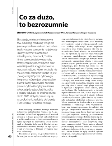 FELIETON Co za dużo, to bezrozumnie Sławomir Osiński, dyrektor Szkoły Podstawowej nr 47 im. Kornela Makuszyńskiego w Szczecinie Wrzesień/Październik 2014 • Nr 5 Ekscytacja, miejscami niezdrowa, tzw. edukacją medialną wciąż ma jeszcze przesłania realne i potrzebne jest krytyczne spojrzenie na jej wady i zalety. Internet oraz tablice interaktywne, Facebook, Twitter i inne społecznościowe portale, strony edukacyjne, Wikipedia oraz wszelkiej maści ściągi sieciowe to rzeczywistość, od której w szkole nie ma ucieczki. Strasznie trudne to jest „do ogarnięcia” przez cyfrowego imigranta, którym jest po prawdzie prawie każdy nauczyciel. Nieliczni pierwsi cyfrowi tubylcy nieśmiało wkraczają do tej profesji i szybko z branży edukacji ze średnią brutto około 3000 złotych przenoszą się w popłochu i z radością do branży IT ze średnią 10 000 na miesiąc. 66 Pewien mądry człowiek, którego nazwisko miłosiernie zabrał mi ten Niemiec na A., powiedział, że ludzkość egzystuje na Ziemi tak sprawnie i długo, ponieważ wykształciliśmy w sobie mechanizm szybkiego formułowania opinii opartych na niewielkiej ilości niepełnych w dodatku informacji. Dzisiaj zaś paradoksalnie musimy nauczyć się żyć i przetrwać w świecie, w którym występuje nadmiar informacji. Ekonomiści głoszą, iż „przeładowanie informacyjne to nie tylko utrudnienie w przy- swajaniu informacji, to także koszty związane z utraconymi korzyściami, jakie niosłoby przyswojenie treści wyeliminowanych podczas selekcji informacji”. Przed współczesną szkołą staje trudne zadanie nie tyle nauczania określonej wiedzy, ale uświadamiania, że ogromna jej część zostaje pominięta z powodu przeładowania informacyjnego. Zatem zrozumiała fascynacja nowymi technologiami, wzmacniana ofertą i zabiegami promocyjnymi producentów sprzętu informatycznego, jest dzisiaj być może nie do końca dobrym wyjściem. Z jednej strony organy prowadzące i szkoły starają się wyposażyć swoje sale w komputery, laptopy i tablice interaktywne, a nauczyciele wykorzystują coraz więcej możliwości sieci w nauczaniu, z drugiej zaś uczniowie mają coraz mniejszą sprawność manualną, fizyczną oraz nie potrafią pisać i czytać (stąd plaga orzeczeń o dysleksji i dysgrafii). Może szkoła, przy niezbędnym dla funkcjonowania w świecie wprowadzeniem do TIK, skłoni się ku swoistemu konserwatyzmowi i stanie jednym z nielicznych miejsc, gdzie będzie się rozwijało naturalne zdolności ludzkiego umysłu. Warto pamiętać, że środowisko z przerostem informacji i wszelkiego typu wyszukiwarkami czy innymi sposobami jej selekcji nie sprzyja zwiększeniu efektywności procesu innowacyjnego oraz działa destruktywnie na kreacyjne myślenie. Niestety, przeładowanie informacyjne prawdopodobnie stanie się stałym elementem współczesnego świata, który należy zaakceptować jako oczywisty fragment rzeczywistości. Warto zatem włączyć problematykę radzenia sobie w warunkach nadmiaru informacji do programów nauczania. I może dobrze, że będą to robili cyfrowi imigranci, pamiętający jeszcze świat bez klawiatury i myszki. todycznymi i technicznymi, ciągłe rozwijanie osobowości i zdobywanie wiedzy oraz obcowanie z autorytetami na poważnych konferencjach naukowych czy towarzyszącym chociażby targom CeBit, jeśli na przykład chodzi o edukację medialną (w następnych „Refleksjach” pojawi się właśnie relacja z konferencji i targów z Istanbułu). Organy prowadzące przynajmniej raz na cztery lata powinny zabezpieczać kwoty w budżecie na odnawianie i wymianę sprzętu informatycznego w placówkach oraz nie ograniczać się do 0,5% w dofinansowaniu szkoleń. Na koniec wypada zgodzić się z J. Fazlagiciem, którego artykuł zainspirował mnie do tej refleksji, że „doszliśmy obecnie do etapu w rozwoju systemów nauczania, w którym technologia informatyczna staje się powoli zagrożeniem dla jakości efektów procesu edukacji. Zarządzanie procesem nauczania w konsekwencji coraz bardziej polega na opracowywaniu strategii tego, czego nie nauczać i jakich informacji nie przekazywać uczniowi. Rola nauczyciela ewoluuje od roli „dostawcy informacji” poprzez „menedżera procesu uczenia się” (aktualny mainstream) do „strażnika” bądź „obrońcy” ucznia przed przeładowaniem informacyjnym”. FELIETON Trzeba bowiem pokazać młodym ludziom, jak twórczo podchodzić do życiowych wyzwań, będąc narażonym na korzystanie z informacji o różnej jakości, w tym wielu fałszywych, oraz nauczyć rozwiązywania problemów w oparciu o duży zasób niesprawdzonych informacji. Konieczne jest kształtowanie umiejętności gospodarowania czasem, uczenie wyborów, czy podjąć decyzję szybko, w oparciu o mniejszy zasób informacji, czy też poświęcić więcej czasu na ich zbieranie, lecz zdecydować z opóźnieniem, ale bez ryzyka. Niezbędna jest także znajomość podstawowych działań matematycznych z tabliczką mnożenia na czele, umiejętność szybkiego czytania ze zrozumieniem oraz nadawania stopnia ważności informacjom. Wymienione umiejętności i kompetencje można kształtować za pomocą różnych metod dydaktycznych. Środki i technologia informacyjna są oczywiście niezbędne, ale nie zastąpią klasycznych metod: od zabaw i gier rozwijających myślenie w podstawówce aż po zajęcia z filozofii i logiki w szkole ponadpodstawowej. Niezbędne jest także dobre przygotowanie nauczycieli obejmujące przede wszystkim, poza oczywistymi sprawnościami me- Wrzesień/Październik 2014 • Nr 5 67