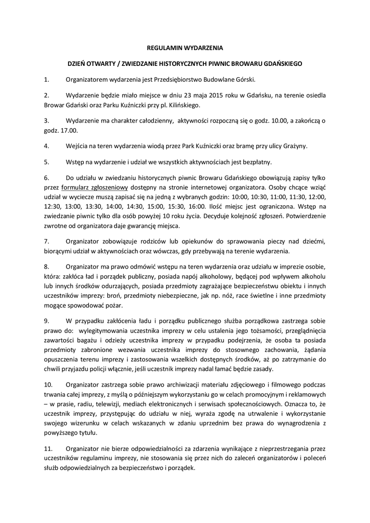 REGULAMIN WYDARZENIA DZIEŃ OTWARTY / ZWIEDZANIE HISTORYCZNYCH PIWNIC BROWARU GDAŃSKIEGO 1. Organizatorem wydarzenia jest Przedsiębiorstwo Budowlane Górski. 2. Wydarzenie będzie miało miejsce w dniu 23 maja 2015 roku w Gdańsku, na terenie osiedla Browar Gdański oraz Parku Kuźniczki przy pl. Kilińskiego. 3. Wydarzenie ma charakter całodzienny, aktywności rozpoczną się o godz. 10.00, a zakończą o godz. 17.00. 4. Wejścia na teren wydarzenia wiodą przez Park Kuźniczki oraz bramę przy ulicy Grażyny. 5. Wstęp na wydarzenie i udział we wszystkich aktywnościach jest bezpłatny. 6. Do udziału w zwiedzaniu historycznych piwnic Browaru Gdańskiego obowiązują zapisy tylko przez formularz zgłoszeniowy dostępny na stronie internetowej organizatora. Osoby chcące wziąć udział w wyciecze muszą zapisać się na jedną z wybranych godzin: 10:00, 10:30, 11:00, 11:30, 12:00, 12:30, 13:00, 13:30, 14:00, 14:30, 15:00, 15:30, 16:00. Ilość miejsc jest ograniczona. Wstęp na zwiedzanie piwnic tylko dla osób powyżej 10 roku życia. Decyduje kolejność zgłoszeń. Potwierdzenie zwrotne od organizatora daje gwarancję miejsca. 7. Organizator zobowiązuje rodziców lub opiekunów do sprawowania pieczy nad dziećmi, biorącymi udział w aktywnościach oraz wówczas, gdy przebywają na terenie wydarzenia. 8. Organizator ma prawo odmówić wstępu na teren wydarzenia oraz udziału w imprezie osobie, która: zakłóca ład i porządek publiczny, posiada napój alkoholowy, będącej pod wpływem alkoholu lub innych środków odurzających, posiada przedmioty zagrażające bezpieczeństwu obiektu i innych uczestników imprezy: broń, przedmioty niebezpieczne, jak np. nóż, race świetlne i inne przedmioty mogące spowodować pożar. 9. W przypadku zakłócenia ładu i porządku publicznego służba porządkowa zastrzega sobie prawo do: wylegitymowania uczestnika imprezy w celu ustalenia jego tożsamości, przeglądnięcia zawartości bagażu i odzieży uczestnika imprezy w przypadku podejrzenia, że osoba ta posiada przedmioty zabronione wezwania uczestnika imprezy do stosownego zachowania, żądania opuszczenia terenu imprezy i zastosowania wszelkich dostępnych środków, aż po zatrzymanie do chwili przyjazdu policji włącznie, jeśli uczestnik imprezy nadal łamać będzie zasady. 10. Organizator zastrzega sobie prawo archiwizacji materiału zdjęciowego i filmowego podczas trwania całej imprezy, z myślą o późniejszym wykorzystaniu go w celach promocyjnym i reklamowych – w prasie, radiu, telewizji, mediach elektronicznych i serwisach społecznościowych. Oznacza to, że uczestnik imprezy, przystępując do udziału w niej, wyraża zgodę na utrwalenie i wykorzystanie swojego wizerunku w celach wskazanych w zdaniu uprzednim bez prawa do wynagrodzenia z powyższego tytułu. 11. Organizator nie bierze odpowiedzialności za zdarzenia wynikające z nieprzestrzegania przez uczestników regulaminu imprezy, nie stosowania się przez nich do zaleceń organizatorów i poleceń służb odpowiedzialnych za bezpieczeństwo i porządek. 12. Organizator zastrzega sobie prawo do odwołania wydarzenia, zmiany jej programu i formuły – bez wcześniejszego uprzedzenia. Organizator nie będzie wobec uczestników zobowiązany do żadnej rekompensaty lub odszkodowania z tego tytułu. 13. Uczestnik wydarzenia ponosi pełną odpowiedzialność odszkodowawczą za szkody w mieniu lub na osobach organizatora (pracownikach i współpracownikach), wyrządzone przez niego lub osoby pozostające pod jego opieką. Odpowiedzialność w takim samym zakresie jak powyżej, tenże ponosi również wobec innych uczestników. 14. Uczestnik wydarzenia przyjmuje do wiadomości, że wstęp do budynku i na teren, gdzie odbywa się wydarzenie, jest równoznaczne z zaakceptowaniem tego regulaminu. Organizator Przedsiębiorstwo Budowlane Górski
