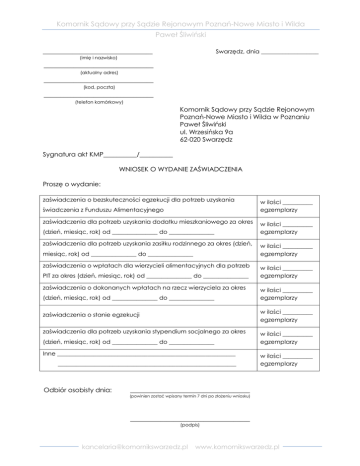 Komornik Sądowy przy Sądzie Rejonowym Poznań-Nowe Miasto i Wilda Paweł Śliwiński _________________________________ Swarzędz, dnia ___________________ (imię i nazwisko) _________________________________ (aktualny adres) _________________________________ (kod, poczta) _________________________________ (telefon komórkowy) Komornik Sądowy przy Sądzie Rejonowym Poznań-Nowe Miasto i Wilda w Poznaniu Paweł Śliwiński ul. Wrzesińska 9a 62-020 Swarzędz Sygnatura akt KMP__________/__________ WNIOSEK O WYDANIE ZAŚWIADCZENIA Proszę o wydanie: zaświadczenia o bezskuteczności egzekucji dla potrzeb uzyskania świadczenia z Funduszu Alimentacyjnego zaświadczenia dla potrzeb uzyskania dodatku mieszkaniowego za okres (dzień, miesiąc, rok) od _______________ do _______________ zaświadczenia dla potrzeb uzyskania zasiłku rodzinnego za okres (dzień, miesiąc, rok) od _______________ do _______________ zaświadczenia o wpłatach dla wierzycieli alimentacyjnych dla potrzeb PIT za okres (dzień, miesiąc, rok) od _______________ do _______________ zaświadczenia o dokonanych wpłatach na rzecz wierzyciela za okres (dzień, miesiąc, rok) od _______________ do _______________ w ilości __________ egzemplarzy w ilości __________ egzemplarzy w ilości __________ egzemplarzy w ilości __________ egzemplarzy w ilości __________ egzemplarzy zaświadczenia o stanie egzekucji w ilości __________ egzemplarzy zaświadczenia dla potrzeb uzyskania stypendium socjalnego za okres w ilości __________ egzemplarzy (dzień, miesiąc, rok) od _______________ do _______________ Inne ___________________________________________________________ ___________________________________________________________ Odbiór osobisty dnia: w ilości __________ egzemplarzy ____________________________________ (powinien zostać wpisany termin 7 dni po złożeniu wniosku) ____________________________________ (podpis) [email protected] www.komornikswarzedz.pl