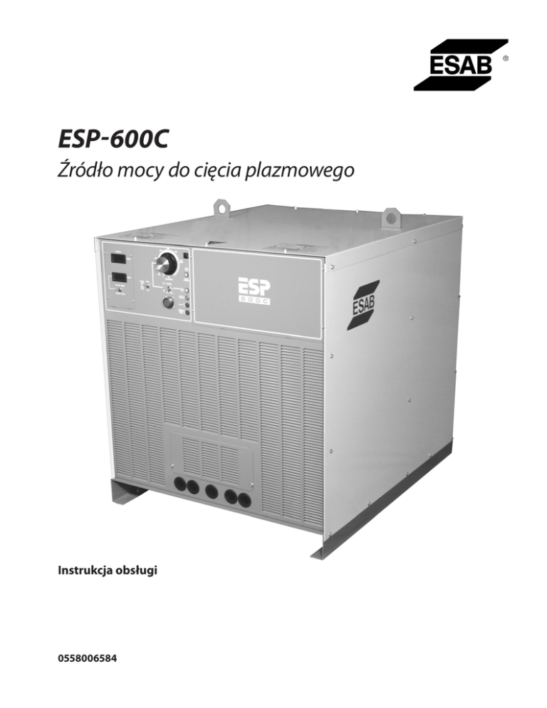 F-15-656 Jun., 2005 Installation, Operation, and Maintenance for the ESP-600C Plasma Source Źródło mocy do cięciaPower plazmowego ESP-600C Instrukcja obsługi 0558006584 Należy się upewnić, że operator otrzyma poniższe informacje. Można otrzymać dodatkowe kopie od dostawcy. przestroga Niniejsze INSTRUKCJE są przeznaczone dla doświadczonych operatorów. W przypadku niepełnego obeznania z zasadami działania oraz z praktykami bezpieczeństwa związanymi ze spawaniem łukowym oraz dotyczącymi sprzętu służącego do cięcia, wskazane jest przeczytanie naszej broszury „Środki oraz praktyki bezpieczeństwa podczas łukowego spawania, cięcia oraz żłobienia”, formularz 52-529. Osobom niewykwalifikowanym NIE zezwala się na instalowanie, obsługiwanie ani dokonywanie konserwacji niniejszego sprzętu. NIE wolno rozpoczynać instalacji lub pracy ze sprzętem bez uprzedniego przeczytania oraz całkowitego zrozumienia niniejszych instrukcji. W przypadku niecałkowitego zrozumienia niniejszych instrukcji, należy skontaktować się z dostawcą w celu uzyskania dalszych informacji. Przed rozpoczęciem instalacji lub pracy ze sprzętem należy zapoznać się ze Środkami ostrożności. ODPOWIEDZIALNOŚĆ UŻYTKOWNIKA Sprzęt ten będzie funkcjonował zgodnie z opisem zawartym w niniejszej instrukcji obsługi oraz zgodnie z dołączonymi etykietkami i/lub wkładkami jeśli instalacja, praca, konserwacja oraz naprawy przeprowadzane będą zgodnie z dostarczonymi instrukcjami. Sprzęt musi być okresowo sprawdzany. Nie należy używać sprzętu działającego wadliwie lub niewłaściwie konserwowanego. Części zepsute, brakujące, zużyte, odkształcone lub zanieczyszczone muszą być niezwłocznie wymienione. Producent zaleca wystosowanie telefonicznej lub pisemnej prośby o poradę do autoryzowanego dystrybutora, od którego został zakupiony sprzęt, czy naprawa lub wymiana części jest konieczna. Nie należy przerabiać całego sprzętu ani żadnej z jego części składowych bez uprzedniego pisemnego zezwolenia producenta. Użytkownik ponosi wyłączną odpowiedzialność za jakiekolwiek usterki spowodowane niewłaściwym użytkowaniem, wadliwą konserwacją, uszkodzeniem, niewłaściwą naprawą lub przeróbkami nie przeprowadzonymi przez producenta lub przez osoby przez niego wyznaczone. NALEŻY PRZECZYTAĆ ORAZ ZROZUMIEĆ INSTRUKCJĘ OBSŁUGI PRZED INSTALOWANIEM LUB PRACĄ. CHROŃ SIEBIE I INNYCH! spis treści Rozdział / Tytuł Strona 1.0 Środki ostrożności . . . . . . . . . . . . . . . . . . . . . . . . . . . . . . . . . . . . . . . . . . . . . . . . . . . . . . . . . . . . . . . . . . . . . . . . . . . . . . . . . . . 99 2.0 Opis . . . . . . . . . . . . . . . . . . . . . . . . . . . . . . . . . . . . . . . . . . . . . . . . . . . . . . . . . . . . . . . . . . . . . . . . . . . . . . . . . . . . . . . . . . . . . . . . 2.1 Wprowadzenie . . . . . . . . . . . . . . . . . . . . . . . . . . . . . . . . . . . . . . . . . . . . . . . . . . . . . . . . . . . . . . . . . . . . . . . . . . . . . . . . . 2.2 Specyfikacje ogólne . . . . . . . . . . . . . . . . . . . . . . . . . . . . . . . . . . . . . . . . . . . . . . . . . . . . . . . . . . . . . . . . . . . . . . . . . . . . 2.3 Wymiary i masa . . . . . . . . . . . . . . . . . . . . . . . . . . . . . . . . . . . . . . . . . . . . . . . . . . . . . . . . . . . . . . . . . . . . . . . . . . . . . . . . 101 101 101 102 3.0 Montaż . . . . . . . . . . . . . . . . . . . . . . . . . . . . . . . . . . . . . . . . . . . . . . . . . . . . . . . . . . . . . . . . . . . . . . . . . . . . . . . . . . . . . . . . . . . . . 103 3.1 Informacje ogólne . . . . . . . . . . . . . . . . . . . . . . . . . . . . . . . . . . . . . . . . . . . . . . . . . . . . . . . . . . . . . . . . . . . . . . . . . . . . . . 103 3.2 Rozpakowywanie . . . . . . . . . . . . . . . . . . . . . . . . . . . . . . . . . . . . . . . . . . . . . . . . . . . . . . . . . . . . . . . . . . . . . . . . . . . . . . . 103 3.3 Lokalizacja . . . . . . . . . . . . . . . . . . . . . . . . . . . . . . . . . . . . . . . . . . . . . . . . . . . . . . . . . . . . . . . . . . . . . . . . . . . . . . . . . . . . . 103 3.4 Podłączenia zasilania . . . . . . . . . . . . . . . . . . . . . . . . . . . . . . . . . . . . . . . . . . . . . . . . . . . . . . . . . . . . . . . . . . . . . . . . . . . 104 3.4.1 Zasilanie główne . . . . . . . . . . . . . . . . . . . . . . . . . . . . . . . . . . . . . . . . . . . . . . . . . . . . . . . . . . . . . . . . . . . . . . . . . 104 3.4.2 Przewody wejściowe . . . . . . . . . . . . . . . . . . . . . . . . . . . . . . . . . . . . . . . . . . . . . . . . . . . . . . . . . . . . . . . . . . . . . 105 3.4.3 Procedura podłączania przewodów zasilania . . . . . . . . . . . . . . . . . . . . . . . . . . . . . . . . . . . . . . . . . . . . . . 105 3.5 Podłączenia wyjściowe . . . . . . . . . . . . . . . . . . . . . . . . . . . . . . . . . . . . . . . . . . . . . . . . . . . . . . . . . . . . . . . . . . . . . . . . . 106 3.5.1 Przewody wyjściowe (dostarczone przez klienta) . . . . . . . . . . . . . . . . . . . . . . . . . . . . . . . . . . . . . . . . . . 106 3.5.2 Procedura podłączania przewodów wyjściowych . . . . . . . . . . . . . . . . . . . . . . . . . . . . . . . . . . . . . . . . . 107 3.6 Instalacja równoległa . . . . . . . . . . . . . . . . . . . . . . . . . . . . . . . . . . . . . . . . . . . . . . . . . . . . . . . . . . . . . . . . . . . . . . . . . . . 107 3.6.1 Podłączanie dwóch EPP-600C równolegle . . . . . . . . . . . . . . . . . . . . . . . . . . . . . . . . . . . . . . . . . . . . . . . . 108 3.7 Przewody interfejsu . . . . . . . . . . . . . . . . . . . . . . . . . . . . . . . . . . . . . . . . . . . . . . . . . . . . . . . . . . . . . . . . . . . . . . . . . . . . . 110 3.7.1 Przewody interfejsu CNC z dopasowanym 19-wtykowym przyłączem źródła mocy . . . . . . . . . . 111 4.0 Obsługa . . . . . . . . . . . . . . . . . .