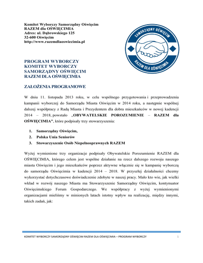 Komitet Wyborczy Samorządny Oświęcim RAZEM dla OŚWIĘCIMIA Adres: ul. Dąbrowskiego 125 32-600 Oświęcim http://www.razemdlaoswiecimia.pl PROGRAM WYBORCZY KOMITET WYBORCZY SAMORZĄDNY OŚWIĘCIM RAZEM DLA OŚWIĘCIMIA ZAŁOŻENIA PROGRAMOWE W dniu 11. listopada 2013 roku, w celu wspólnego przygotowania i przeprowadzenia kampanii wyborczej do Samorządu Miasta Oświęcim w 2014 roku, a następnie wspólnej dalszej współpracy z Radą Miasta i Prezydentem dla dobra mieszkańców w nowej kadencji 2014 – 2018, powstało „OBYWATELSKIE POROZUMIENIE – RAZEM dla OŚWIĘCIMIA”, które podpisały trzy stowarzyszenia: 1. Samorządny Oświęcim, 2. Polska Unia Seniorów 3. Stowarzyszenie Osób Niepełnosprawnych RAZEM Wyżej wymienione trzy organizacje podpisały Obywatelskie Porozumienie RAZEM dla OŚWIĘCIMIA, którego celem jest wspólne działanie na rzecz dalszego rozwoju naszego miasta Oświęcim i jego mieszkańców poprzez aktywne włącznie się w kampanię wyborczą do samorządu Oświęcimia w kadencji 2014 – 2018. W przyszłej działalności chcemy wykorzystać dotychczasowe doświadczenie zdobyte w naszej pracy. Mało kto wie, jak wielki wkład w rozwój naszego Miasta ma Stowarzyszenie Samorządny Oświęcim, kontynuator Oświęcimskiego Forum Gospodarczego. We współpracy z wyżej wymienionymi organizacjami mieliśmy w minionych latach istotny wpływ na realizację, między innymi, takich zadań, jak: KOMITET WYBORCZY SAMORZĄDNY OŚWIĘCIM RAZEM DLA OŚWIĘCIMIA – PROGRAM WYBORCZY 1 1. przywrócenie miastu Rynku Głównego, po wyburzeniu pochodzącego z okresu II wojny światowej poniemieckiego bunkra wraz z wybudowanym w latach 60-tych pawilonem handlowym „Tęcza”; 2. wywalczenie decyzji Rządu RP o utworzeniu i otwarciu Państwowej Wyższej Szkoły Zawodowej im. rtm. Witolda Pileckiego. (Bez naszego zaangażowania, a szczególnie naszego ówczesnego Prezydenta Miasta Janusza Marszałka, uczelnia ta na pewno by nie powstała); 3. powstanie nowoczesnej siedziby Miejskiej Biblioteki Publicznej z pozyskanych znacznych środków unijnych; 4. oddanie mieszkańcom do użytku 136 mieszkań w dwóch budynkach komunalnych na osiedlu Stare Stawy i dalszych 256 mieszkań w ramach Oświęcimskiego Towarzystwa Budownictwa Społecznego; 5. przebudowa zamku i średniowiecznej wieży zamkowej i powołanie do życia Muzeum Zamek w Oświęcimiu; 6. realizacja Miejskiej Strefy Aktywności Gospodarczej „Nowe Dwory” wraz z Inkubatorem Przedsiębiorczości; 7. otwarcie drogi dla budowy w Oświęcimiu kompleksów sportowych – popularnych „Orlików”; 8. częściowa rewitalizacja bulwarów nad Sołą, przebudowa Placu Ks. Skarbka oraz Kaplicy Hallerów; 9. termomodernizacja szkół i przedszkoli miejskich z pozyskanych w znacznej części środków zewnętrznych; 10. budowa sieci kanalizacyjnej Osiedla Dwory-Kruki z pozyskanych w znacznej części środków zewnętrznych. Zabiegaliśmy przez całe lata o przebudowanie wielu oświęcimskich ulic, chodników gminnych, ze szczególnym uwzględnieniem potrzeb osób niepełnosprawnych, matek z małymi dziećmi, a także o budowę osiedlowych parkingów, nowych dróg, m. in. ulic Chełmońskiego, Malczewskiego, Sadowej, Orląt Lwowskich. Zabiegaliśmy skutecznie o wykupienie obiektów sportowych: pływalni i lodowiska oraz Hotelu Olimpijskiego. Doprowadziliśmy do rozpoczęcia ich modernizacji, w pierwszej kolejności Hotelu Olimpijskiego, pod przyszłe centrum sportowo-rekreacyjno-konferencyjne. Międzynarodowe kontakty członka naszej Grupy, Prezydenta Miasta Janusza Marszałka w latach 2002 -2011 przełożyły się na wsparcie osób niepełnosprawnych w mieście i gminie KOMITET WYBORCZY SAMORZĄDNY OŚWIĘCIM RAZEM DLA OŚWIĘCIMIA – PROGRAM WYBORCZY 2 Oświęcim oraz wielu innych miastach. Pozyskiwany przez niego sprzęt rehabilitacyjny był nieodpłatnie przekazywany i nadal jest do oświęcimskiego szpitala powiatowego, Maltańskiej Służby Medycznej, jak również bezpośrednio mieszkańcom Oświęcimia, poprzez Miejski Ośrodek Pomocy Społecznej. Dowodem tego były, przeprowadzone w styczniu i w lipcu 2014 roku akcje nieodpłatnego przekazania dla potrzeb oświęcimskiego szpitala powiatowego wysokiej klasy łóżek z niemieckiej kliniki w Bad Berka w Turyngii. Te nasze działania dla dobra pacjentów szpitala, to efekt współpracy Janusza Marszałka z niemieckimi partnerami, w szczególności z Martinem Preussem z niemieckiej organizacji Malteser Hilfsdienst Amberg-Sulzbach oraz z policjantami z miasta Halberstadt w Saksonii-Anhalt. W efekcie tylko tych styczniowych i lipcowych działań zostały kompletnie wyposażone trzy oddziały wewnętrzne, a także inne oddziały oświęcimskiego szpitala w 276 łóżek specjalistycznych o wartości ponad 500 tys. złotych (zobacz film). Ponadto do Oświęcimia, a konkretnie do oświęcimskiego oddziału Maltańskiej Służby Medycznej, trafiły Mercedes Sprinter- profesjonalna karetka pogotowia ratunkowego, motocykl BMW do szybkiego transportu krwi, samochód VW-Bus do przewozu osób niepełnosprawnych. Sprzęt ten służy, na co dzień, mieszkańcom miasta, gminy Oświęcim i powiatu oświęcimskiego jak również pomaga w zabezpieczeniu imprez masowych. Na tym nie chcemy poprzestać i w latach następnej kadencji wyborczej 2014-2018 zamierzamy: Wspierać: realizację zadań wynikających ze Strategii Rozwoju Miasta Oświęcim na lata 2014-2020 realizację przedsięwzięć, generujących nowe miejsca pracy dla Mieszkańców Oświęcimia, szczególnie w branży turystycznej, hotelarskiej i gastronomicznej, działalność organizacji pozarządowych. KOMITET WYBORCZY SAMORZĄDNY OŚWIĘCIM RAZEM DLA OŚWIĘCIMIA – PROGRAM WYBORCZY 3 Inicjować: działania na rzecz pobudzania przedsiębiorczości i tworzenia nowych miejsc pracy, powstawanie spółdzielni socjalnych oraz innych form aktywności zawodowej osób pozostających bez pracy, działania grup obywatelskich w ramach R