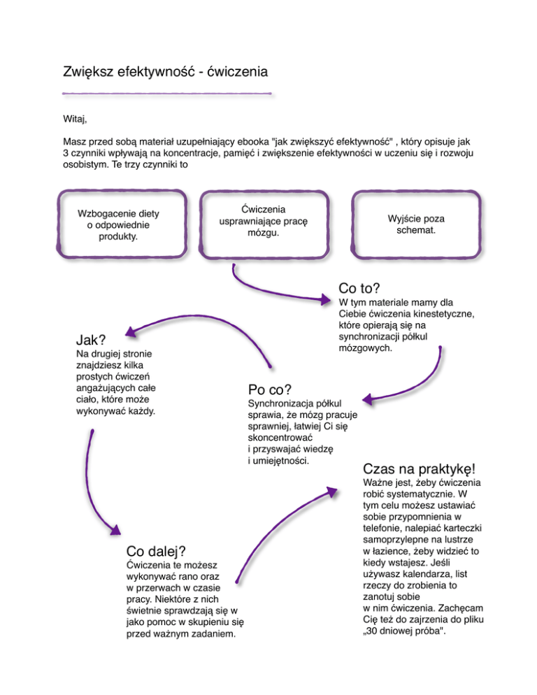 Zwiększ efektywność - ćwiczenia Witaj, Masz przed sobą materiał uzupełniający ebooka "jak zwiększyć efektywność" , który opisuje jak 3 czynniki wpływają na koncentracje, pamięć i zwiększenie efektywności w uczeniu się i rozwoju osobistym. Te trzy czynniki to Wzbogacenie diety o odpowiednie produkty. Ćwiczenia usprawniające pracę mózgu. Wyjście poza schemat. Co to? W tym materiale mamy dla Ciebie ćwiczenia kinestetyczne, które opierają się na synchronizacji półkul mózgowych. Jak? Na drugiej stronie znajdziesz kilka prostych ćwiczeń angażujących całe ciało, które może wykonywać każdy. Co dalej? Ćwiczenia te możesz wykonywać rano oraz w przerwach w czasie pracy. Niektóre z nich świetnie sprawdzają się w jako pomoc w skupieniu się przed ważnym zadaniem. Po co? Synchronizacja półkul sprawia, że mózg pracuje sprawniej, łatwiej Ci się skoncentrować i przyswajać wiedzę i umiejętności. Czas na praktykę! Ważne jest, żeby ćwiczenia robić systematycznie. W tym celu możesz ustawiać sobie przypomnienia w telefonie, nalepiać karteczki samoprzylepne na lustrze w łazience, żeby widzieć to kiedy wstajesz. Jeśli używasz kalendarza, list rzeczy do zrobienia to zanotuj sobie w nim ćwiczenia. Zachęcam Cię też do zajrzenia do pliku „30 dniowej próba". Leniwe ósemki Inaczej znak nieskończoności rysowany bardzo wolno najpierw kilka razy (5-7) ręką dominującą, potem podporządkowaną (tzn., że zaczynamy od tej ręki, którą piszemy), na końcu obiema rękami jednocześnie, zawsze zaczynając rysowanie ósemki od kierunku w lewo, w górę. Podczas wykonywania tego ćwiczenia wzrok zakotwiczony na ręce (rękach), która pracuje. Szczególną uwagę należy zwrócić na to, czy w którymkolwiek punkcie zakreślanej przestrzeni nie tracimy ręki z oczu. Może to być to być środek pola widzenia, góra, dół, któryś z boków. Jeśli tak się stanie, należy zwolnić tempo kreślenia ósemek i ewentualnie zmniejszyć zakres ruchu. Uwaga. Dzieci do 8 roku życia powinny wykonywać to ćwiczenie na odległość wyciągniętej ręki. Powyżej 8 roku życia ósemki wykonujemy na odległość łokcia. Słoń Jedną rękę podnosimy w górę, ramieniem zakrywamy szczelnie ucho, pochylamy się do przodu i poruszając tylko górną połową ciała wykonujemy jak najobszerniejsze leniwe ósemki pamiętając, że zaczynamy je zawsze od ruchu w lewo, w górę. Po kilku ósemkach, zmieniamy rękę i powtarzamy ćwiczenia. Możemy wykorzystać Słonia do zapamiętywania szczególnie trudnych słów z naszego lub obcego języka. Punkty przestrzeni Palce jednej ręki umieszczamy w połowie odległości między nosem, a górną wargą, drugą rękę umieszczamy z tylu ciała na kości krzyżowej (wzdłuż kręgosłupa). Oczy kierujemy w górę, uważając, żeby nie oddychać głowy. Ćwiczenie wykonujemy około 20/30s. Rysowanie oburącz Na płaszczyźnie ( może to być tablica, karton, zwykła kartka papieru, ale także podłoga, piasek na plaży itp.) wyznaczamy pionową oś symetrii na wprost naszego nosa i obiema rękami rysujemy jednocześnie symetryczne rysunki - wszystko, co spełnia warunek symetryczności jest dobre. Ćwiczenie wykonujemy przez kilka minut. Przy pewnej wprawie można je wykonywać także w powietrzu na wyobrażonej płaszczyźnie. Zachęcamy do codziennych ćwiczeń:) Zespół 3KM Zapraszamy na www.3km.pl