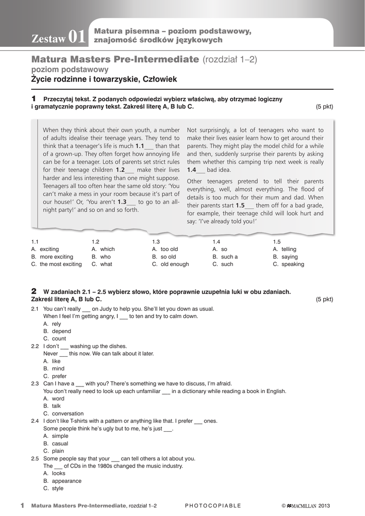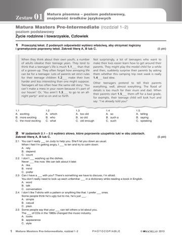 Zestaw 01 Matura pisemna – poziom podstawowy, znajomość środków językowych Matura Masters Pre-Intermediate (rozdział 1–2) poziom podstawowy Życie rodzinne i towarzyskie, Człowiek 1 Przeczytaj tekst. Z podanych odpowiedzi wybierz właściwą, aby otrzymać logiczny i gramatycznie poprawny tekst. Zakreśl literę A, B lub C. When they think about their own youth, a number of adults idealise their teenage years. They tend to think that a teenager’s life is much 1.1___ than that of a grown-up. They often forget how annoying life can be for a teenager. Lots of parents set strict rules for their teenage children 1.2___ make their lives harder and less interesting than one might suppose. Teenagers all too often hear the same old story: ‘You can’t make a mess in your room because it’s part of our house!’ Or, ‘You aren’t 1.3___ to go to an allnight party!’ and so on and so forth. 1.1 A. exciting B. more exciting C. the most exciting 1.2 A. which B. who C. what (5 pkt) Not surprisingly, a lot of teenagers who want to make their lives easier learn how to get around their parents. They might play the model child for a while and then, suddenly surprise their parents by asking them whether this camping trip next week is really 1.4___ bad idea. Other teenagers pretend to tell their parents everything, well, almost everything. The flood of details is too much for their mum and dad. When their parents start 1.5___ them off for a bad grade, for example, their teenage child will look hurt and say: ‘I’ve already told you!’ 1.3 A. too old B. so old C. old enough 1.4 A. so B. such a C. such 1.5 A. telling B. saying C. speaking 2 W zadaniach 2.1 – 2.5 wybierz słowo, które poprawnie uzupełnia luki w obu zdaniach. Zakreśl literę A, B lub C. (5 pkt) 2.1 You can’t really ___ on Judy to help you. She’ll let you down as usual. When I feel I’m getting angry, I ___ to ten and try to calm down. A. rely B. depend C. count 2.2 I don’t ___ washing up the dishes. Never ___ this now. We can talk about it later. A. like B. mind C. prefer 2.3 Can I have a ___ with you? There’s something we have to discuss, I’m afraid. You don’t really need to look up each unfamiliar ___ in a dictionary while reading a book in English. A. word B. talk C. conversation 2.4 I don’t like T-shirts with a pattern or anything like that. I prefer ___ ones. Some people think he’s ugly but to me, he’s just ___. A. simple B. casual C. plain 2.5 Some people say that your ___ can tell others a lot about you. The ___ of CDs in the 1980s changed the music industry. A. looks B. appearance C. style 1 Matura Masters Pre-Intermediate, rozdział 1–2 PHOTOCOPIABLE © 2013 Zestaw 01 Matura pisemna – poziom podstawowy, znajomość środków językowych 3 W zadaniach 3.1 – 3.5 spośród podanych opcji (A – C) wybierz tę, która najlepiej zastąpi zaznaczony fragment. Zakreśl literę A, B lub C. (5 pkt) 3.1 I can’t cook as well as my sister. A. My sister’s a better cook than me. B. I’m not a good cook and nor is my sister. A. Both my sister and I can cook very well. 3.2 We’re driving too slowly to get to the airport on time. A. We’re driving slowly enough B. We aren’t driving fast enough C. We’re driving too fast 3.3 I didn’t find the film at all frightening. A. I thought the film was very scary. B. I was scared during the film. C. I wasn’t frightened during the film. 3.4 She takes after her dad. A. looks like B. looks after C. gets on well with 3.5 When I get angry with her, she often answers me back. A. gives me good arguments. B. talks to me angrily. C. answers my questions. 4 Uzupełnij poniższe minidialogi (4.1–4.4), wybierając brakującą odpowiedź jednej z osób. Zakreśl literę A, B lub C. (4 pkt) 4.1 X:___ Y: Well, we have our ups and downs. But she’s OK most of the time? A. How are you getting on with your new flatmate? B. How did you find your new flatmate? C. How do you solve conflicts with your new flatmate? 4.2 X: Look at this mess! Why don’t you wash up? Y: ___. It’s definitely your turn today to do that! A. That sounds OK. B. You must be joking. C. I’ll do my best. 4.3 X: How often do you go to the cinema? Y: ___. I prefer watching DVDs at home. A. So often. B. Too much C. Very rarely. 4.4 X: It’s such nice weather today. ___. Y: I’m not sure. I’m rather tired. A: Do you go cycling? B. Why don’t we go cycling? C. Should I go cycling? 2 Matura Masters Pre-Intermediate, rozdział 1–2 PHOTOCOPIABLE © 2013