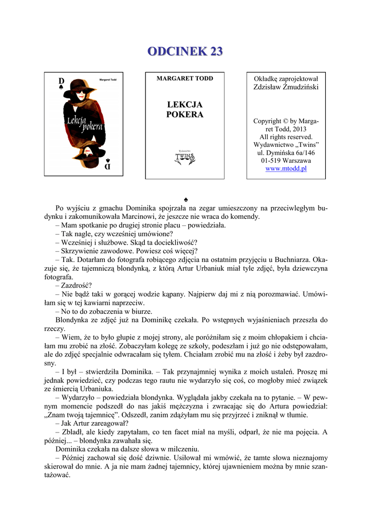 ODCINEK 23 MARGARET TODD Okładkę zaprojektował Zdzisław Żmudziński LEKCJA POKERA Copyright © by Margaret Todd, 2013 All rights reserved. Wydawnictwo „Twins” ul. Dymińska 6a/146 01-519 Warszawa www.mtodd.pl ♠ Po wyjściu z gmachu Dominika spojrzała na zegar umieszczony na przeciwległym budynku i zakomunikowała Marcinowi, że jeszcze nie wraca do komendy. – Mam spotkanie po drugiej stronie placu – powiedziała. – Tak nagle, czy wcześniej umówione? – Wcześniej i służbowe. Skąd ta dociekliwość? – Skrzywienie zawodowe. Powiesz coś więcej? – Tak. Dotarłam do fotografa robiącego zdjęcia na ostatnim przyjęciu u Buchniarza. Okazuje się, że tajemniczą blondynką, z którą Artur Urbaniuk miał tyle zdjęć, była dziewczyna fotografa. – Zazdrość? – Nie bądź taki w gorącej wodzie kąpany. Najpierw daj mi z nią porozmawiać. Umówiłam się w tej kawiarni naprzeciw. – No to do zobaczenia w biurze. Blondynka ze zdjęć już na Dominikę czekała. Po wstępnych wyjaśnieniach przeszła do rzeczy. – Wiem, że to było głupie z mojej strony, ale poróżniłam się z moim chłopakiem i chciałam mu zrobić na złość. Zobaczyłam kolegę ze szkoły, podeszłam i już go nie odstępowałam, ale do zdjęć specjalnie odwracałam się tyłem. Chciałam zrobić mu na złość i żeby był zazdrosny. – I był – stwierdziła Dominika. – Tak przynajmniej wynika z moich ustaleń. Proszę mi jednak powiedzieć, czy podczas tego rautu nie wydarzyło się coś, co mogłoby mieć związek ze śmiercią Urbaniuka. – Wydarzyło – powiedziała blondynka. Wyglądała jakby czekała na to pytanie. – W pewnym momencie podszedł do nas jakiś mężczyzna i zwracając się do Artura powiedział: „Znam twoją tajemnicę”. Odszedł, zanim zdążyłam mu się przyjrzeć i zniknął w tłumie. – Jak Artur zareagował? – Zbladł, ale kiedy zapytałam, co ten facet miał na myśli, odparł, że nie ma pojęcia. A później... – blondynka zawahała się. Dominika czekała na dalsze słowa w milczeniu. – Później zachował się dość dziwnie. Usiłował mi wmówić, że tamte słowa nieznajomy skierował do mnie. A ja nie mam żadnej tajemnicy, której ujawnieniem można by mnie szantażować. – Domyśla się pani, o co mogło chodzić? – Nie mam bladego pojęcia. Artura znałam z liceum, ale nawet nie byliśmy w jednej klasie. Zapytałam wtedy, czyzna tego faceta. Odpowiedział, że zobaczył go po raz pierwszy w życiu. – Uwierzyła mu pani? – Nie. Zbyt był wystraszony. Coś musiało być na rzeczy – z pełnym przekonaniem odpowiedziała dziewczyna. – Czy mogłaby pani jednak spróbować opisać człowieka, który twierdził, że zna jakąś tajemnicę Artura? To może być ważne. – Raczej wysoki, dobrze zbudowany, w średnim wieku, ciemne włosy, ubrany był w garnitur, ale nie pamiętam koloru. – Czy mógł to być którymś z tych mężczyzn? – Dominika wyłożyła na stoliku zdjęcia zrobione na przyjęciu. Dziewczyna brała każde po kolei i przyglądała się uważnie. – Trudno powiedzieć – zawyrokowała na końcu. – Szkoda – Dominika zgarnęła fotografie i włożyła do koperty. – A gdybym sobie coś przypomniała? – blondynka najwyraźniej należała do osób chętnych do współpracy. Dominika zostawiła jej wizytówkę. „Sęk w tym, że osoby tego pokroju lubią niekiedy konfabulować” – pomyślała. CDN Już teraz można zamówić całość wpłacając jedynie 20 zł na konto Nr: 50 1020 5558 1111 1115 9930 0019. Adres posiadacza konta to: Wydawnictwo TWINS; ul. Dymińska 6a/146; 01-519 Warszawa ([email protected]) i podając adres internetowy, na który e-booka należy przesłać.