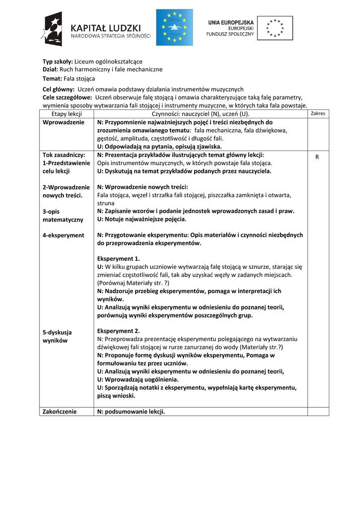 [Wpisz tekst] Typ szkoły: Liceum ogólnokształcące Dział: Ruch harmoniczny i fale mechaniczne Temat: Fala stojąca Cel główny: Uczeo omawia podstawy działania instrumentów muzycznych Cele szczegółowe: Uczeo obserwuje falę stojącą i omawia charakteryzujące taką falę parametry, wymienia sposoby wytwarzania fali stojącej i instrumenty muzyczne, w których taka fala powstaje. Zakres Etapy lekcji Czynności: nauczyciel (N), uczeo (U). Wprowadzenie N: Przypomnienie najważniejszych pojęd i treści niezbędnych do zrozumienia omawianego tematu: fala mechaniczna, fala dźwiękowa, gęstośd, amplituda, częstotliwośd i długośd fali. U: Odpowiadają na pytania, opisują zjawiska. Tok zasadniczy: N: Prezentacja przykładów ilustrujących temat główny lekcji: R 1-Przedstawienie Opis instrumentów muzycznych, w których powstaje fala stojąca. celu lekcji U: Dyskutują na temat przykładów podanych przez nauczyciela. 2-Wprowadzenie nowych treści. 3-opis matematyczny 4-eksperyment N: Wprowadzenie nowych treści: Fala stojąca, węzeł i strzałka fali stojącej, piszczałka zamknięta i otwarta, struna N: Zapisanie wzorów i podanie jednostek wprowadzonych zasad i praw. U: Notuje najważniejsze pojęcia. N: Przygotowanie eksperymentu: Opis materiałów i czynności niezbędnych do przeprowadzenia eksperymentów. Eksperyment 1. U: W kilku grupach uczniowie wytwarzają falę stojącą w sznurze, starając się zmieniad częstotliwośd fali, tak aby uzyskad węzły w zadanych miejscach. (Porównaj Materiały str. ?) N: Nadzoruje przebieg eksperymentów, pomaga w interpretacji ich wyników. U: Analizują wyniki eksperymentu w odniesieniu do poznanej teorii, porównują wyniki eksperymentów poszczególnych grup. 5-dyskusja wyników Eksperyment 2. N: Przeprowadza prezentację eksperymentu polegającego na wytwarzaniu dźwiękowej fali stojącej w rurze zanurzanej do wody (Materiały str.?) N: Proponuje formę dyskusji wyników eksperymentu, Pomaga w formułowaniu tez przez uczniów. U: Analizują wyniki eksperymentu w odniesieniu do poznanej teorii, U: Wprowadzają uogólnienia. U: Sporządzają notatki z eksperymentu, wypełniają kartę eksperymentu, piszą wnioski. Zakooczenie N: podsumowanie lekcji. [Wpisz tekst] Karta eksperymentu Temat eksperymentu Instrukcja wykonania Poprzeczna fala stojąca Do wykonania tego dwiczenia są potrzebne dwie osoby, można też przywiązad jeden z kooców długiego sznura nieruchomo do uchwytu . Dzielimy sznur na równe części (np. 3) zaznaczając odległości frotkami lub wstążkami i próbujemy potrząsając sznurem wytworzyd falę stojącą z węzłami w zaznaczonych miejscach. (Porównaj Materiały str. ?) Zwiększamy liczbę węzłów i powtarzamy doświadczenie. Obserwujemy, jak musi się zmienid częstotliwośd drgao wymuszających , aby uzyskad falę stojącą z większą liczbą węzłów. Na podstawie odległości między węzłami wyznaczamy długośd fali. Obserwacje (opisujemy w punktach przebieg eksperymentu: przyczyna skutek) Szacujemy błędy i niepewności pomiaru Wnioski (odniesienie do teorii) [Wpisz tekst] Karta eksperymentu Temat eksperymentu Instrukcja wykonania Dźwiękowa fala stojąca Przygotowujemy zestaw doświadczalny zgodnie z instrukcją w Materiałach str. ?. Zanurzamy koniec rury pionowo w pojemniku z wodą. Do drugiego kooca rury przystawiamy głośnik wydający czysty dźwięk. Zmieniamy zanurzenie rury, do momentu, aż usłyszymy wzmocnienie dźwięku. Sprawdzamy na ilu głębokościach występuje zjawisko wzmocnienia dźwięku . Mierzymy odległośd pomiędzy kolejnymi wzmocnieniami. Wyznaczamy częstotliwośd dźwięku emitowanego z głośnika, korzystając z prędkości dźwięku znalezionej w tablicach i swoich pomiarów. Obserwacje (opisujemy w punktach przebieg eksperymentu: przyczyna skutek) Szacujemy błędy i niepewności pomiaru Wnioski (odniesienie do teorii)