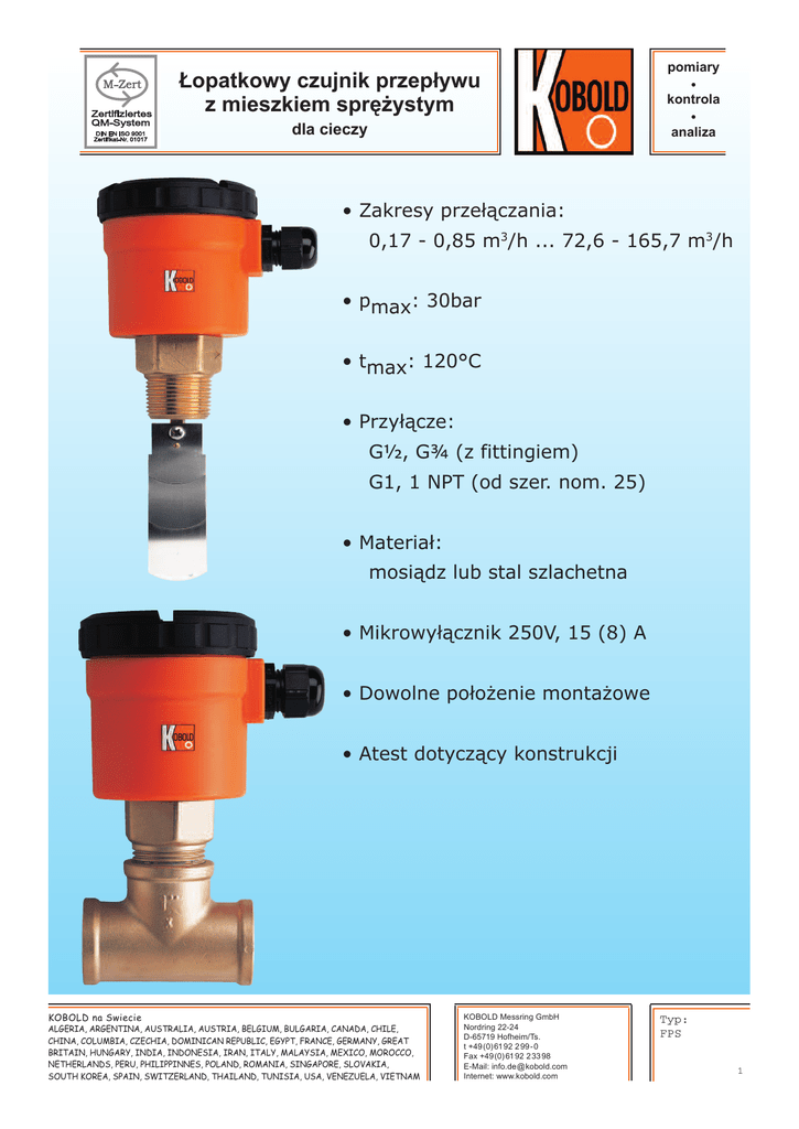 Łopatkowy czujnik przepływu z mieszkiem sprężystym dla cieczy pomiary • kontrola • analiza • Zakresy przełączania: 0,17 - 0,85 m3/h ... 72,6 - 165,7 m3/h • pmax: 30bar • tmax: 120°C • Przyłącze: G½, G¾ (z fittingiem) G1, 1 NPT (od szer. nom. 25) • Materiał: mosiądz lub stal szlachetna • Mikrowyłącznik 250V, 15 (8) A • Dowolne położenie montażowe • Atest dotyczący konstrukcji KOBOLD na Swiecie ALGERIA, ARGENTINA, AUSTRALIA, AUSTRIA, BELGIUM, BULGARIA, CANADA, CHILE, CHINA, COLUMBIA, CZECHIA, DOMINICAN REPUBLIC, EGYPT, FRANCE, GERMANY, GREAT BRITAIN, HUNGARY, INDIA, INDONESIA, IRAN, ITALY, MALAYSIA, MEXICO, MOROCCO, NETHERLANDS, PERU, PHILIPPINNES, POLAND, ROMANIA, SINGAPORE, SLOVAKIA, SOUTH KOREA, SPAIN, SWITZERLAND, THAILAND, TUNISIA, USA, VENEZUELA, VIETNAM KOBOLD Messring GmbH Nordring 22-24 D-65719 Hofheim/Ts. t +49 (0) 61 92 2 99 - 0 Fax +49 (0) 61 92 2 33 98 E-Mail: [email protected] Internet: www.kobold.com Typ: FPS 1 Łopatkowy czujnik przepływu z mieszkiem sprężystym dla cieczy Opis Czujnik przepływu FPS firmy KOBOLD pracuje według sprawdzonej zasady działania łopatkowego mieszka sprężystego. Przepływające medium naciska na łopatkę i uruchamia mikrowyłącznik. Wymienne łopatki - w połączeniu z dodatkowo występującą moliwością regulacji - gwarantują duży zakres regulacji punktu przełączenia i dodatkowo - dopasowanie przyrządu do różnych szerokości nominalnych rury. Mieszek sprężysty hermetycznie oddziela elektryczną część przyrządu od strefy mokrej. W wersji specjalnej czujnik przepływu zaprojektowany jest dla bardzo niskich wartości przełączania. Wartości przełączania umieszczone są w tabeli. Przyrządy montowane są w dowolnym położeniu. Dane techniczne Wersja z mosiądzu: MS 58, mieszek z brązu, łopatka ze stali szlach. 1.4401 kształtka T: stal ocynkowana Wersja ze stali szlachetnej: stal szlachetna 1.4541, łopatka ze stali szlach. 1.4401 Maks. temp. medium: Maks. temp. otoczenia: -40…+120 °C -35...+65 °C Maks. dopuszczalne cinienie: mosiądz 11 bar, stal szlachetna 30 bar Maks. strata ciśnienia: ok. 0,01-0,03 bar Wymiary app. 138 app. 25 Odcinek wlotowy i wylotowy: 5-krotność szer. nom. rury Dane elektryczne Mikrowyłącznik osłonięty przed kurzem jako przełącznik jednobiegunowy 120 66 FPS-1115: app. 152 FPS-1120: app. 156 69 G 1/2 G 3/4 89 60 34 R1 Napięcie przełączania: maks. 24-250 VAC Prąd przełączania: maks. 8A (obciążenie indukcyjne) maks. 15 A (obciążenie omowe) Obudowa: ABS Rodzaj ochrony: IP 65 Atest konstrukcji: VdTUV- Arkusz Przepływ 100 Przyłącze elektryczne CZERWONO -BIAŁY otwiera przy spadku przepływu CZERWONO - NIEBIESKI zamyka przy spadku przepływu 167 29 Aplikacje • do kontroli obiegów chłodniczych, smarowniczych • jako ochrona przed prac pomp na sucho • jako bezpiecznik niedoboru wody 29 Dane przy zamówieniu (przykład zamówienia: FPS-1115) Szerokość nominalna rury Specjalny zakres przełączania Standardowy zakres przełączania m /h wody opadający m /h wody narastający 25 * 0,6 - 2 32 40 Numer zamówienia m /h wody opadający m3/h wody narastający 1 - 2,1 0,2 - 1 0,6 - 1,1 0,8 - 2,8 1,3 - 3 0,25 - 1,4 0,9 - 1,6 1,1 - 3,7 1,7 - 4 0,5 - 1,6 1,2 - 2,2 50 2,2 - 5,7 3,1 - 6,1 0,9 - 3,6 2,3 - 4,1 65 2,7 - 6,5 4,0 - 7,0 1,2 - 4,9 3,1 - 5,5 80 3 3 Mosiądz FPS-2100 (przył.: G1) 4,3 - 10,7 6,2 - 11,4 11,4 - 27,7 (6,1 - 17,3) 22,9 - 53,3 (9,3 - 25,2) 35,9 - 81,7 (12,3 - 30,6) 72,6 - 166,7 (38,6 - 90,8) 14,7 - 29,0 (8,0 - 18,4) 28,4 - 55,6 (12,9 - 26,8) 43,1 - 85,1 (16,8 - 32,7) 85,1 - 172,5 (46,5 - 94,2) l/h wody l/h wody 15 174 - 846 480 - 948 FPS-1115 20 138 - 768 408 - 858 FPS-1120 100 125 150 200 Stal szlachetna FPS-2100 (przył.: G1) FPS-5100 FPS-5100 (przył.: 1NPT) (przył.: 1NPT) 3 2,1 - 7,4 4,9 - 8,2 4,9 - 17,1 (3,3 - 11,6) 9,7 - 34,0 (5,0 - 17,5) 13,6 - 47,6 (6,1 - 21,4) 25,7 - 90,1 (21,7 - 55,3) 11,3 - 19,1 (7,7 - 13,0) 22,4 - 37,9 (11,5 - 19,6) 31,5 - 53,2 (14,1 - 23,9) 59,6 - 100,7 (36,5 - 61,8) Numer zamówienia Mosiądz Stal szlachetna FPS-3100 (przył.: G1) FPS-3200 (przył.: G1) FPS-6100 FPS-6200 (przył.: 1NPT) (przył.: 1NPT) * W DN25 musi być zastosowany Fitting, w którym łopatka może się swobodnie poruszać. Wartości w nawiasach obowiązują przy zastosowaniu dostarczonej długiej łopatki, która przy użyciu w szerokościach nominalnych 100 do 150 jest odpowiednio skracana i musi być zamontowana razem z trzema krótkimi łopatkami. KOBOLD na Swiecie ALGERIA, ARGENTINA, AUSTRALIA, AUSTRIA, BELGIUM, BULGARIA, CANADA, CHILE, CHINA, COLUMBIA, CZECHIA, DOMINICAN REPUBLIC, EGYPT, FRANCE, GERMANY, GREAT BRITAIN, HUNGARY, INDIA, INDONESIA, IRAN, ITALY, MALAYSIA, MEXICO, MOROCCO, NETHERLANDS, PERU, PHILIPPINNES, POLAND, ROMANIA, SINGAPORE, SLOVAKIA, SOUTH KOREA, SPAIN, SWITZERLAND, THAILAND, TUNISIA, USA, VENEZUELA, VIETNAM KOBOLD Messring GmbH Nordring 22-24 D-65719 Hofheim/Ts. t +49 (0) 61 92 2 99 - 0 Fax +49 (0) 61 92 2 33 98 E-Mail: [email protected] Internet: www.kobold.com Typ: FPS 2