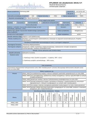 SYLABUS rok akademicki 2016/17 Wydział Ekonomiczny Uniwersytet Gdański Nazwa przedmiotu Marketing B2B Jednostka prowadząca przedmiot Nazwisko prowadzącego IHZ Nazwa kierunku MSG Kod ECTS 14.3.E.SL.427 Pkt.ECTS 2 Nazwa specjalności MSM; dr Marcin Skurczyński Forma zajęć/Liczba godzin Wykład 0 Ćwiczenia 0 Konwersatoria 20 Laboratoria komputerowe Forma aktywności Sumaryczna liczba godzin: 0 0 Lektoraty Rok i rodzaj studiów: 1 NS2, 2 NS2-3, Semestr: 2, 4, Status przedmiotu: Obligatoryjny Język wykładowy: polski Godziny z udziałem nauczyciela akademickiego (w tym konsultacje, egzaminy i inne): Godziny bez udziału nauczyciela akademickiego (samodzielna praca studenta): Seminaria 0 Sposób realizacji zajęć Zajęcia w sali dydaktycznej. Metody dydaktyczne Wykłady z prezentacjami multimedialnymi, Dyskusja na zajęciach konwersatoryjnych, Projekty indywidualne, Określenie przedmiotów wprowadzających wraz z wymogami wstępnymi Wymagania formalne Wymagania wstepne Marketing Międzynarodowy Znajomości realiów marketingu międzynarodowego, zastosowania narzędzi zarządzania marketingowego i podstaw przedsiębiorczości Sposób i forma zaliczenia oraz kryteria oceny Sposób zaliczenia Zaliczenie na ocenę Kryteria oceny 1. Realizacja mikro studiów przypadku - 3 zadania, 40% oceny 2. Realizacja projektu semestralnego - 60% oceny Cele przedmiotu Zrozumienie mechanizmów funkcjonowania rynku dóbr inwestycyjnych i procesu decyzyjnego dokonywania zakupów przez firmy na rynku B2B Efekty kształcenia się Wiedza MSG2_W03 ma podstawową wiedzę o różnych rodzajach podmiotów gospodarczych na rynku B2B MSG2_W04 ma uporządkowaną, podstawową wiedzę szczegółową z zakresu specyfiki B2B na rynkach międzynarodowych MSG2_W06 dysponuje wiedzą z zakresu funkcjonowania przedsiębiorstwa na rynku b2b MSG2_W10 posiada podstawową wiedzę o gospodarce światowej i międzynarodowych stosunkach gospodarczych i relacjach występujących na rynkach dóbr inwestycyjnych MSG2_W14 ma wiedzę z zakresu zarządzania podmiotem konkurującym na rynku instytucjonalnym MSG2_W15 posiada wiedzę dotyczącą podmiotów występujących na rynku B2B, zarówno w otoczeniu krajowym, jak i międzynarodowym Weryfikacja efektów kształcenia - Wiedza Efekty MSG2_W03 MSG2_W04 Wszystkie prawa zastrzeżone (c) Marcin Skurczyński X X 1/3 SYLABUS rok akademicki 2016/17 Wydział Ekonomiczny Uniwersytet Gdański MSG2_W06 X MSG2_W10 X X MSG2_W14 X MSG2_W15 Umiejętności X X MSG2_U01 potrafi prawidłowo interpretować zjawiska ekonomiczne zachodzące na rynku dóbr inwestycyjnych, analizować zachodzące zjawiska i wyciągać wnioski MSG2_U03 potrafi interpretować zjawiska zachodzące we współczesnej gospodarce światowej i ich wpływ na branżowe rynki dóbr inwestycyjnych MSG2_U06 potrafi wykorzystywać wiedzę do rozstrzygania dylematów związanych z zarządzaniem organizacją na rynku B2B MSG2_U08 umie wykorzystywać metody i narzędzia do gromadzenia danych w celu diagnozowania procesów na rynku B2B MSG2_U10 potrafi wykorzystywać podstawowe programy komputerowe do analizy danych niezbędnych w procesie planowania strategicznego MSG2_U12 potrafi zawierać i realizować transakcje handlowe na rynku B2B MSG2_U15 posiada umiejętność przygotowywania prezentacji z wykorzystaniem zróżnicowanych źródeł branżowych, dotyczących tematów powiązanych z funkcjonowaniem organizacji na konkurencyjnym rynku dóbr inwestycyjnych Weryfikacja efektów kształcenia - Umiejętności Efekty MSG2_U01 X MSG2_U03 X X MSG2_U06 X X MSG2_U08 X X MSG2_U10 X MSG2_U12 X MSG2_U15 Kompetencje X MSG2_K01 zna ograniczenia własnej wiedzy i umiejętności, rozumie potrzebę uzupełniania wiedzy z zakresu marketingu B2B i wykorzystania jej do dalszego rozwoju MSG2_K03 potrafi określić priorytety dotyczące działań realizowanych w ramach planowanych działań dotyczących funkcjonowania firmy na rynku B2B i skutecznie komunikuje się z otoczeniem MSG2_K05 potrafi efektywnie uczestniczyć w podejmowaniu i realizowaniu grupowych zadań projektowych dotyczących przedsiębiorstw na rynkach instytucjonalnych MSG2_K06 potrafi myśleć i działać w sposób przedsiębiorczy w warunkach konkurencji na rynku B2B Weryfikacja efektów kształcenia - Kompetencje Efekty MSG2_K01 X MSG2_K03 X X X MSG2_K05 X MSG2_K06 X Wszystkie prawa zastrzeżone (c) Marcin Skurczyński 2/3 SYLABUS rok akademicki 2016/17 Wydział Ekonomiczny Uniwersytet Gdański Treści programowe 1. Specyfika marketingu dóbr i usług przemysłowych 1.1. Wstęp - specyfika marketingu B2B 1.2. Rynki towarów konsumpcyjnych a rynki towarów przemysłowych 1.3. Charakter popytu na rynku towarów przemysłowych 1.4. Różnice pomiędzy marketingiem konsumpcyjnym a marketingiem b2b 1.5. Rodzaje klientów rynku towarów i usług przemysłowych 1.6. Klasyfikacja towarów i usług przemysłowych i odpowiadające im strategie marketingowe 1.7. Procesy zachodzące w przedsiębiorstwach działających na rynku B2B 2. Zasady organizowania zakupów przez zorganizowanego nabywcę 2.1. Proces zakupów w przedsiębiorstwach handlowych 2.2. Rola wielkości przedsiębiorstwa 2.3. Znaczenie lokalizacji 2.4. Procedury zakupów 2.5. Gospodarka materiałowa 2.6. Proces zakupów w jednostkach i instytucjach budżetowych - zamówienia publiczne 3. Znaczenie relacji ze zorganizowanym nabywcą 3.1. Co to jest centrum zakupów organizacji i jaka jest jego rola 3.2. Różny przebieg procesu zakupu i jego uwarunkowania 3.3. Sposoby oceny dostawców przez nabywcę zorganizowanego 3.4. Powiązania - typy powiązań ze względu na intensyfikację współpracy 4. Zachowanie nabywcze organizacji 4.1. Siły oddziałujące na zachowanie nabywcze organizacji 4.2. Siły otoczenia, Siły organizacji, Siły grupowe, Siły indywidualne 4.3. Rola informacji w procesach zakupowych 4.4. Główne elementy procesu zakupu w organizacji 4.5. Zachowanie nabywcze organizacji - podstawa dla stworzenia strategii marketingo