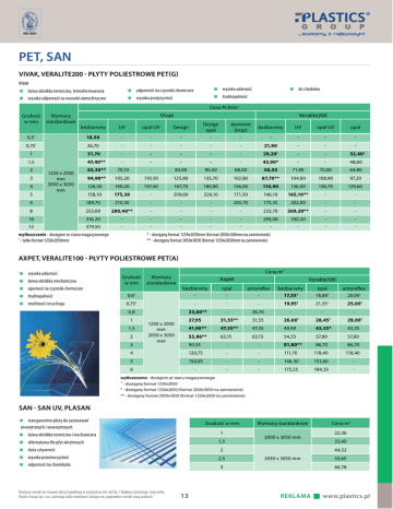 PET, SAN VIVAK, VERALITE200 - PŁYTY POLIESTROWE PET(G) VIVAK łatwa obróbka termiczna, termoformowanie odporność na czynniki chemiczne wysoka odporność na warunki atmosferyczne wysoka przejrzystość wysoka udarność do sitodruku trudnopalność Cena PLN/m2 Grubość w mm Vivak Wymiary standardowe Veralite200 0,5 18,50 - - - Design opal - - - - 0,751 26,70 - - - - - 21,90 - - 1 31,70 - - - - - 29,201 47,40** - - - - - 43,90* - - bezbarwny UV opal UV Design 1 1,5 2 3 4 1250 x 2050 mm 2050 x 3050 mm dymione (brąz) - bezbarwny UV opal UV opal 32,401 48,60 63,30** 70,10 - 83,90 90,50 68,00 58,50 71,90 75,00 64,80 94,90** 105,20 110,50 125,80 135,70 102,80 87,70** 104,00 108,90 97,20 126,50 140,20 147,40 167,70 180,90 136,00 116,90 136,00 138,70 129,60 158,10 175,30 - 209,60 226,10 171,50 146,10 165,10** - - 6 189,70 210,30 - - - 205,70 175,35 202,00 - - 8 253,00 280,40** - - 269,20** - - 10 316,20 - - - 12 379,50 - - - 5 wytłuszczenie - dostępne ze stanu magazynowego 1 - tylko format 1250x2050mm * Dostępne-tylko w wymiarze mm. - 1250 x 2050 233,70 ** Dostępne w wymiarze 2050 x 3050 mm . - - 293,00 330,20 - - - - - - - - * - dostępny format 1250x2050mm (format 2050x300mm na zamówienie) ** - dostępny format 2050x3050 (format 1250x2050mm na zamówienie) AXPET, VERALITE100 - PŁYTY POLIESTROWE PET(A) wysoka udarność łatwa obróbka mechaniczna Cena m2 Grubość w mm Wymiary standardowe oporność na czynniki chemiczne Axpet Veralite100 trudnopalność 0,61 bezbarwny - opal - antyreflex - bezbarwny 17,551 opal 18,801 antyreflex 20,001 możliwość recyclingu 0,751 - - - 19,951 21,351 25,001 - 26,70 - - 23,60** 0,8 1 1,5 2 1250 x 2050 mm 2050 x 3050 mm - 27,95 31,55** 31,55 26,60 28,45 28,001 41,90** 47,35** 47,35 40,90 43,35* 43,35 55,86** 63,15 63,15 54,55 57,80 57,80 1 1 90,55 - - 81,80** 86,70 86,70 4 120,75 - - 111,70 118,40 118,40 5 150,95 - - 146,30 153,60 - 6 - - - 175,55 184,35 - 3 wytłuszczone - dostępne ze stanu magazynowego 1 - dostępny format 1250x2050 * - dostępny format 1250x2050 (format 2050x3050 na zamówienie) ** - dostępny format 2050x3050 (format 1250x2050 na zamówienie) SAN - SAN UV, PLASAN transparentne płyty do zastosowań zewnętrznych i wewnętrznych Grubość w mm 1 łatwa obróbka termiczna i mechaniczna alternatywa dla płyt akrylowych 1,5 duża sztywność 2000 x 3050 mm 2 wysoka przeźroczystość 2,5 odporność na chemikalia 3 Niniejszy cennik nie stanowi oferty handlowej w rozumieniu Art. 66 Par. 1 Kodeksu Cywilnego. Ceny netto. Plastics Group Sp. z o.o. zastrzega sobie możliwość zmiany cen, poprzednie cenniki tracą ważność. Wymiary standardowe 13 Cena m2 22,26 33,40 44,52 2030 x 3050 mm 55,65 66,78 REKLAMA www.plastics.pl