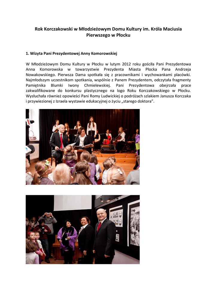 Rok Korczakowski w Młodzieżowym Domu Kultury im. Króla Maciusia Pierwszego w Płocku 1. Wizyta Pani Prezydentowej Anny Komorowskiej W Młodzieżowym Domu Kultury w Płocku w lutym 2012 roku gościła Pani Prezydentowa Anna Komorowska w towarzystwie Prezydenta Miasta Płocka Pana Andrzeja Nowakowskiego. Pierwsza Dama spotkała się z pracownikami i wychowankami placówki. Najmłodszym uczestnikom spotkania, wspólnie z Panem Prezydentem, odczytała fragmenty Pamiętnika Blumki Iwony Chmielewskiej. Pani Prezydentowa obejrzała prace zakwalifikowane do konkursu plastycznego na logo Roku Korczakowskiego w Płocku. Wysłuchała również opowieści Pani Romy Ludwickiej o podróżach szlakiem Janusza Korczaka i przywiezionej z Izraela wystawie edukacyjnej o życiu „starego doktora”. 2. Konkurs na Logo Roku Korczakowskiego Rok Korczakowski miał w Płocku swoje własne logo. Jury wybrało je spośród blisko 60 prac, które wpłynęły na konkurs plastyczny dla młodzieży. Z okazji obchodzonego w całym kraju roku Janusza Korczaka także w Młodzieżowym Domu Kultury w Płocku zaplanowano szereg imprez. Pierwszą z nich było właśnie rozstrzygnięcie konkursu na logo, które odbyło się 14 lutego 2012 toku. Logo, które jury uznało za najlepsze, można było podziwiać np. na plakatach, stronie internetowej czy materiałach promocyjnych Młodzieżowego Domu Kultury. Laureatką konkursu została Małgorzata Ziemkiewicz – uczennica I Prywatnego Liceum Plastycznego w Płocku. Prace uczestników konkursu były prezentowane w Biurze Rzecznika Praw Dziecka w warszawie. Zachodniopomorski Kurator Oświaty p. Maria Borecka wystąpiła o zgodę na wykorzystanie loga podczas imprez tematycznych organizowanych przez Kuratorium Oświaty w Szczecinie. Logo, które jury uznało za najlepsze. 3. O przygodach małego Dżeka 15 maja 2012 roku odbyła się 48 premiera w 18 roku tworzenia według książki Janusza Korczaka „Bankructwo małego Dżeka” w wykonaniu Muzycznego Teatru Młodych Biała Mandragora pod opieką Romy Ludwickiej. 4. Trzynaście bijących serc Premiera Grupy Teatralnej Spod Znaku Króla Maciusia według „Pamiętnika Blumki” pod kierunkiem Romy Ludwickiej. 22 maja 2012 r. 5. Spotkanie z Iwoną Chmielewską autorką i ilustratorką książki „Pamiętnik Blumki”. To niesamowita książka, której bohaterką jest dziewczynka mieszkająca w sierocińcu prowadzonym przez Korczaka. Z jej relacji można się wiele dowiedzieć, jak czuły się tam dzieci. To ważna lektura dla młodych rodziców. Spotkanie z autorką odbyło się 20 września 2012 roku. 6. Konkurs Plastyczny „Ja i Król Maciuś Pierwszy”. Rozstrzygnięcie konkursu odbyło się 23 listopada 2012 r. Konkurs popularyzuje twórczość Janusza Korczaka, przybliża postać patrona naszej placówki, stwarza możliwość konfrontacji osiągnięć dzieciom i młodzieży uzdolnionym w dziedzinie sztuk plastycznych. 7. Miłość Przedstawienie przygotowane przez Grupę Teatralną Dzieci Awangardy na podstawie tekstów ze słuchowiska Janusza Korczaka. Przedstawieniu towarzyszyła wystawa, która przedstawiała sceny z życia dzieci i Janusza Korczaka podczas wakacji w Mężeninie. 8. Król Maciuś w Katolickim Radiu Płock Znani Płocczanie czytali fragmenty Króla Maciusia na antenie Katolickiego Radia Płock. Projekt połączony był z nagrodami dla słuchaczy. 9. W dniach 8 – 20 listopada 2012 roku w Młodzieżowym Domu Kultury gościliśmy wystawę Książnicy Płockiej, która poświęcona była Januszowi Korczakowi, jego życiu i twórczości. 10. W dniach 12 – 14 listopada 2012 roku odbywały się XXVI Ogólnopolskie Interdyscyplinarne Warsztaty Artystyczne "Mistrz i Uczeń". Warsztaty, zgodnie z tradycją przebiegały pod hasłem wspólnego tworzenia nauczycieli i uczniów. Z uwagi na obchody roku korczakowskiego, podczas warsztatów powstała etiuda inspirowana życiem i twórczością Janusza Korczaka. Podczas finałowej prezentacji gościliśmy w naszej placówce Rzecznika Praw Dziecka, Pana Marka Michalaka. 11. Ogólnopolski Konkurs Poetycki im. Janusza Korczaka dla uczniów szkół podstawowych od kl. IV oraz gimnazjów. Konkurs corocznie stwarza dzieciom i młodzieży okazję do podzielenia się swoim postrzeganiem rzeczywistości, pozwala ujawnić swoją wrażliwość na świat i słowo. Adresowany do najmłodszych adeptów pióra, daję szansę odkrywania i rozwijania talentów, jest też okazją do popularyzacji dziecięcej twórczości poetyckiej.