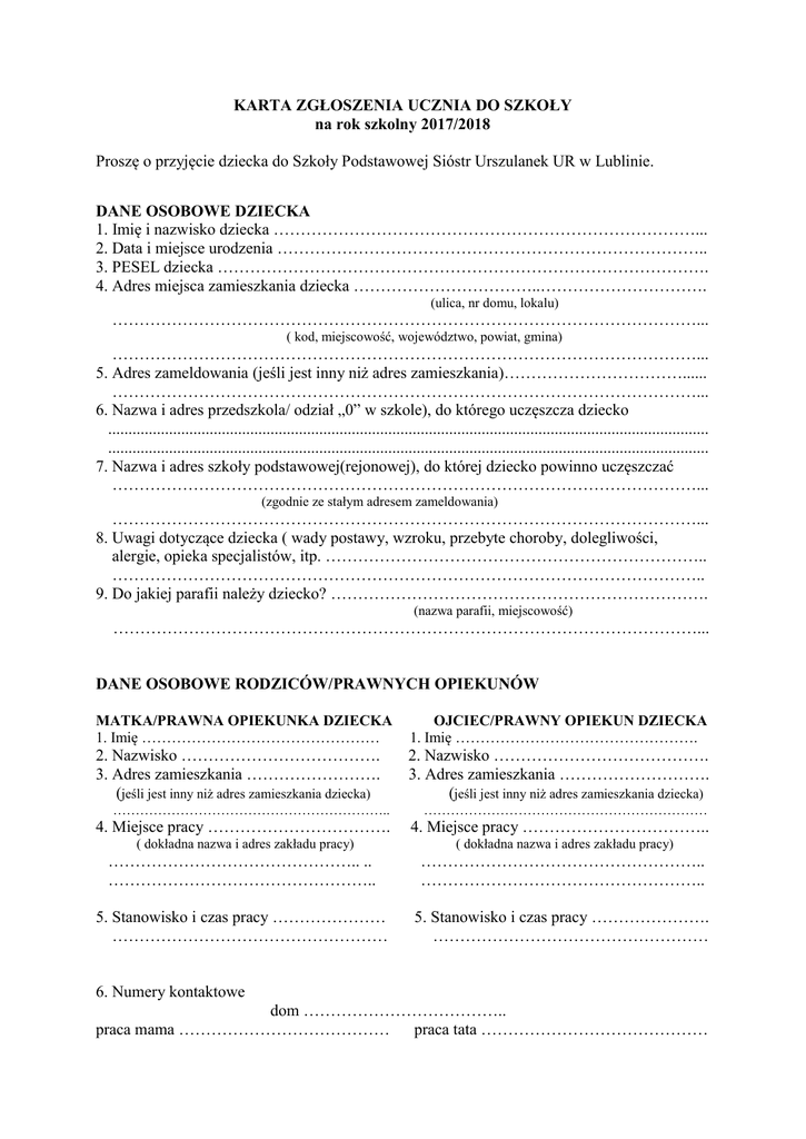 KARTA ZGŁOSZENIA UCZNIA DO SZKOŁY na rok szkolny 2017/2018 Proszę o przyjęcie dziecka do Szkoły Podstawowej Sióstr Urszulanek UR w Lublinie. DANE OSOBOWE DZIECKA 1. Imię i nazwisko dziecka ……………………………………………………………………... 2. Data i miejsce urodzenia …………………………………………………………………….. 3. PESEL dziecka ………………………………………………………………………………. 4. Adres miejsca zamieszkania dziecka ……………………………..…………………………. (ulica, nr domu, lokalu) ………………………………………………………………………………………………... ( kod, miejscowość, województwo, powiat, gmina) ………………………………………………………………………………………………... 5. Adres zameldowania (jeśli jest inny niż adres zamieszkania)……………………………...... ………………………………………………………………………………………………... 6. Nazwa i adres przedszkola/ odział „0” w szkole), do którego uczęszcza dziecko .................................................................................................................................................... .................................................................................................................................................... 7. Nazwa i adres szkoły podstawowej(rejonowej), do której dziecko powinno uczęszczać ………………………………………………………………………………………………... (zgodnie ze stałym adresem zameldowania) ………………………………………………………………………………………………... 8. Uwagi dotyczące dziecka ( wady postawy, wzroku, przebyte choroby, dolegliwości, alergie, opieka specjalistów, itp. …………………………………………………………….. ……………………………………………………………………………………………….. 9. Do jakiej parafii należy dziecko? ……………………………………………………………. (nazwa parafii, miejscowość) ………………………………………………………………………………………………... DANE OSOBOWE RODZICÓW/PRAWNYCH OPIEKUNÓW MATKA/PRAWNA OPIEKUNKA DZIECKA 1. Imię ………………………………………… OJCIEC/PRAWNY OPIEKUN DZIECKA 1. Imię …………………………………………. 2. Nazwisko ………………………………. 3. Adres zamieszkania ……………………. (jeśli jest inny niż adres zamieszkania dziecka) 2. Nazwisko …………………………………. 3. Adres zamieszkania ………………………. (jeśli jest inny niż adres zamieszkania dziecka) …………………………………………………….. ……………………………………………………… 4. Miejsce pracy ……………………………. 4. Miejsce pracy …………………………….. ( dokładna nazwa i adres zakładu pracy) ( dokładna nazwa i adres zakładu pracy) ……………………………………….. .. ………………………………………….. …………………………………………….. …………………………………………….. 5. Stanowisko i czas pracy ………………… …………………………………………… 5. Stanowisko i czas pracy …………………. …………………………………………… 6. Numery kontaktowe dom ……………………………….. praca mama ………………………………… praca tata …………………………………… tel. komórkowy mama ……………………... e-maile ……………………………………... inne ………………………………………… tel. komórkowy tata ………………………... e-maile ……………………………………... inne …………………………………………. Oświadczam, że ww. informacje są zgodne ze stanem prawnym. Wyrażam zgodę na przetwarzanie danych osobowych zawartych w niniejszym kwestionariuszu w celu przeprowadzenia procedury rekrutacji w Szkole Podstawowej Sióstr Urszulanek UR w Lublinie zgodnie z obowiązującymi w tym zakresie przepisami prawa. …………………………………………. …………………………………….. (data przyjęcia zgłoszenia) (podpis rodziców/prawnych opiekunów) DEKLARACJA WPŁAT NA FUNDUSZ RADY RODZICÓW Szkoły Podstawowej Sióstr Urszulanek UR w Lublinie Jako rodzic (opiekun prawny) w/w ucznia/uczennicy dobrowolnie zobowiązuję się do dokonywania miesięcznych wpłat w wysokości ustalonej przez Radę Rodziców w danym roku szkolnym przez okres 10 miesięcy roku szkolnego. ............................................. (podpis rodziców/prawnych opiekunów)