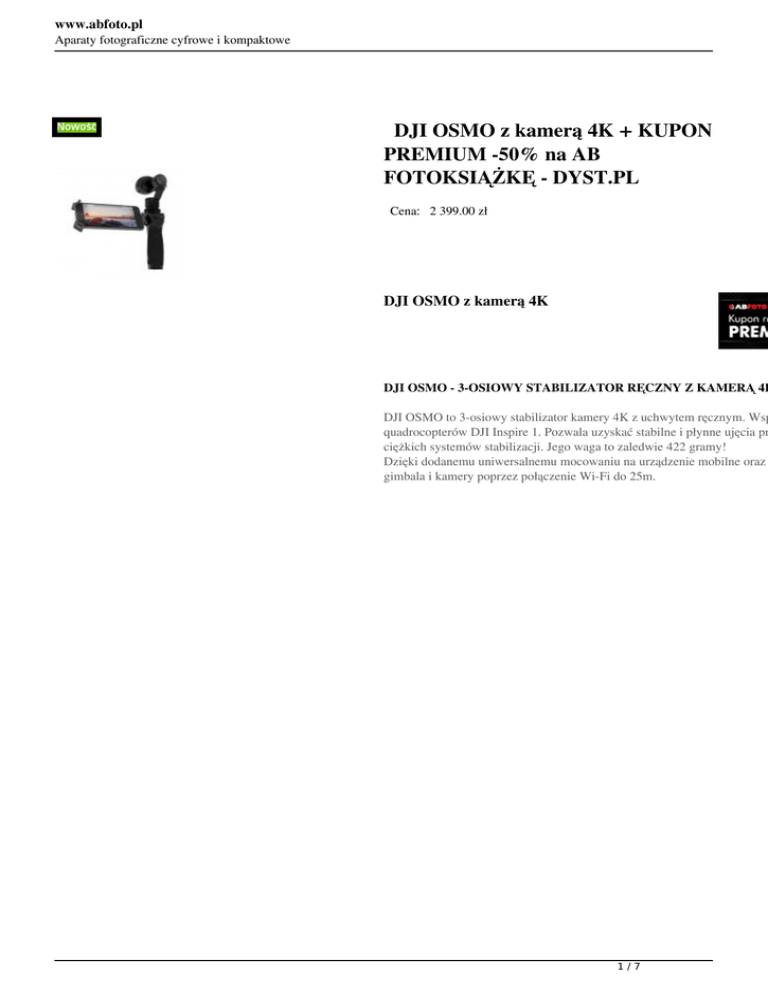 www.abfoto.pl Aparaty fotograficzne cyfrowe i kompaktowe DJI OSMO z kamerą 4K + KUPON PREMIUM -50% na AB FOTOKSIĄŻKĘ - DYST.PL Cena: 2 399.00 zł DJI OSMO z kamerą 4K DJI OSMO - 3-OSIOWY STABILIZATOR RĘCZNY Z KAMERĄ 4K DJI OSMO to 3-osiowy stabilizator kamery 4K z uchwytem ręcznym. Wsp quadrocopterów DJI Inspire 1. Pozwala uzyskać stabilne i płynne ujęcia pr ciężkich systemów stabilizacji. Jego waga to zaledwie 422 gramy! Dzięki dodanemu uniwersalnemu mocowaniu na urządzenie mobilne oraz gimbala i kamery poprzez połączenie Wi-Fi do 25m. 1/7 www.abfoto.pl Aparaty fotograficzne cyfrowe i kompaktowe DJI OSMO oferuje takie tryby pracy jak: - podążanie kamery za ruchami ręki, - tryb "inwersji" który umożliwia nagrywanie do góry nogami, - blokowanie gimbala przez co kamera patrzy tylko w jednym kierunku, - równoległe ustawienie obiektywu względem uchwytu, - obrót kamery w stronę użytkownika do wykonania "Selfie", - tryb "Timelapse" umożliwia filmowanie lub robienie zdjęć z czasem naśw ze statywu, - tryb automatycznej panoramy umożliwia fotografowanie w 360º. Wystar się obracać w poziomie z jednoczesnym wykonywaniem zdjęć, - dzięki "Sleep Mode" DJI OSMO przejdzie w automatyczny tryb czuwani Ergonomiczny kształt sprawia że DJI OSMO świetnie leży w ręku. Natom a filmowaniem, uruchamianie nagrywania oraz zatrzymywanie czy kontrol DJI OSMO wyposażony został również w zintegrowany mikrofon oraz sta Wymienna bateria wielokrotnego ładowania pozwala na 60 min ciągłej pra min. ŚWIAT 360° Tryb Automatyczna Panorama umożliwia łatwiejsze niż kiedykolwiek two 2/7 www.abfoto.pl Aparaty fotograficzne cyfrowe i kompaktowe przycisk. Kamera będzie się obracać, przechwytując zdjęcia, aż do całkow Zarejestruj w pamięci całe sceny CZAS PRZECHWYTYWANIA DJI Osmo pozwala rejestrować upływ czasu dużo łatwiej niż kiedykolwiek stworzyć płynne wideo automatycznie i łatwo bez używania statywu. ROZSZERZONA STABILIZACJA DJI Osmo wprowadził do kamery rozpoznawanie stabilizacji w odniesieni aparatem niweluje ruchy w trzech kierunkach, aby obraz pozostał nadal sta pierwszy raz kiedy technologia ta jest dostępna w aparacie, który trzymasz 3/7 www.abfoto.pl Aparaty fotograficzne cyfrowe i kompaktowe MOC W DŁONI Uchwyt na Osmo jest precyzyjnie zaprojektowany z wybranych materiałów rozmieszczone przyciski i elementy sterujące pozostawiają ważne funkcje Umieścić swojego smartfona w dołączonym uchwycie do telefonu, aby zob centrum dla wszystkich zaawansowanych inteligentnych trybów fotografow 4/7 www.abfoto.pl Aparaty fotograficzne cyfrowe i kompaktowe INTELIGENTNY TRYB UŚPIENIA Osmo po odłożeniu automatycznie przechodzi w tryb uśpienia po upływie zwiększa żywotność jego zaawansowanej elektroniki. Kiedy budzisz Osmo 5/7 www.abfoto.pl Aparaty fotograficzne cyfrowe i kompaktowe 6/7 www.abfoto.pl Aparaty fotograficzne cyfrowe i kompaktowe DJI OSMO można używać w niemalże każdej sytuacji, dzięki takim moco - uchwyt rowerowy - trójnóg - kijek teleskopowy - uniwersalne mocowanie (do mikrofonu lub oświetlenia) - uchwyt samochodowy (na przyssawki) - ramię rozszerzające Zestaw zawiera: Dji Osmo 4K gimbal z kamerą Etui neoprenowe Uchwyt pod smartphone Ładowarka 1xAkumulator Okablowanie Smycz krótka Smycz długa Karta microSD Filtr UV Dekielek na obiektyw 7/7 Powered by TCPDF (www.tcpdf.org)