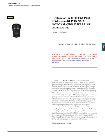www.abfoto.pl Aparaty fotograficzne cyfrowe i kompaktowe Tokina AT-X 16-28 F2.8 PRO FX/Canon+KUPON NA AB FOTOKSIĄŻKĘ O WART. 89 ZŁ-DYST.PL Cena: 3 345.00 zł Tokina AT-X 16-28 F2.8 PRO FX / Canon PROMOCJA NA AKCESORIA " 5, 10, 15 " - przy zakupie jednego akcesorium otrzymasz 5% rabatu, przy dwóch 10%, a przy trzech i wiecej 15%. ( rabat dotyczy tylko akcesoriów kupowanych z aparatem ) Zapoznaj się z regulaminem promocji Tokina AT-X 16-28 F2.8 PRO FX jest pierwszym, pełnoklatkowym obiektywem marki Tokina nowej generacji, przeznaczonym do lustrzanek cyfrowych. Stała jasność f/2.8 i szeroki zakres ogniskowych od 16 do 28 mm czynią z niego doskonałe narzędzie pracy w ręku profesjonalnego fotografa. Tokina AT-X 16-28 f/2.8 wykorzystuje silnik nowej generacji DC, który pracuje szybciej i ciszej. W połączeniu z nowym czujnikiem magnetycznym GMR zwiększa precyzję i znacząco przyspiesza nastawiania ostrości. W konstrukcji optycznej obiektywu zastosowano dużą przednią soczewkę asferyczną o średnicy 56 mm i dwa elementy asferyczne znajdujące się w tylnej części obiektywu. W celu zminimalizowania aberracji chromatycznej i zmniejszenia wymiarów obiektywu wykorzystano także trzy soczewki SD o bardzo niskim współczynniku dyspersji. Dzięki nim obiektyw ma doskonałą ostrością w całym polu obrazu, dużą jasność i znacznie zredukowaną dystorsją. AT-X 16-28 wyposażony jest w szybki i wygodny mechanizm zmiany trybu nastawiania ostrości One-touch Focus Clutch. Ułatwia to szybkie przełączanie się z trybu automatycznego na manualny i odwrotnie. Najważniejsze cechy: 1/2 www.abfoto.pl Aparaty fotograficzne cyfrowe i kompaktowe Trzy tłoczone, w pełni szklane soczewki asferyczne dające doskonały kontrast obrazu, ostrość oraz korektę aberracji Trzy soczewki ze szkła o bardzo niskim współczynniku rozpraszania (SD) pozwalają ograniczyć masę i rozmiary obiektywu oraz korygować aberrację chromatyczną Magnetyczny czujnik GMR przyspieszający pracę autofocusa 9-cio listkowa przysłona o kołowym otworze Dostępne mocowania: Canon Specyfikacja techniczna Model Ogniskowa (mm) Regulacja głębi ostrości Regulacja ogniskowej Powłoki Konstrukcja optyczna Soczewki SD Kąt widzenia (°) Minimalna odległość ostrzenia (m) Maksymalna skala odwzorowania Minimalna przysłona (f) Maksymalna przysłona (f) Listki przysłony Rozmiar filtra (mm) Wymiary dł. x szer. (mm) Waga (g) Dostępne akcesoria Osłona Dekiel przedni (mm) Mocowanie Format obrazu Gwarancja (miesiące) Pomimo dołożenia wszelkich starań oraz zachowania należytej staranności nie możemy zagwarantować, iż prezentowane opisy wraz ze zdjęciami produktów są w pełni zgodne ze specyfikacją producenta i stanem faktycznym. Jednocześnie zastrzegamy sobie prawo do błędów i nie ponosimy odpowiedzialności za błędne podanie parametrów produktów, które mogą być podstawą do ewentualnych roszczeń. W razie jakichkolwiek wątpliwości lub chęci uzyskania dodatkowych informacji prosimy o kontakt z działem handlowym lub weryfikację w oparciu o stronę producenta. 2/2 Powered by TCPDF (www.tcpdf.org)