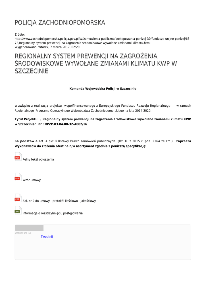 POLICJA ZACHODNIOPOMORSKA Źródło: http://www.zachodniopomorska.policja.gov.pl/sz/zamowienia-publiczne/postepowania-ponizej-30/fundusze-unijne-ponizej/66 72,Regionalny-system-prewencji-na-zagrozenia-srodowiskowe-wywolane-zmianami-klimatu.html Wygenerowano: Wtorek, 7 marca 2017, 02:29 REGIONALNY SYSTEM PREWENCJI NA ZAGROŻENIA ŚRODOWISKOWE WYWOŁANE ZMIANAMI KLIMATU KWP W SZCZECINIE Komenda Wojewódzka Policji w Szczecinie w związku z realizacją projektu współfinansowanego z Europejskiego Funduszu Rozwoju Regionalnego w ramach Regionalnego Programu Operacyjnego Województwa Zachodniopomorskiego na lata 2014-2020. Tytuł Projektu: „ Regionalny system prewencji na zagrożenia środowiskowe wywołane zmianami klimatu KWP w Szczecinie” nr : RPZP.03.04.00-32-A002/16 na podstawie art. 4 pkt 8 Ustawy Prawo zamówień publicznych (Dz. U. z 2015 r. poz. 2164 ze zm.), zaprasza Wykonawców do złożenia ofert na n/w asortyment zgodnie z poniższą specyfikacją: Pełny tekst ogłoszenia Wzór umowy Zał. nr 2 do umowy - protokół ilościowo - jakościowy Informacja o rozstrzyhnięciu postępowania Ocena: 0/5 (0) Tweetnij