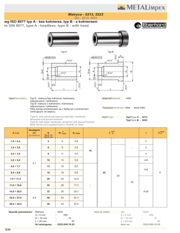 Matryca - 5213, 5223 Die - 5213, 5223 wg ISO 8977 typ A - bez kołnierza, typ B - z kołnierzem to DIN 8977, type A - headless, type B - with head Opis/Description: Typ A: matryca bez kołnierza, hartowana, odpuszczana i szlifowana. Typ B: matryca z kołnierzem, hartowana, odpuszczana i szlifowana. Obie wersje produkowane są z fazką lub z promieniem centrującym na wejściu. Materiał/Material: Type A: with cylindrical external diameter, hardened, tempered and ground finished Type B: with head, hardened, tempered and ground finished Both version are supplied lead in chamfer or relief. Kod/Code: Dostępne co: Gradation D D1 -0,25 0 d1 max 1,0 ÷ 2,4 5 8 2,8 1,6 ÷ 3,0 6 9 3,5 d +0,02 Typ A: n5 Typ B: m5 HSS Twardość/Hardness: HSS L 64±2 HRC Typ/Type A - 5213 Typ/Type B - 5223 +0,5 0 l - +0,25 0 h 2 - 3 16 2,0 ÷ 3,5 8 11 4,0 4 10 13 5,8 4-8 4,0 ÷ 7,7 13 16 8,0 6,0 ÷ 8,8 16 19 9,5 3,0 ÷ 5,0 0,1 5-8 20 5 25 7,5 ÷ 11,3 20 23 12,0 11,0 ÷ 16,6 25 28 17,3 15,0 ÷ 20,0 32 35 20,7 40 43 27,7 50 53 37,0 32 18,0 ÷ 27,0 26,0 ÷ 36,0 Sposób zamawiania: E/20 0,5 Matryca d = 5 mm D = 10 mm L = 20 mm Nr katalogowy - 5223 050. 10. 25 - 5223.050.10.25 8-20 How to order: Die d = 5 mm D = 10 mm L = 20 mm Item no. - 5223 050. 10. 25 - 5223.050.10.25