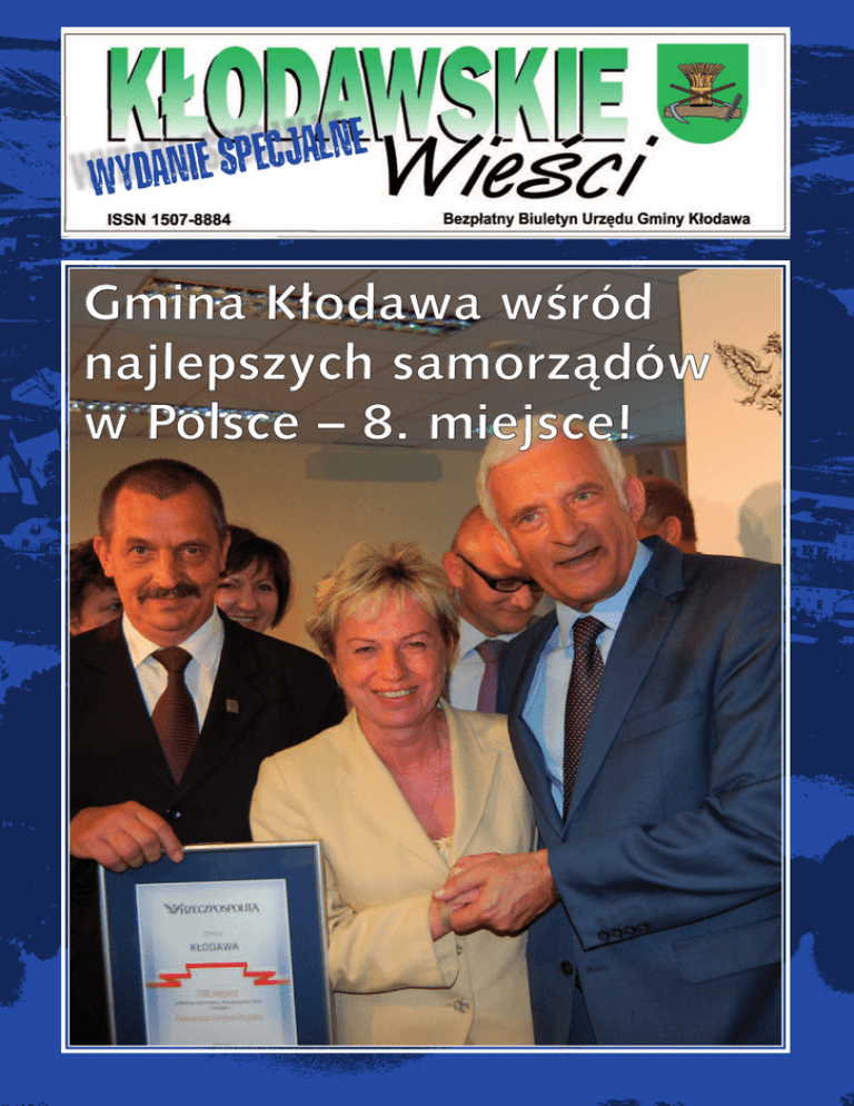 E N L A J C E P S E I N A D Y W G m in a Kł o d a wa w śr ó d n a j l e p s z y ch s a m o r zą d ó w w Polsce – 8. miejsce! Wydanie Specjalne 2010 DrodzyMieszkańcy, GminaKłodawajestnietylkopiękną,atrakcyjnąoraznowoczesną gminą,o dużympotencjalerozwojowym,aletakżeskarbnicąprzyrody.Działalnośćinwestycyjnaw ostatnichlatachskupiałasięwokół głównegocelu,jakimbyłopodnoszeniepoziomujakościżycianaszych mieszkańców.Wydatkiinwestycyjnedeterminowałytworzenienowej infrastrukturyorazwpływałyna poprawęi ochronęśrodowiskanaturalnego.Działaniatakiewymagałyciągłejaplikacjio zewnętrzneśrodkifinansowe,zasilającebudżetgminy.Wartozaznaczyć,żerealizacja w ostatnichlatachwieluprzedsięwzięćinfrastrukturalnychbyłamożliwadziękibardzodobrejwspółpracyz radągminyorazmieszkańcami,instytucjamiprzedsiębiorcamizterenugminy. Zrównoważonapolitykarozwojowa,jakąobrałamwspólniez radnymina początkuobecnejkadencjizaowocowałatym,żeGminaKłodawazyskałanowywizerunek–gminyo dużympotencjalerozwojowym, przyjaznejmieszkańcom,inwestującejw ludzi. IntegracjalokalnychśrodowisktozasługanaszychMieszkańców,którzyaktywniedziałająw klubach seniora,świetlicachwiejskich,kołachwędkarskichorazłowieckich,zespołachfolklorystycznych,tanecznychorazklubachsportowych. Przy tejokazjichciałabymzłożyćserdecznepodziękowanieza pracęwłożonąw rozwójnaszejMałejOjczyznyRadnymorazSołtysom,którzysązawszegotowido wypełnianiazadańna rzeczswoichśrodowisk,pracownikomgminnychjednostekorganizacyjnych,strażakom–niosącympomocpotrzebującym orazwszystkim,którzyprzyczynilisiędo realizacjiobranychcelów. Mamnadzieję,żezaprezentowanyw tymwydaniubiuletynudorobekinwestycyjnyosiągniętyw latach 2007-2010zaspokoiłw dużymstopniuPaństwaoczekiwania.Jestemświadomatego,żejeszcze wiele zadań przed nami. Zapraszam więc Państwa do wspólnej pracy nad przyszłorocznym budżetem. Łączęwyrazyszacunku WójtGminyKłodawa AnnaMołodciak Szanowni Mieszkaƒcy Gminy Kłodawa, Dzi´kuj´ Paƒstwu za dar wielkiego serca okazany w postaci pomocy dla gminy Gorzyce (powiat tarnobrzeski), poszkodowanej w majowej powodzi. JednoczeÊnie zwracam si´ z apelem o pomoc dla mieszkaƒców Bogatyni, poszkodowanych w tegorocznej powodzi. Woda zniszczyła ich domy, budynki gospodarcze, uprawy rolne, a wiele osób straciło dorobek całego ˝ycia. Przydadzà si´ zwłaszcza: Êrodki czystoÊci, gumowe r´kawice, Êcierki do podłogi, gumowce, nieprzemakalne płaszcze, wiadra, mopy… Ale te˝: r´czniki, koce, poÊciel, odzie˝ (nowa), Êrodki higieny osobistej. Bardzo potrzebne jest te˝ jedzenie o długim terminie wa˝noÊci w hermetycznych opakowaniach, konserwy. Mam nadziej´, ˝e znajdà si´ wÊród nas osoby, które ze zwykłej dobroci serca zechcà przyłàczyç si´ do organizowanej zbiórki. Na miejsca zbiórki darów wyznaczone zostały: Urzàd Gminy Kłodawa (w godz. pracy urz´du) oraz Êwietlice wiejskie (informacja u sołtysów wsi). Koordynatorem zbiórki, która potrwa do 10 wrzeÊnia br. jest Urzàd Gminy Kłodawa. Rolnicy, którzy chcà przekazaç płody rolne proszeni sà o kontakt telefoniczny: 095 7216-660 lub 7216-678. Dary dla powodzian z gminy Gorzyce JednoczeÊnie, w imieniu ofiar tegorocznego ˝ywiołu ju˝ teraz składam serdeczne czerwiec 2010 podzi´kowanie za wra˝liwoÊç, okazanà dobroç i udzielone wsparcie. Wójt Gminy Kłodawa Anna Mołodciak 2 Wydanie Specjalne 2010 Gmina Kłodawa wśród najlepszych samorządów w Polsce Po raz 12. gazeta „Rzeczpospolita” przeprowadziła ranking samorzàdów. Wyboru dokonywała w dwóch etapach. W pierwszym, Ministerstwo Finansów wyłoniło spoÊród 2483 miast i gmin te, które w latach 2006–2009 najlepiej zarzàdzały swoimi finansami i najkorzystniej inwestowały. Punktowana była: • dynamika wzrostu wydatków majàtkowych (pomniejszonych o Êrodki unijne) w przeliczeniu na jednego mieszkaƒca w latach 2006–2009; • wartoÊç Êrodków unijnych w przeliczeniu na jednego mieszkaƒca, które w latach 2007-2009 wpłyn´ły na rachunek bud˝etu gminy; • zadłu˝enie samorzàdu w stosunku do dochodów w latach 2006–2009; • nadwy˝ka operacyjna w stosunku do dochodów w latach 2007–2009; • dynamika wzrostu dochodów własnych w latach 2006–2009; • relacja nakładów inwestycyjnych do przyrostu zadłu˝enia w latach 2006–2009; • dynamika wzrostu wydatków ogółem na jednego mieszkaƒca w wybranych działach w poszczególnych latach 2006–2009; • transport i łàcznoÊç; • ochrona Êrodowiska. Do drugiego etapu zakwalifikowały si´ 564 samorzàdy, w tym: 64 miasta na prawach powiatu, 250 gmin miejskich i miejsko-wiejskich oraz 250 wiejskich. Wybór ten został zatwierdzony przez niezale˝nà kapituł´ w składzie: prof. dr hab Michał Kulesza, twórca reformy samorzàdowej w Polsce, Paweł Tomczak, dyrektor Biura Zwiàzku Gmin Wiejskich, Tomasz Mironczuk, prezes Banku Gospodarstwa Krajowego, Krzysztof Hetman, podsekretarz stanu w Ministerstwie Rozwoju Regionalnego, Andrzej Porawski, dyrektor biura Zwiazku Miast Polskich, Adam Kowalewski, prezes rady nadzorczej Fundacji Demokracji Lokalnej, Wojciech Romaƒski, zast´pca kierownika działu ekonomicznego „Rzeczpospolitej” i redaktor Rankingu Samorzàdów, Aleksandra Kurowska, dziennikarka działu ekonomicznego „Rzeczpospolitej”. Gmina Kłodawa znalazła si´ na zaszczytnym 8. miejscu w kategorii „najlepsze gminy wiejskie”. Uroczysta gala wr´czenia wyró˝nieƒ odbyła si´ 20 lipca w redakcji gazety. Nagrod´ z ràk prof. Jerzego Buzka, przewodniczàcego Parlamentu Europejskiego w obecnoÊci El˝biety Bieƒkowskiej, minister rozwoju regionalnego oraz Pawła Lisieckiego, redaktora naczelnego „Rzeczpospolitej” w imieniu gminy odebrała wójt Anna Mołodciak. ... Jestem naprawd´ mile zaskoczona, ˝e na 250 gmin wiejskich, nasza uplasowała si´ na ósmym miejscu. Nadmieniam, ze nasza gmina w 2005 roku znalazła si´ w „Zł
