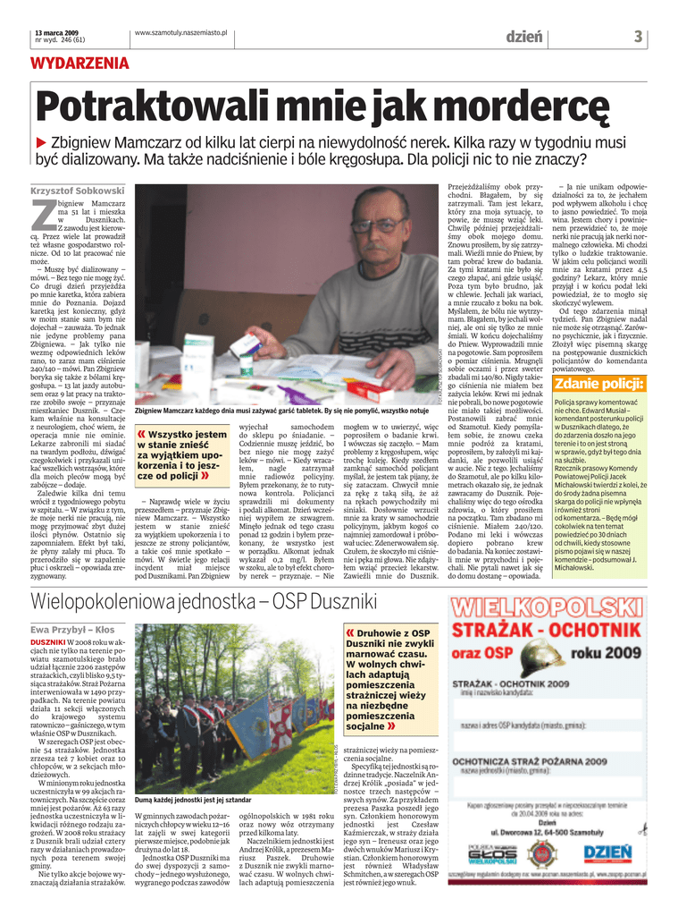 13 marca 2009 nr wyd. 246 (61) www.szamotuly.naszemiasto.pl 3 dzień WYDARZENIA Potraktowali mnie jak mordercę b Zbigniew Mamczarz od kilku lat cierpi na niewydolność nerek. Kilka razy w tygodniu musi być dializowany. Ma także nadciśnienie i bóle kręgosłupa. Dla policji nic to nie znaczy? Krzysztof Sobkowski FOT.KRZYSZTOFSOBKOWSKI Z bigniew Mamczarz ma 51 lat i mieszka w Dusznikach. Z zawodu jest kierowcą. Przez wiele lat prowadził też własne gospodarstwo rolnicze. Od 10 lat pracować nie może. – Muszę być dializowany – mówi. – Bez tego nie mogę żyć. Co drugi dzień przyjeżdża po mnie karetka, która zabiera mnie do Poznania. Dojazd karetką jest konieczny, gdyż w moim stanie sam bym nie dojechał – zauważa. To jednak nie jedyne problemy pana Zbigniewa. – Jak tylko nie wezmę odpowiednich leków rano, to zaraz mam ciśnienie 240/140 – mówi. Pan Zbigniew boryka się także z bólami kręgosłupa. – 13 lat jazdy autobusem oraz 9 lat pracy na traktorze zrobiło swoje – przyznaje mieszkaniec Dusznik. – Czekam właśnie na konsultacje z neurologiem, choć wiem, że operacja mnie nie ominie. Lekarze zabronili mi siadać na twardym podłożu, dźwigać czegokolwiek i przykazali unikać wszelkich wstrząsów, które dla moich pleców mogą być zabójcze – dodaje. Zaledwie kilka dni temu wrócił z tygodniowego pobytu w szpitalu. – W związku z tym, że moje nerki nie pracują, nie mogę przyjmować zbyt dużej ilości płynów. Ostatnio się zapomniałem. Efekt był taki, że płyny zalały mi płuca. To przerodziło się w zapalenie płuc i oskrzeli – opowiada zrezygnowany. Zbigniew Mamczarz każdego dnia musi zażywać garść tabletek. By się nie pomylić, wszystko notuje « Wszystko jestem w stanie znieść za wyjątkiem upokorzenia i to jeszcze od policji » – Naprawdę wiele w życiu przeszedłem – przyznaje Zbigniew Mamczarz. – Wszystko jestem w stanie znieść za wyjątkiem upokorzenia i to jeszcze ze strony policjantów, a takie coś mnie spotkało – mówi. W świetle jego relacji incydent miał miejsce pod Dusznikami. Pan Zbigniew wyjechał samochodem do sklepu po śniadanie. – Codziennie muszę jeździć, bo bez niego nie mogę zażyć leków – mówi. – Kiedy wracałem, nagle zatrzymał mnie radiowóz policyjny. Byłem przekonany, że to rutynowa kontrola. Policjanci sprawdzili mi dokumenty i podali alkomat. Dzień wcześniej wypiłem ze szwagrem. Minęło jednak od tego czasu ponad 12 godzin i byłem przekonany, że wszystko jest w porządku. Alkomat jednak wykazał 0,2 mg/l. Byłem w szoku, ale to był efekt choroby nerek – przyznaje. – Nie mogłem w to uwierzyć, więc poprosiłem o badanie krwi. I wówczas się zaczęło. – Mam problemy z kręgosłupem, więc trochę kuleję. Kiedy szedłem zamknąć samochód policjant myślał, że jestem tak pijany, że się zataczam. Chwycił mnie za rękę z taką siłą, że aż na rękach powychodziły mi siniaki. Dosłownie wrzucił mnie za kraty w samochodzie policyjnym, jakbym kogoś co najmniej zamordował i próbował uciec. Zdenerwowałem się. Czułem, że skoczyło mi ciśnienie i pęka mi głowa. Nie zdążyłem wziąć przecież lekarstw. Zawieźli mnie do Dusznik. Wielopokoleniowajednostka–OSPDuszniki « Druhowie z OSP DUSZNIKI W 2008 roku w ak- Duszniki nie zwykli marnować czasu. W wolnych chwilach adaptują pomieszczenia strażniczej wieży na niezbędne pomieszczenia socjalne » cjach nie tylko na terenie powiatu szamotulskiego brało udział łącznie 2206 zastępów strażackich, czyli blisko 9,5 tysiąca strażaków. Straż Pożarna interweniowała w 1490 przypadkach. Na terenie powiatu działa 11 sekcji włączonych do krajowego systemu ratowniczo – gaśniczego, w tym właśnie OSP w Dusznikach. W szeregach OSP jest obecnie 54 strażaków. Jednostka zrzesza też 7 kobiet oraz 10 chłopców, w 2 sekcjach młodzieżowych. W minionym roku jednostka uczestniczyła w 99 akcjach ratowniczych. Na szczęście coraz mniej jest pożarów. Aż 63 razy jednostka uczestniczyła w likwidacji różnego rodzaju zagrożeń. W 2008 roku strażacy z Dusznik brali udział cztery razy w działaniach prowadzonych poza terenem swojej gminy. Nie tylko akcje bojowe wyznaczają działania strażaków. FOT.EWAPRZYBYŁ– KŁOS Ewa Przybył – Kłos Dumą każdej jednostki jest jej sztandar W gminnych zawodach pożarniczych chłopcy w wieku 12–16 lat zajęli w swej kategorii pierwsze miejsce, podobnie jak drużyna do lat 18. Jednostka OSP Duszniki ma do swej dyspozycji 2 samochody – jednego wysłużonego, wygranego podczas zawodów ogólnopolskich w 1981 roku oraz nowy wóz otrzymany przed kilkoma laty. Naczelnikiem jednostki jest Andrzej Królik, a prezesem Mariusz Paszek. Druhowie z Dusznik nie zwykli marnować czasu. W wolnych chwilach adaptują pomieszczenia strażniczej wieży na pomieszczenia socjalne. Specyfiką tej jednostki są rodzinne tradycje. Naczelnik Andrzej Królik „posiada” w jednostce trzech następców – swych synów. Za przykładem prezesa Paszka poszedł jego syn. Członkiem honorowym jednostki jest Czesław Kaźmierczak, w straży działa jego syn – Ireneusz oraz jego dwóch wnuków Mariusz i Krystian. Członkiem honorowym jest również Władysław Schmitchen, a w szeregach OSP jest również jego wnuk. Przejeżdżaliśmy obok przychodni. Błagałem, by się zatrzymali. Tam jest lekarz, który zna moja sytuację, to powie, że muszę wziąć leki. Chwilę później przejeżdżaliśmy obok mojego domu. Znowu prosiłem, by się zatrzymali. Wieźli mnie do Pniew, by tam pobrać krew do badania. Za tymi kratami nie było się czego złapać, ani gdzie usiąść. Poza tym było brudno, jak w chlewie. Jechali jak wariaci, a mnie rzucało z boku na bok. Myślałem, że bólu nie wytrzymam. Błagałem, by jechali wolniej, ale oni się tylko ze mnie śmiali. W końcu dojechaliśmy do Pniew. Wyprowadzili mnie na pogotowie. Sam poprosiłem o pomiar ci