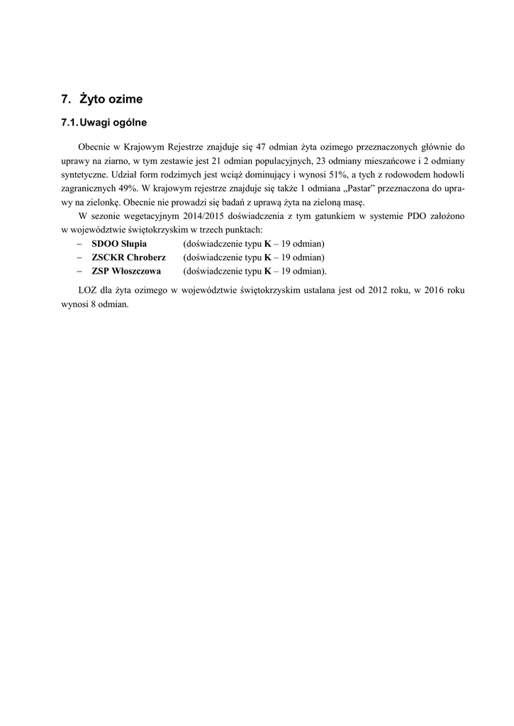 7. Żyto ozime 7.1. Uwagi ogólne Obecnie w Krajowym Rejestrze znajduje się 47 odmian żyta ozimego przeznaczonych głównie do uprawy na ziarno, w tym zestawie jest 21 odmian populacyjnych, 23 odmiany mieszańcowe i 2 odmiany syntetyczne. Udział form rodzimych jest wciąż dominujący i wynosi 51%, a tych z rodowodem hodowli zagranicznych 49%. W krajowym rejestrze znajduje się także 1 odmiana „Pastar” przeznaczona do uprawy na zielonkę. Obecnie nie prowadzi się badań z uprawą żyta na zieloną masę. W sezonie wegetacyjnym 2014/2015 doświadczenia z tym gatunkiem w systemie PDO założono w województwie świętokrzyskim w trzech punktach: SDOO Słupia (doświadczenie typu K – 19 odmian) ZSCKR Chroberz (doświadczenie typu K – 19 odmian) ZSP Włoszczowa (doświadczenie typu K – 19 odmian). LOZ dla żyta ozimego w województwie świętokrzyskim ustalana jest od 2012 roku, w 2016 roku wynosi 8 odmian. 7.2. Wyniki doświadczeń Tabela 7.1. Żyto ozime. Odmiany badane. Rok zbioru 2015 Rok wpisania do KRO w Polsce Rok właczenia do LOZ Kod kraju pochodzenia 1 DAŃKOWSKIE DIAMENT 2005 2012 PL DANKO Hodowla Roślin sp. z o.o. Choryń 27; 64-000 Kościan 2 STANKO 2007 2014 PL Alicja Ramenda , Antoniny 3/6; 64-100 Leszno 3 DOMIR 2008 2012 PL Alicja Ramenda , Antoniny 3/6; 64-100 Leszno 4 BRASETTO F1 2009 2012 DE KWS Lochow GmgH Postfach 1197; 29296 Bergen KWS Lochow Polska sp. z o.o. Kondratowice, ul. Słowiańska 5; 57-150 Prusy DE KWS Lochow GmgH Postfach 1197; 29296 Bergen KWS Lochow Polska sp. z o.o. Kondratowice, ul. Słowiańska 5; 57-150 Prusy PL DANKO Hodowla Roślin sp. z o.o. Choryń 27; 64-000 Kościan Lp. Odmiana Adres jednostki zachowującej odmianę lub w przypadku odmiany zagranicznej – pełnomocnika w Polsce 5 PALAZZO F1 2009 6 DAŃKOWSKIE AMBER 2010 7 SU SKALTIO F1 2010 DE HYBRO Saatzucht GmbH &Co. KG Kleptow 53; 17291 Schenkenberg Saaten-Union Polska sp. z o.o. ul. Straszewska 70; 62-100 Wągrowiec 8 ARMAND 2011 PL Alicja Ramenda , Antoniny 3/6; 64-100 Leszno 9 SU DRIVE F1 2011 DE HYBRO Saatzucht GmbH&Co. KG Kleptow 53; 17291 Schenkenberg Saaten-Union Polska sp z o.o. ul. Straszewska 70; 62-100 Wągrowiec DE HYBRO Saatzucht GmbH&Co. KG Kleptow 53; 17291 Schenkenberg Saaten-Union Polska sp z o.o. ul. Straszewska 70; 62-100 Wągrowiec DE HYBRO Saatzucht GmbH&Co. KG Kleptow 53; 17291 Schenkenberg Saaten-Union Polska sp z o.o. ul. Straszewska 70; 62-100 Wągrowiec 2013 10 SU ALLAWI F1 2012 11 SU STAKKATO F1 2012 12 ANTONIŃSKIE 2013 PL Poznańska Hodowla Roślin sp. z o.o. ul. Kasztanowa 5; 63-004 Tulce 13 DAŃKOWSKIE RUBIN 2013 PL DANKO Hodowla Roślin sp. z o.o. Choryń 27; 64-000 Kościan 2016 14 SU SATELLIT F1 2013 2016 DE HYBRO Saatzucht GmbH &Co. KG Kleptow 53; 17291 Schenkenberg Saaten-Union Polska sp. z o.o. ul. Straszewska 70; 62-100 Wągrowiec 15 SU SPEKTRUM F1 2013 2016 DE HYBRO Saatzucht GmbH &Co. KG Kleptow 53; 17291 Schenkenberg Saaten-Union Polska sp. z o.o. ul. Straszewska 70; 62-100 Wągrowiec 16 TUR F1 2013 PL Hodowla Roślin Smolice sp. z o.o. Grupa IHAR Smolice 146; 63-740 Kobylin 17 BRANDIE F1 2014 DE Monsanto Saaten GmgH Vogelsanger Weg 91, 40470 Düsseldorf Monsanto Polska sp z o.o. ul. Domaniewska 49; 02-672 Warszawa 18 KWS BONO F1 2014 DE KWS Lochow GmgH Postfach 1197; 29296 Bergen KWS Lochow Polska sp. z o.o. Kondratowice, ul. Słowiańska 5; 57-150 Prusy 19 SU PERFORMER F1 2014 DE HYBRO Saatzucht GmbH &Co. KG Kleptow 53; 17291 Schenkenberg Saaten-Union Polska sp. z o.o. ul. Straszewska 70; 62-100 Wągrowiec F1 – odmiana mieszańcowa. Tabela 7.2. Żyto ozime. Warunki polowe doświadczeń. Rok zbioru 2015 Punkt SDOO Słupia ZSCKR Chroberz doświadczalny ZSP Włoszczowa Jędrzejów Pińczów Włoszczowa Pszenny dobry Pszenny dobry Pszenny dobry Klasa bonitacyjna gleby III a II III a, III b pH gleby w KCl 5,6 – – Przedplon Groch siewny Pszenica ozima Jęczmień jary Data siewu 30.09.2014 06.10.2014 10.10.2014 200 200 200 04.08.2015 14.08.2015 11.08.2015 Powiat Kompleks rolniczej przydatności gleby Obsada nasion (szt/m2) Data zbioru Nawożenie mineralne N na poziomie a1 (kg/ha) N na poziomie a2 (kg/ha) 95 98 95 115 138 135 P2O5 (kg/ha) 50 60 50 K2O (kg/ha) 75 90 75 Basfoliar 36 Extra + ADOB Mn + ADOB Cu – 6 l + 1,5 l + 1 l Basfoliar 36 Extra + ADOB Mn + ADOB Cu – 6 l + 1,5 l+1l Basfoliar 36 Extra + ADOB Mn + ADOB Cu – 6 l + 1,5 l +1l Nawożenie dolistne preparatami wieloskład. na poziomie a2 (na ha) Środki ochrony roślin Zaprawa nasienna Funaben Plus 02 WS Funaben Plus 02 WS Funaben Plus 02 WS Herbicyd Expert Met 56 WG – 0,35kg Huzar Activ 387 OD – 1l Lentipur Flo 500 SC – 2l Fastac 100 EC – 0,1 Fastac 100 EC – 0,1 Fastac 100 EC – 0,1 (na ha) Insektycyd (l/ha) (tylko na poziomie a2) Fungicyd – I zabieg (l/ha) Fungicyd – II zabieg (l/ ha) Regulator wzrostu (l/ ha) Soligor 425 EC – 1 Soligor 425 EC – 1 Soligor 425 EC – 1 Menara 410 EC – 0,5 Prosaro 250 EC – 1 Prosaro 250 EC – 1 Moddus 250 EC – 0,3 Moddus 250 EC – 0,3 Moddus 250 EC – 0,3 Tabela 7.4. Żyto ozime. Plon % wzorca. Rok zbioru 2015 Poziom a1 Lp. Odmiana Wzorzec, dt z ha Poziom a2 SDOO Słupia ZSCKR Chroberz ZSP Włoszczowa SDOO Słupia ZSCKR Chroberz ZSP Włoszczowa 95,4 107,7 63,3 111,7 109,9 76,9 1 DAŃKOWSKIE DIAMENT 91 85 92 86 89 91 2 STANKO 89 100 90 90 93 90 3 DOMIR 83 96 100 89 97 88 4 BRASETTO F1 111 105 119 106 106 119 5 PALAZZO F1 107 105 97 105 106 108 6 DAŃKOWSKIE AMBER 95 91 88 90 92 92 7 SU SKALTIO F1 111 95 106 112 101 101 8 ARMAND 89 81 94 81 83 85 9 SU DRIVE F1 104 108 111 110 98 108 10 SU ALLAWI F1 110 114 111 113 118 106 11 SU STAKKATO F1 111 109 117 116 114 111 12 ANTONIŃSKIE 93 82 87 88 81 84 13 RUBIN 90 87 84 89 85 84 14 SU SATELLIT F1 93 106 101 104 100 106 15 SU SPEKTRUM F1 106 110 108 108 115 111 16 TUR F1 101 106 92 99 110 101 17 BRANDIE F1 97 92 90 102 95 90 18 KWS BONO F1 103 111 96 104 96 101 19 SU PERFORMER F1 116 117 117 110 121 124 DAŃKOWSKIE Wzorzec 2015 – wszystkie badane odmiany. Wykaz odmian 