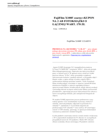 www.abfoto.pl Aparaty fotograficzne cyfrowe i kompaktowe FujiFilm X100F czarny+KUPON NA 2 AB FOTOKSIĄŻKI O ŁĄCZNEJ WART. 178 ZŁ Cena: 6 099.00 zł FujiFilm X100F CZARNY PROMOCJA NA AKCESORIA " 5, 10, 15 " - przy zakupie jednego akcesorium otrzymasz 5% rabatu, przy dwóch 10%, a przy trzech i wiecej 15%. ( rabat dotyczy tylko akcesoriów kupowanych z aparatem ) Zapoznaj się z regulaminem promocji Aparat X100F dysponuje 24.3 megapikselową matrycą X-Trans™ CMOS III*1 rozmiarów APS-C , która nie posiada filtra dolnoprzepustowego. Zapewnia ona najwyższą jakość pracy w historii serii X. W aparacie użyty został też szybki procesor obrazu “X Pro”, który gwarantuje wyjątkowe odwzorowanie kolorów i gradacji odcieni, w przypadku zdjęć i filmów wideo, a także oferuje wysokie czułości ISO z zachowaniem niskiego poziomu szumów. Tryby Symulacji filmu światłoczułego, rozwinięte w oparciu o ponad 80-letnie dziedzictwo Fujifilm w zakresie reprodukcji koloru i opracowywania filmów światłoczułych, uległy dalszej ewolucji i pozwalają obecnie na lepsze uchwycenie faktury powierzchni przedmiotów, zapewniają poczucie trójwymiarowości obrazu a nawet szczególnego klimatu, jaki zainspirował fotografa do zdjęcia. W modelu X100F poprawiono jeszcze podstawowe czasy reakcji aparatu. Czas uruchamiania wynoszący około 0.5 sekundy, interwał pomiędzy zdjęciami na poziomie 0.2 sekundy**, opóźnienie w wyzwoleniu migawki nie przekraczające 0.01 sekundy** oraz szybszy AF ustawiający ostrość w 0.08 sekundy, sprawiają, że aparat jest doskonałym wykonawcą zamierzeń i działań fotografa. Liczba punktów ustawiania ostrości została istotnie zwiększona z 49 w poprzednich modelach do 91 obecnie (w szczególnych przypadkach nawet do 325 punktów). Około 40% obszaru obrazu (centralny obszar zawierający 49 punktów ostrości) 1/3 www.abfoto.pl Aparaty fotograficzne cyfrowe i kompaktowe pokryte jest pikselami AF z detekcją fazową tworząc system szybkiego i precyzyjnego autofocusa opartego na detekcji fazowej, który doskonale sprawdza się przy fotografowaniu różnorodnych motywów. Zmienne powiększenie elektronicznego dalmierza, pokazywanego jako elektroniczny wizjer (EVF) w małym okienku na dole po prawej stronie wizjera optycznego, poprawia precyzję podczas sprawdzania ostrości. Do obszaru ostrości, poza ramką informacyjną, stosowana jest funkcja Korekcji paralaksy ※2 w czasie rzeczywistym, co ułatwia pewne kadrowanie ujęć i ustawienie ostrości w trybie manualnym. Spośród nowych cech modelu X100F należy wspomnieć wprowadzenie pokrętła czułości ISO, które zostało wbudowane w pokrętło czasów migawki nawiązując tym samym do aparatów na filmy światłoczułe. Wprowadzona została także Dźwignia ostrości, która pozwala na natychmiastowe przesuwanie obszaru ostrości bez odrywania oka od wizjera. Nowością jest też pozycja “C” umożliwiająca korekcję ekspozycji w zakresie ±5 kroków EV. Większość przycisków i pokręteł odnoszących się do obsługi aparatu skupiono po prawej stronie korpusu, aby zapewnić możliwość szybkiej zmiany ustawień przy jednoczesnym mocnym trzymaniu aparatu. *1 X-Trans jest znakiem towarowym lub zarejestrowanym znakiem towarowym FUJIFILM Corporation. *2 Przesunięcie pomiędzy ramką zakresu fotografowania a faktycznym zakresem fotografowania podczas wykonywania zdjęć z niewielkiej odległości. Specyfikacja Nazwa modelu Efektywna liczba pikseli Matryca Nośniki danych Nazwa obiektywu Długość ogniskowej Maksymalna przysłona Konfiguracja Przysłona Odległość ogniskowania Czułość Czas naświetlania 2/3 www.abfoto.pl Aparaty fotograficzne cyfrowe i kompaktowe Lampa błyskowa Wizjer optyczny Wyświetlacz LCD Nagrywanie filmów Zasilanie Wymiary i masa Czas pracy akumulatora podczas robienia zdjęć*5 Akcesoria w zestawie (5) Wysokiej klasy obiektyw FUJINON 23 mm*4 F2 Pomimo dołożenia wszelkich starań oraz zachowania należytej staranności nie możemy zagwarantować, iż prezentowane opisy wraz ze zdjęciami produktów są w pełni zgodne ze specyfikacją producenta i stanem faktycznym. Jednocześnie zastrzegamy sobie prawo do błędów i nie ponosimy odpowiedzialności za błędne podanie parametrów produktów, które mogą być podstawą do ewentualnych roszczeń. W razie jakichkolwiek wątpliwości lub chęci uzyskania dodatkowych informacji prosimy o kontakt z działem handlowym lub weryfikację w oparciu o stronę producenta. 3/3 Powered by TCPDF (www.tcpdf.org)
