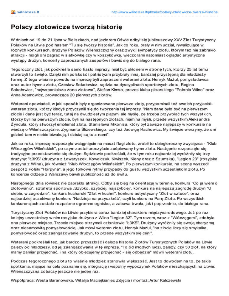 wilno t e ka.lt http://www.wilno teka.lt/pl/tresc/po lscy-zlo to wicze-two rza-histo rie Polscy zlotowicze tworzą historię W dniach od 19 do 21 lipca w Bieliszkach, nad jeziorem Oświe odbył się jubileuszowy XXV Z lot Turystyczny Polaków na Litwie pod hasłem "Tu się tworzy historia". Jak co roku, brały w nim udział, rywalizujące w różnych konkursach, drużyny Polaków Wileńszczyzny oraz zwykli sympatycy zlotu, którym też nie zabrakło atrakcji - mogli oni zagrać w siatkówkę czy w koszykówkę, wieczorami natomiast oglądać artystyczne występy drużyn, koncerty zaproszonych zespołów i bawić się do białego rana. Tegoroczny zlot, jak podkreśla samo hasło imprezy, miał być ukłonem w stronę tych, którzy 25 lat temu stworzyli to święto. Dzięki nim polskość i patriotyzm przybrały inną, bardziej przystępną dla młodzieży f ormę. Z tego właśnie powodu na imprezę byli zaproszeni weterani zlotu: Henryk Mażul, pomysłodawca oraz autor hymnu zlotu, Czesław Sokołowicz, sędzia na dyscyplinach sportowych zlotu, Regina Sokołowicz, "najwspanialsza żona zlotowa", Stef an Kimso, prezes klubu piłkarskiego "Polonia Wilno" oraz Anna Adamowicz, prowadząca 20 pierwszych zlotów. Weterani opowiadali, w jaki sposób były organizowane pierwsze zloty, przypominali też swoich przyjaciółweteran zlotu, którzy kiedyś przyczynili się do tworzenia tej imprezy. "Nam dane było być na pierwszym zlocie i dane jest być teraz, tutaj na dwudziestym piątym, ale myślę, że trzeba przywołać tych wszystkich, którzy byli na pierwszym zlocie, byli na następnych zlotach, mam na myśli, przede wszystkim Aleksandra Ż yndula, który stworzył emblemat zlotu, Stanisława Mikonisa, który był zawsze najlepszy w konkursie na wiedzę o Wileńszczyźnie, Z ygmunta Śliżewskiego, czy też Jadwigę Rachowicz. My święcie wierzymy, że oni gdzieś tam w niebie biwakują, i dzisiaj są tu z nami". Jak co roku, imprezę rozpoczęło wciągnięcie na maszt f lagi zlotu, zrobił to ubiegłoroczny zwycięzca - "Klub Włóczęgów Wileńskich", po czym został uroczyście zaśpiewany hymn zlotu. Następnie rozpoczęło się tradycyjne przedstawienie się drużyn. Sędziowie podkreślali, że w tym roku najbardziej wyróżniły się trzy drużyny: "Ł3KS" (drużyna z Ławaryszek, Kowalczuk, Kiwiszek, Kieny oraz z Szumska), "Legion 23" (rosyjska drużyna z Wilna), jak również "Klub Włoczęgów Wileńskich". Po pierwszym konkursie, na scenę wyszedł zespół z Polski "Horpyna", a jego f olkowe rytmy przypadły do gustu wszystkim uczestnikom zlotu. Po koncercie didżeje z Warszawy bawili publiczność aż do świtu. Następnego dnia również nie zabrakło atrakcji. Odbył się bieg na orientację w terenie, konkurs "Co ja wiem o zlotowaniu", sztaf eta sportowa „Szybko, szybciej, najszybciej”, konkurs na najlepszą zagrodę drużyn "U siebie, w zagrodzie", konkurs kucharski "Z lot w kuchni", konkurs astystyczny "Z lot w sztuce", oraz najbardziej oczekiwany konkurs "Nadzieja na przyszłość", czyli konkurs na Parę Z lotu. Po wszystkich konkurencjach zostało rozpalone ogromne ognisko, a zabawa trwała, jak i poprzednio, do białego rana. Turystyczny Z lot Polaków na Litwie przybiera coraz bardziej charakteru międzynarodowego. Już po raz kolejny uczestniczy w nim rosyjska drużyna z Wilna "Legion 32". Tym razem, wraz z "Włóczęgami", zdobyła ona pierwsze miejsce. Trzecie miejsce otrzymali członkowie "Ł3KS". Drużyny wyróżniły się swoją charyzmą oraz niesamowitą pomysłowością. Jak mówi weteran zlotu, Henryk Mażul, "na zlocie liczy się smykałka, pomysłowość oraz zaangażowanie drużyn, to przede wszystkim się ceni". Weterani podkreślali też, jak bardzo przyszłość i dalsza historia Z lotów Turystycznych Polaków na Litwie zależy od młodzieży, od jej zaangażowania w tę imprezę. "To od młodych ludzi, zależy, czy 50 zlot, na który mamy zamiar przyjechać, i na który obiecujemy przyjechać - się odbędzie" mówili weterani zlotu. Podczas tegorocznego zlotu to właśnie młodzież stanowiła większość. Jest to dowodem na to, że takie spotkania, mające na celu poznanie się, integrację i wspólny wypoczynek Polaków mieszkających na Litwie, Wileńszczyzna zobaczy jeszcze nie jeden raz. Współpraca: Westa Baranowska, Witalija Maciejkianiec Z djęcia i montaż: Artur Kalczewski