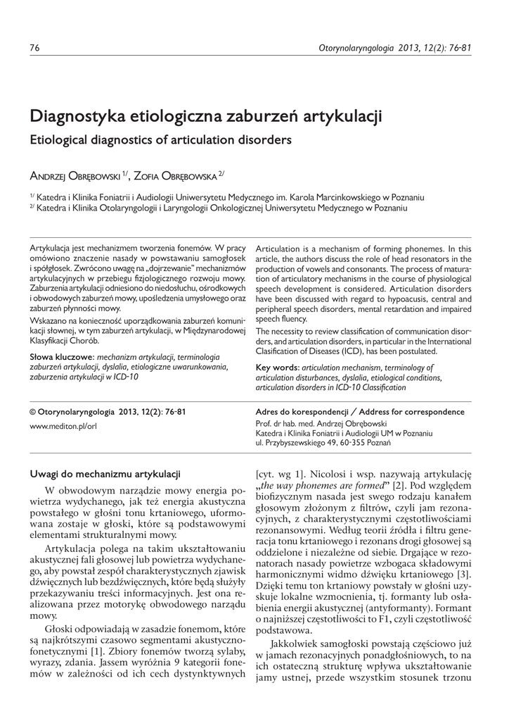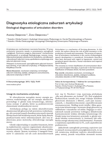 76 Otorynolaryngologia 2013, 12(2): 76-81 Diagnostyka etiologiczna zaburzeń artykulacji Etiological diagnostics of articulation disorders Andrzej Obrębowski 1/, Zofia Obrębowska 2/ 1/ 2/ Katedra i Klinika Foniatrii i Audiologii Uniwersytetu Medycznego im. Karola Marcinkowskiego w Poznaniu Katedra i Klinika Otolaryngologii i Laryngologii Onkologicznej Uniwersytetu Medycznego w Poznaniu Artykulacja jest mechanizmem tworzenia fonemów. W pracy omówiono znaczenie nasady w powstawaniu samogłosek i spółgłosek. Zwrócono uwagę na „dojrzewanie” mechanizmów artykulacyjnych w przebiegu fizjologicznego rozwoju mowy. Zaburzenia artykulacji odniesiono do niedosłuchu, ośrodkowych i obwodowych zaburzeń mowy, upośledzenia umysłowego oraz zaburzeń płynności mowy. Wskazano na konieczność uporządkowania zaburzeń komunikacji słownej, w tym zaburzeń artykulacji, w Międzynarodowej Klasyfikacji Chorób. Słowa kluczowe: mechanizm artykulacji, terminologia zaburzeń artykulacji, dyslalia, etiologiczne uwarunkowania, zaburzenia artykulacji w ICD-10 Articulation is a mechanism of forming phonemes. In this article, the authors discuss the role of head resonators in the production of vowels and consonants. The process of maturation of articulatory mechanisms in the course of physiological speech development is considered. Articulation disorders have been discussed with regard to hypoacusis, central and peripheral speech disorders, mental retardation and impaired speech fluency. The necessity to review classification of communication disorders, and articulation disorders, in particular in the International Clasification of Diseases (ICD), has been postulated. Key words: articulation mechanism, terminology of articulation disturbances, dyslalia, etiological conditions, articulation disorders in ICD-10 Classification © Otorynolaryngologia 2013, 12(2): 76-81 Adres do korespondencji / Address for correspondence www.mediton.pl/orl Prof. dr hab. med. Andrzej Obrębowski Katedra i Klinika Foniatrii i Audiologii UM w Poznaniu ul. Przybyszewskiego 49, 60-355 Poznań Uwagi do mechanizmu artykulacji [cyt. wg 1]. Nicolosi i wsp. nazywają artykulację „the way phonemes are formed” [2]. Pod względem biofizycznym nasada jest swego rodzaju kanałem głosowym złożonym z filtrów, czyli jam rezonacyjnych, z charakterystycznymi częstotliwościami rezonansowymi. Według teorii źródła i filtru generacja tonu krtaniowego i rezonans drogi głosowej są oddzielone i niezależne od siebie. Drgające w rezonatorach nasady powietrze wzbogaca składowymi harmonicznymi widmo dźwięku krtaniowego [3]. Dzięki temu ton krtaniowy powstały w głośni uzyskuje lokalne wzmocnienia, tj. formanty lub osłabienia energii akustycznej (antyformanty). Formant o najniższej częstotliwości to F1, czyli częstotliwość podstawowa. Jakkolwiek samogłoski powstają częściowo już w jamach rezonacyjnych ponadgłośniowych, to na ich ostateczną strukturę wpływa ukształtowanie jamy ustnej, przede wszystkim stosunek trzonu W obwodowym narządzie mowy energia powietrza wydychanego, jak też energia akustyczna powstałego w głośni tonu krtaniowego, uformowana zostaje w głoski, które są podstawowymi elementami strukturalnymi mowy. Artykulacja polega na takim ukształtowaniu akustycznej fali głosowej lub powietrza wydychanego, aby powstał zespół charakterystycznych zjawisk dźwięcznych lub bezdźwięcznych, które będą służyły przekazywaniu treści informacyjnych. Jest ona realizowana przez motorykę obwodowego narządu mowy. Głoski odpowiadają w zasadzie fonemom, które są najkrótszymi czasowo segmentami akustycznofonetycznymi [1]. Zbiory fonemów tworzą sylaby, wyrazy, zdania. Jassem wyróżnia 9 kategorii fonemów w zależności od ich cech dystynktywnych 77 Obrębowski A, Obrębowska Z. Diagnostyka etiologiczna zaburzeń artykulacji i nasady języka do podniebienia. W czasie artykułowania samogłosek nie dochodzi do powstawania dodatkowych drgań nieregularnych, a transformacja Fourniera wykazuje, że składowe harmoniczne w widmie akustycznym samogłosek są wielokrotnością częstotliwości podstawowej wytworzonej w głośni. Samogłoski określane są akustycznie przez pierwsze dwa formanty F1 i F2. Formanty wyższe nadają charakterystyczną osobniczo barwę dźwiękom. Przy koartykulacji dochodzi do zmiany częstotliwości formantowej danej samogłoski przez fonemy poprzedzające i następujące [4]. Spółgłoski natomiast są szmerami powstającymi w określonych miejscach jamy ustnej na skutek zwężeń i przeszkód stawianych fali głosowej lub powietrzu wydychanemu. Charakterystyka spółgłosek zależy od rodzaju pobudzenia, drogi przepływu powietrza lub fali akustycznej i typu przeszkody [5]. Jeżeli narządy artykulacyjne wytwarzają zwężenie to strumień powietrza przeciskając się przez nie wytwarza charakterystyczny dla danej głoski szmer. Powstają w ten sposób głoski szczelinowe. Jeżeli narządy artykulacyjne zwierają się, to pod wpływem narastającego ciśnienia w jamie ustnej napierającego na przeszkodę dochodzi do nagłego otwarcia tego zwarcia. Powstają głoski zwarte. Przy niepełnym zwarciu część powietrza z falą akustyczną przeciska się tworząc szmer, do którego dołącza się nagłe, wybuchowe otwarcie zwarcia. Powstają spółgłoski zwarto-szczelinowe. Turbulencje powietrza spowodowane drganiami końca języka z szybkością ok. 25/sekundę tworzą głoskę wibracyjną (r) [4,6]. Jeżeli przez niepełne zwarcie podniebiennogardłowe część energii akustycznej przy artykulacji dostanie się do jamy nosowej to zjawiska rezonansowe tworzą formanty nadające głoskom zabarwienie nosowe. Powstają samogłoski (ą, ę) lub spółgłoski nosowe (m, n, ń). W fizjologicznym rozwoju mowy spółgłoski języka polskiego powstają w określonych polach jamy ustnej zwanych strefami artykulacyjnymi. Wyróżnia się trzy zasadnicze strefy artykulacyjne,