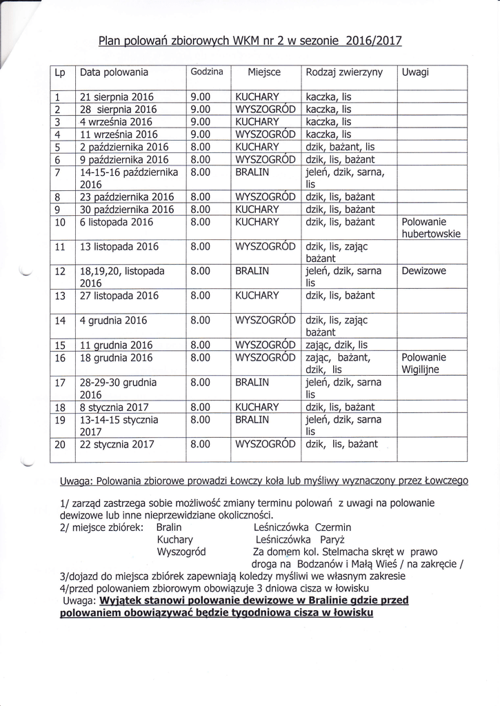 Plan polowań zbiorowych WKM nr 2 w sezonie 2016/2017 Data polowania Godzina 9 10 21 sierpnia 2016 28 sierpnia 20L6 4 września20L6 11 września 2016 2 oaździernika 2016 9 oaździernika 2016 14-15-16 października 2016 23 października 2016 30 oaździernika 2016 6 listopada 20L6 11 13 listopada 20L6 B.00 WYSZOGROD 12 B.00 BRALIN 13 IB,t9,20, listopada ż016 27 listopada 20L6 B.00 KUcHARY dzik, lis, bazant I4 4 grudnia 20t6 B.00 WYSZOGROD 15 11 orudnia 20L6 18 grudnia 20t6 B.00 B.00 WYSZOGROD WYSZOGROD dzik, lis, zając bazant zaiac, dzik. lis zając, bazant, B.00 BRALIN jeleń, dzik, sarna Lp 1 2 3 4 5 6 7 B 16 17 1B 19 20 28-29-30 9rudnia 2016 B sWcznia 20L7 13-14-15 stycznia 20L7 22 sĘcznia 2017 Miejsce Rodzaj zwierzyny Uwagi 9.00 9.00 9.00 9.00 B.00 B.00 B.00 KUcHARY WYSZOGROD KUCHARY WYSZOGROD KUCHARY WYSZOGROD BRALIN B.00 B.00 B.00 WYSZOGROD KUCHARY KUCHARY kaczka, lis kaczka. lis kaczka, lis kaczka, lis dzik, bażant. lis dzik, lis. bazant jeleń, dziĘ sarna, lis dzik. lis. bazant dzik. lis. bazant dzik, lis, bazant polowanie dzik, lis, zając bazant jeleń, dzik, sarna Dewizowe hubeńowskie lis dzik, lis polowanie wioiliine lis B.00 B.00 KUCHARY BRALIN dzik. lis. bazant jeleń, dzik, sarna lis B.00 WYSZOGROD dzik, lis, bażant Uwaga: Polowania zbiorowe prowadzi Łowczy koła lub myśliwy wyznaczony przez Łowczego Il zarząd zastrzega sobie mozliwośćzmiany terminu polowań z uwagi na polowanie dewizowe lub inne nieprzewidziane okoliczności. Leśniczówka Czermin 2/ miejsce zbiórek: Bralin Kuchary Wyszogród Leśniczówka Paryż ńi3:T5i§HTf,,fi:?.,fr;Ł:) 3ldojazd do miejsca zbiórek zapewniają koledzy myśliwi we własnym zakresie 4lprzed polowaniem zbiorowym obowiązuje 3 dniowa cisza w łowisku ,łu,l§r?,.ę.i. l