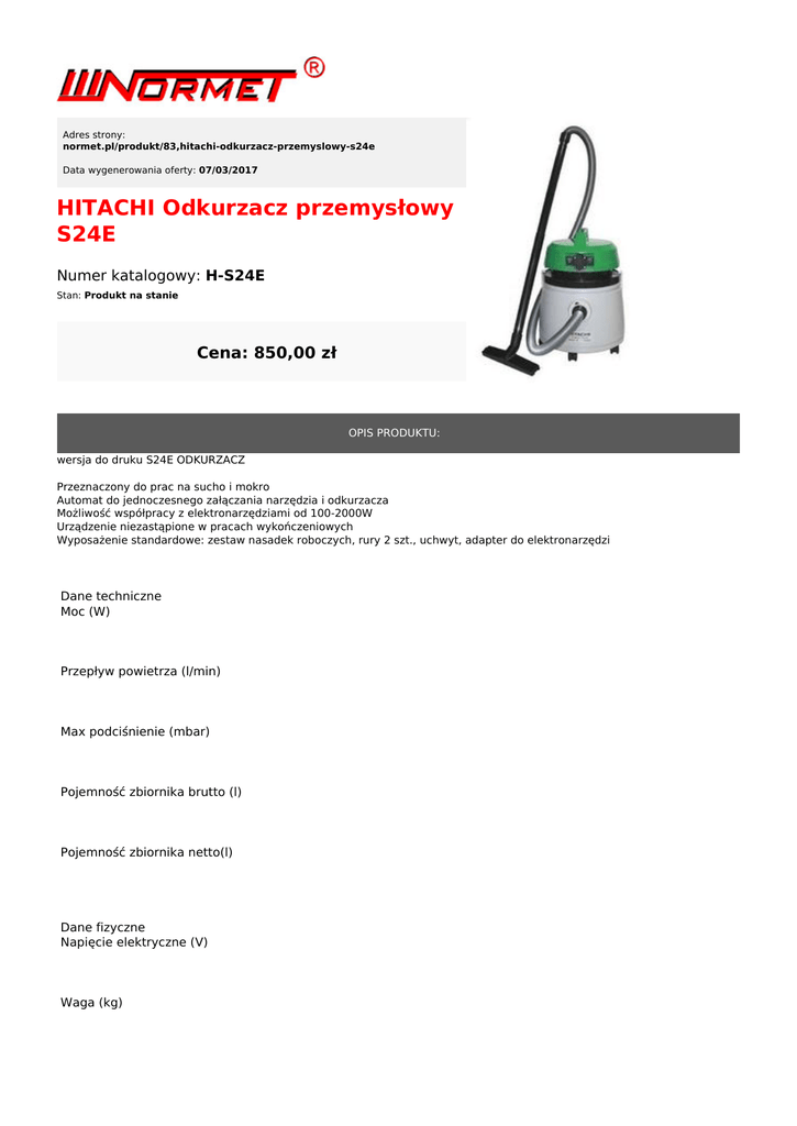 Adres strony: normet.pl/produkt/83,hitachi-odkurzacz-przemyslowy-s24e Data wygenerowania oferty: 07/03/2017 HITACHI Odkurzacz przemysłowy S24E Numer katalogowy: H-S24E Stan: Produkt na stanie Cena: 850,00 zł OPIS PRODUKTU: wersja do druku S24E ODKURZACZ Przeznaczony do prac na sucho i mokro Automat do jednoczesnego załączania narzędzia i odkurzacza Możliwość współpracy z elektronarzędziami od 100-2000W Urządzenie niezastąpione w pracach wykończeniowych Wyposażenie standardowe: zestaw nasadek roboczych, rury 2 szt., uchwyt, adapter do elektronarzędzi Dane techniczne Moc (W) Przepływ powietrza (l/min) Max podciśnienie (mbar) Pojemność zbiornika brutto (l) Pojemność zbiornika netto(l) Dane fizyczne Napięcie elektryczne (V) Waga (kg) Wyposażenie Gniazdko Praca na mokro Pliki do pobrania Instrukcje obsługi S24E (798.54 KB) Normet ul. św. Rocha 104, 42-202 Częstochowa NIP: 573-235-54-61 telefon: 34 319 44 45 e-mail: [email protected] Powered by TCPDF (www.tcpdf.org)