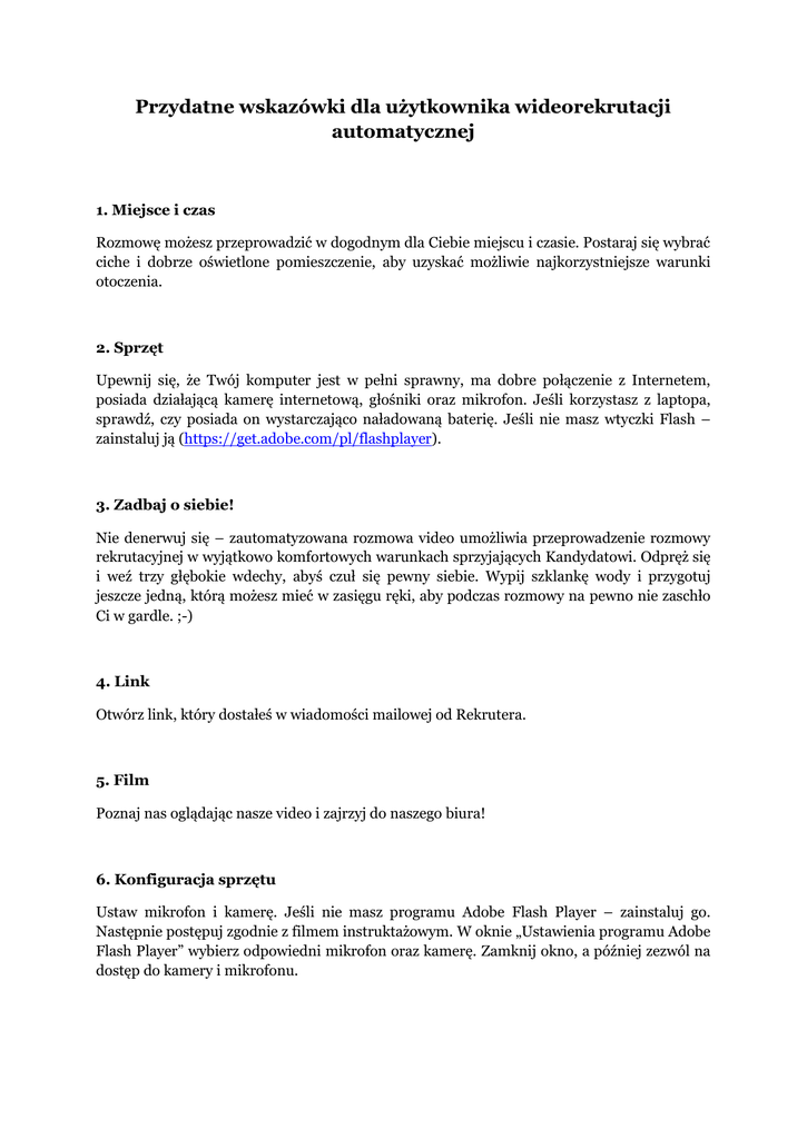 Przydatne wskazówki dla użytkownika wideorekrutacji automatycznej 1. Miejsce i czas Rozmowę możesz przeprowadzić w dogodnym dla Ciebie miejscu i czasie. Postaraj się wybrać ciche i dobrze oświetlone pomieszczenie, aby uzyskać możliwie najkorzystniejsze warunki otoczenia. 2. Sprzęt Upewnij się, że Twój komputer jest w pełni sprawny, ma dobre połączenie z Internetem, posiada działającą kamerę internetową, głośniki oraz mikrofon. Jeśli korzystasz z laptopa, sprawdź, czy posiada on wystarczająco naładowaną baterię. Jeśli nie masz wtyczki Flash – zainstaluj ją (https://get.adobe.com/pl/flashplayer). 3. Zadbaj o siebie! Nie denerwuj się – zautomatyzowana rozmowa video umożliwia przeprowadzenie rozmowy rekrutacyjnej w wyjątkowo komfortowych warunkach sprzyjających Kandydatowi. Odpręż się i weź trzy głębokie wdechy, abyś czuł się pewny siebie. Wypij szklankę wody i przygotuj jeszcze jedną, którą możesz mieć w zasięgu ręki, aby podczas rozmowy na pewno nie zaschło Ci w gardle. ;-) 4. Link Otwórz link, który dostałeś w wiadomości mailowej od Rekrutera. 5. Film Poznaj nas oglądając nasze video i zajrzyj do naszego biura! 6. Konfiguracja sprzętu Ustaw mikrofon i kamerę. Jeśli nie masz programu Adobe Flash Player – zainstaluj go. Następnie postępuj zgodnie z filmem instruktażowym. W oknie „Ustawienia programu Adobe Flash Player” wybierz odpowiedni mikrofon oraz kamerę. Zamknij okno, a później zezwól na dostęp do kamery i mikrofonu. 7. Test kamery i mikrofonu Nagraj próbne video. Obejrzyj je ponownie i oceń jakość nagrania. Jeśli jesteś zadowolony, wybierz zielony przycisk, jeśli nie, wybierz czerwony, dokonaj odpowiednich zmian i spróbuj ponownie. 8. Zgoda Zaznacz okienko po prawej stronie, aby zaakceptować zgodę na przetwarzanie nagrania i wybierz przycisk „kontynuuj”. 9. Pytanie Wysłuchaj dokładnie pytania Rekrutera. 10. Odpowiedź Weź głęboki oddech i nagraj swoją odpowiedź! Możesz ocenić jak wypadłeś, oglądając swoje video. Teraz przejdź do następnego pytania! Powtórz punkty 10 i 11 tyle razy, ile pytań przygotował dla Ciebie Rekruter. 11. Brawo! Właśnie odpowiedziałeś na wszystkie pytania. W celu zakończenia rozmowy wybierz odpowiedni przycisk.