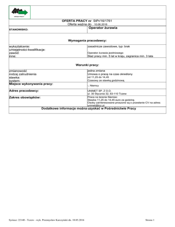 OFERTA PRACY nr StPr/16/1761 Oferta ważna do 10.06.2016 Operator żurawia STANOWISKO: Wymagania pracodawcy: wykształcenie: umiejętności-kwalifikacje: zawód: inne: zasadnicze zawodowe, typ: brak Operator żurawia jezdniowego Staż pracy min. 5 lat w kraju, zagranica min. 3 lata Warunki pracy: zmianowość rodzaj zatrudnienia stawka: system: Miejsce wykonywania pracy: jedna zmiana Umowa o pracę na czas określony Adres pracodawcy: UNIMET SP. Z O.O. ul. 30 Stycznia 32, 83-110 Tczew Praca na terenie Niemiec Stawka 11,25 do 14,45 euro za godzinę. Osoby zainteresowane proszone są o przesłanie CV na adres: [email protected] Zakres obowiązków: od 11,25 do 14,45 Czasowy ze stawką godzinową -, Niemcy Dodatkowe informacje można uzyskać w Pośrednictwie Pracy Syriusz: 22140 - Tczew - wyk. Przemysław Karczyński dn. 10.05.2016 Strona 1