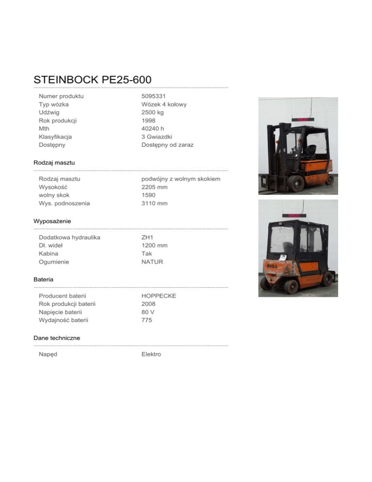 STEINBOCK PE25-600 Numer produktu Typ wózka Udźwig Rok produkcji Mth Klasyfikacja Dostępny 5095331 Wózek 4 kołowy 2500 kg 1998 40240 h 3 Gwiazdki Dostępny od zaraz Rodzaj masztu Rodzaj masztu Wysokość wolny skok Wys. podnoszenia podwójny z wolnym skokiem 2205 mm 1590 3110 mm Wyposażenie Dodatkowa hydraulika Dł. wideł Kabina Ogumienie ZH1 1200 mm Tak NATUR Bateria Producent baterii Rok produkcji baterii Napięcie baterii Wydajność baterii HOPPECKE 2008 80 V 775 Dane techniczne Napęd Elektro