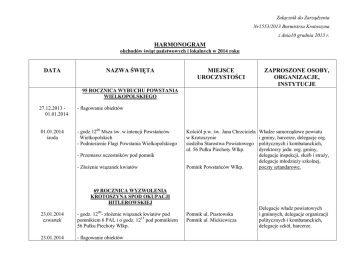 Załącznik do Zarządzenia Nr1553/2013 Burmistrza Krotoszyna z dnia10 grudnia 2013 r. HARMONOGRAM obchodów świąt państwowych i lokalnych w 2014 roku DATA NAZWA ŚWIĘTA MIEJSCE UROCZYSTOŚCI ZAPROSZONE OSOBY, ORGANIZACJE, INSTYTUCJE 95 ROCZNICA WYBUCHU POWSTANIA WIELKOPOLSKIEGO 27.12.2013 01.01.2014 - flagowanie obiektów 01.01.2014 środa - godz.1200 Msza św. w intencji Powstańców Wielkopolskich - Podniesienie Flagi Powstania Wielkopolskiego Kościół p.w. św. Jana Chrzciciela w Krotoszynie siedziba Starostwa Powiatowego ul. 56 Pułku Piechoty Wlkp. - Przemarsz uczestników pod pomnik - Złożenie wiązanek kwiatów Pomnik Powstańców Wlkp. Władze samorządowe powiatu i gminy, harcerze, delegacje org. politycznych i kombatanckich, dyrektorzy jedn. org. gminy, delegacje inspekcji, służb i straży, delegacje młodzieży szkolnej, poczty sztandarowe. 69 ROCZNICA WYZWOLENIA KROTOSZYNA SPOD OKUPACJI HITLEROWSKIEJ 23.01.2014 czwartek - godz. 1200- złożenie wiązanek kwiatów pod pomnikiem 6 PAL i o godz. 1215 pod pomnikiem 56 Pułku Piechoty Wlkp. 23.01.2014 - flagowanie obiektów Pomnik ul. Piastowska Pomnik ul. Mickiewicza Delegacje władz powiatowych i gminnych, delegacje organizacji politycznych i kombatanckich, delegacje szkół, harcerze. DZIEŃ ZOŁNIERZY WYKLĘTYCH 1.03.2014 sobota - flagowanie obiektów - godz. 1200 -złożenie wiązanek kwiatów pod Tablicą Więźniów Politycznych Okresu Stalinowskiego - godz. 1230 -złożenie wiązanek kwiatów pod pomnikiem poległych w bitwie pod Benicami w 1946r. ul. Sienkiewicza Cmentarz Władze samorządowe powiatu i gminy, delegacje organizacji politycznych i kombatanckich, młodzież szkolna, harcerze. 74 ROCZNICA ZBRODNI KATYŃSKIEJ 11.04.2014 piątek - godz. 1200 apel pamięci oraz złożenie wiązanek kwiatów 27.04.2014 niedziela Kanonizacja Papieża Jana Pawła II Cmentarz - Krzyż Katyński Władze samorządowe powiatu i gminy, delegacje organizacji politycznych i kombatanckich, młodzież szkolna, harcerze. OBCHODY ŚWIĄT MAJOWYCH 1.05.2014 czwartek 2.05.2014 piątek 3.05.2014 sobota 1.05 – 3.05.2014 - zawieszenie flagi państwowej na Ratuszu Rynek - Ratusz - Święto Flagi - godz. 1130 Uroczysta Msza Św. połączona z częścią artystyczną z okazji rocznicy uchwalenia Konstytucji 3-go Maja Kościół p.w. Błogosławionego Biskupa Kozala w Krotoszynie Władze samorządowe powiatu i gminy, delegacje organizacji politycznych i kombatanckich, dyrektorzy jedn. org. gminy, młodzież szkolna, harcerze, delegacje inspekcji, służb i straży, poczty sztandarowe. - po Mszy Św. złożenie wiązanek kwiatów pod tablicą upamiętniającą rocznicę uchwalenia Konstytucji Skwerek u zbiegu ulic Konstytucji 3 Maja i Mickiewicza Władze samorządowe powiatu i gminy, delegacje organizacji politycznych i kombatanckich, młodzież szkolna, harcerze. - flagowanie obiektów 69 ROCZNICA ZWYCIĘSTWA NAD FASZYZMEM 8.05.2014 czwartek - godz. 1200 złożenie wiązanek kwiatów pod Pomnikiem Wolności oraz 6 PAL 8.05.2014 - flagowanie obiektów Plac Jana Pawła II Pomnik ul. Piastowska Delegacje władz powiatowych i gminnych, delegacje organizacji politycznych i kombatanckich, delegacje szkół, harcerze. Kościół p.w. św. Jana Chrzciciela w Krotoszynie Władze samorządowe powiatu i gminy, delegacje organizacji politycznych i kombatanckich, dyrektorzy jedn. org. gminy, młodzież szkolna, harcerze, delegacje inspekcji, służb i straży, poczty sztandarowe. DZIEŃ EUROPY 9.05.2014 piątek - flagowanie obiektów (flaga państwowa, flaga Unii Europejskiej) ŚWIĘTO PATRONA MIASTA I GMINY KROTOSZYN 15.06.2014 niedziela - godz. 1200 Uroczysta Msza Święta. NARODOWY DZIEŃ PAMIĘCI POWSTANIA WARSZAWSKIEGO 1.08.2014 piątek - flagowanie obiektów - włączenie syren o godz. 1700 ZWYCIĘSTWO ORĘŻA POLSKIEGO W BITWIE WARSZAWSKIEJ 15.08.2014 piątek - godz. 1200 złożenie wiązanek kwiatów przy Pomniku 56 Pułku Piechoty Wlkp. 15.08.2014 - flagowanie obiektów. ul. Mickiewicza Delegacje władz powiatowych i gminnych, delegacje organizacji politycznych i kombatanckich, delegacje młodzieży, harcerze. - godz. 1030 Tablica upamiętniająca przywódców Polskiego Państwa Podziemnego Rynek - Ratusz Władze samorządowe powiatu i gminy, Zespół Szkół Nr 3 oraz Zespołu Szkół Nr 2 z Oddziałami Integracyjnymi. - godz. 1045 Tablica upamiętniająca nalot niemieckiego lotnictwa na pociąg ewakuacyjny w Kole Skraj parku przy ul. Dworcowej Władze samorządowe gminy, Zespół Szkół Nr 1 z Oddziałami Integracyjnymi, Szkoła Podstawowa Nr 8. DZIEŃ SOLIDARNOŚCI I WOLNOŚCI 31.08.2014 niedziela - flagowanie obiektów 75 ROCZNICA WYBUCHU II WOJNY ŚWIATOWEJ 01.09.2014 poniedziałek Złożenie wiązanek kwiatów w miejscach pamięci: - godz. 1045 Pomnik 56 Pułku Piechoty Wlkp. ul. Mickiewicza Władze samorządowe powiatu, Zespół Szkół Ponadgimnazjalnych Nr 1, Gimnazjum Nr 4. - godz. 1040 Pomnik 6 PAL ul. Piastowska Związek Kombatantów RP, Zespół Szkół Ponadgimnazjalnych Nr 2, Szkoła Podstawowa Nr 4. - godz. 1040 Szaniec Pamięci Żołnierzy 56 Pułku Piechoty Wlkp. ul. Gajowa Gimnazjum nr 2, I LO im. H. Kołłątaja, Komenda Hufca ZHP. - godz. 1040 Tablica Więźniów Politycznych Okresu Stalinowskiego ul. Sienkiewicza Związek Więźniów Politycznych i Poszkodowanych Okresu Stalinowskiego, Zespół Szkół Ponadgimnazjalnych Nr 3. - godz. 1100 Msza Św. w 75. rocznicę wybuchu wojny oraz w intencji krotoszyńskiej oświaty. Kościół p.w. św. Andrzeja Boboli Władze samorządowe powiatu i gminy, delegacje organizacji w Krotoszynie politycznych i kombatanckich, dyrektorzy jedn. org. gminy, młodzież szkolna, harcerze, Szkoła Podstawowa Nr 4 w delegacje inspekcji, służb i straży, Krotoszynie poczty sztandarowe. - godz. 1200 uroczystość inauguracji roku szkolnego 2014/2015 1.09.2014 2.09.2014 wtorek - flagowanie obiektów Uroczystość odsłonięcia pomnika ofiar nalotu niemieckiego lotnictwa 2 września 1939 r. na po