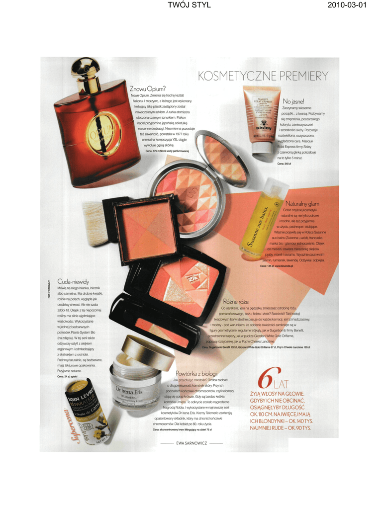 TWÓJ STYL 2010-03-01 CZNE PREMIER Znowu Opium? Nowe Opium. Zmienia się trochę kształt flakonu. I tworzywo, z którego jest wykonany. No jasne! i \ri<i ss Imitujący lakę plastik zastąpiony został Zaczynamy wiosenne nowoczesnym szkłem, A rurka atomizera 1 porządki... z twarzą. Pozbywamy otoczona czarnym sznurkiem. Flakon się zmęczenia, poszarzałego nadal przypomina japońską szkatułkę kolorytu, zanieczyszczeń na cenne drobiazgi. Niezmienna pozostaje • też zawartość, powstała w 1977 roku i szorstkości skóry. Pozostaje rozświetlona, oczyszczona, orientalna kompozycja YSL ciągle ^gładzona cera. Masque wywołuje gęsią skórkę. olat Express firmy Sisley Cena: 375 zt/50 ml wody perfumowanej z czerwoną glinką potrzebuje na to tylko 5 minut. Cena: 340 zt Naturalny glam Coraz częściej kosmetyki naturalne są nie tylko zdrowe i modne, ale też przyjemne w użyciu, pachnące i otulające. Właśnie pojawiła się w Polsce Suzanne aux bains (Zuzanna u wód), francuska marka bio i glamour jednocześnie. Olejek do masażu zawiera mieszankę olejków jojoby, moreli i sezamu. Wyraźnie czuć w nim jaśmin, rumianek, lawendę. Odżywia i odpręża. Cena: 145 zl, www.biouroda.pl Cuda-niewidy Mówią na niego Inianka, Inicznik albo camelina. Ma drobne kwiatki rośnie na polach, wygląda jak Różne róże urodziwy chwast. Ale nie szata Co uzyskasz, jeśli na pędzelku zmieszasz odrobinę różu, zdobi itd. Olejek z tej niepozornej pomarańczowego, beżu, fioletu i złota? Świeżość! Taki koktajl rośliny ma silnie ujędrniające twarzowych barw idealnie pasuje do każdej karnacji, jest ponadczasowy, właściwości. Wykorzystane modny - pod warunkiem, że odcienie świeżości zamknięte są w w jednej z bezbarwnych gury geometryczne: regularne trójkąty, jak w Sugarbomb firmy Benefit, pomadek Plante System Bio •^przestrzenne trapezy, jak w pudrze Giordani White Gold Oriflame, (na zdjęciu). W tej serii także popowa rozsypankę, jak w Pop'n Cheeks Lancóme. odżywczy sztyft z olejkiem arganowym i odmładzający Ceny: Sugarbomb Benefit 132 zl, Giordani White Gold Oriflame 67 zl, Pop'n Cheeks Lancóme 185 zt z ekstraktem z orchidei. Pachną naturalnie, są bezbarwne, mają tekturowe opakowania. Przyjazne naturze. Powtórka z biologii Cena: 24 zł, apteki Jak przedłużyć młodość? Trzeba zadbać , &*£4 o długowieczność komórek skóry. Przy ich podziałach końcówki chromosomów, czyli telomery, na Eris stają się coraz krótsze. Gdy są bardzo krótkie, MERIC lih w a n v '<rem *lJS8"iTY A °CHRONV • komórka umiera. To odkrycie zostało nagrodzone Nagrodą Nobla. I wykorzystane w najnowszej serii kosmetyków Dr Irena Eris. Kremy Telomeric zawierają V opatentowany składnik, który ma chronić końcówki chromosomów. Dla kobiet po 60. roku życia. Cena: skoncentrowany krem liftingujący na dzień 75 zt EWASARNOWICZ &M ŻYJĄ WŁOSY NA GŁOWIE. GDYBY ICH NIE OBCINAĆ, OSIĄGNĘŁYBY DŁUGOŚĆ OK. 110 CM. NAJWIĘCEJ MAJĄ ICH BLONDYNKI - OK. 140 TYS. NAJMNIEJ RUDE-OK. 90 TYS.