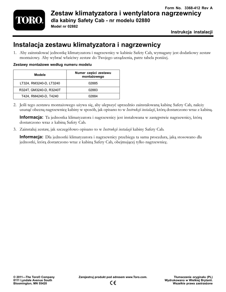 Form No. 3368-412 Rev A Zestaw klimatyzatora i wentylatora nagrzewnicy dla kabiny Safety Cab - nr modelu 02880 Model nr 02882 Instrukcja instalacji Instalacja zestawu klimatyzatora i nagrzewnicy 1. Aby zainstalować jednostkę klimatyzatora i nagrzewnicy w kabinie Safety Cab, wymagany jest dodatkowy zestaw montażowy. Aby wybrać właściwy zestaw do Twojego urządzenia, patrz tabela poniżej. Zestawy montażowe według numeru modelu Modele Numer części zestawu montażowego LT324, RM3240-D, LT3240 02885 R324T, GM3240-D, R3240T 02883 T424, RM4240-D, T4240 02884 2. Jeśli tego zestawu montażowego używa się, aby ulepszyć uprzednio zainstalowaną kabinę Safety Cab, należy usunąć obecną nagrzewnicę kabiny w sposób, jak opisano to w Instrukcji instalacji, którą dostarczono wraz z kabiną. Informacja: Ta jednostka klimatyzatora i nagrzewnicy jest instalowana w zastępstwie nagrzewnicy, którą dostarczono wraz z kabiną Safety Cab. 3. Zainstaluj zestaw, jak szczegółowo opisano to w Instrukcji instalacji kabiny Safety Cab. Informacja: Dla jednostki klimatyzatora i nagrzewnicy przebiega ta sama procedura, jaką stosowano dla jednostki, którą dostarczono wraz z kabiną Safety Cab, obejmującej tylko nagrzewnicę. © 2011—The Toro® Company 8111 Lyndale Avenue South Bloomington, MN 55420 Zarejestruj produkt pod adresem www.Toro.com. Tłumaczenie oryginału (PL) Wydrukowano w Wielkiej Brytanii. Wszelkie prawa zastrzeżone Notatki: 2 Lista międzynarodowych dystrybutorów Dystrybutor: Atlantis Su ve Sulama Sisstemleri Lt Balama Prima Engineering Equip. B-Ray Corporation Casco Sales Company Ceres S.A. CSSC Turf Equipment (pvt) Ltd. Cyril Johnston & Co. Equiver Femco S.A. G.Y.K. Company Ltd. Geomechaniki of Athens Guandong Golden Star Hako Ground and Garden Hako Ground and Garden Hayter Limited (U.K.) Hydroturf Int. Co Dubai Hydroturf Egypt LLC Ibea S.P.A. Irriamc Irrigation Products Int'l Pvt Ltd. Jean Heybroek b.v. Lely (U.K.) Limited Maquiver S.A. Maruyama Mfg. Co. Inc. Metra Kft Mountfield a.s. Munditol S.A. Oslinger Turf Equipment SA Oy Hako Ground and Garden Ab Parkland Products Ltd. Prochaska & Cie RT Cohen 2004 Ltd. Riversa Roth Motorgerate GmBh & Co. Sc Svend Carlsen A/S Solvert S.A.S. Spypros Stavrinides Limited Surge Systems India Limited T-Markt Logistics Ltd. Toro Australia Toro Europe BVBA Kraj: Turcja Hong Kong Korea Portoryko Kostaryka Sri Lanka Irlandia Północna Meksyk Gwatemala Japonia Grecja Chiny Szwecja Norwegia Wielka Brytania Zjednoczone Emiraty Arabskie Egipt Włochy Portugalia Indie Holandia Wielka Brytania Kolumbia Japonia Węgry Czechy Argentyna Ekwador Finlandia Nowa Zelandia Austria Izrael Hiszpania Niemcy Dania Francja Cypr Indie Węgry Australia Belgia Numer telefonu: 90 216 344 86 74 852 2155 2163 82 32 551 2076 787 788 8383 506 239 1138 94 11 2746100 44 2890 813 121 52 55 539 95444 502 442 3277 81 726 325 861 30 10 935 0054 86 20 876 51338 46 35 10 0000 47 22 90 7760 44 1279 723 444 97 14 347 9479 202 519 4308 39 0331 853611 351 21 238 8260 86 22 83960789 31 30 639 4611 44 1480 226 800 57 1 236 4079 81 3 3252 2285 36 1 326 3880 420 255 704 220 54 11 4 821 9999 593 4 239 6970 358 987 00733 64 3 34 93760 43 1 278 5100 972 986 17979 34 9 52 83 7500 49 7144 2050 45 66 109 200 33 1 30 81 77 00 357 22 434131 91 1 292299901 36 26 525 500 61 3 9580 7355 32 14 562 960 374-0269 Rev B Kompleksowa gwarancja Toro Ograniczona gwarancja Warunki i produkty objęte gwarancją Company i jej firma zależna, Toro Warranty Company, na mocy zawartego porozumienia wspólnie gwarantują, że Twój produkt komercyjny Toro (Produkt”) będzie wolny od wad materiałowych i wykonania przez okres dwóch lat lub 1500 godzin użytkowania, zależnie od tego, który z nich minie wcześniej. Niniejsza gwarancja ma zastosowanie do wszystkich produktów z wyjątkiem aeratorów (patrz osobne klauzule gwarancyjne na te produkty). Jeżeli spełnione są warunki gwarancji, Produkt zostanie przez nas naprawiony bezpłatnie (dotyczy to także diagnostyki, robocizny, części i transportu). Gwarancja rozpoczyna się w dniu dostawy Produktu do pierwszego nabywcy detalicznego. * Dotyczy Produktów wyposażonych w licznik godzin. należą m.in. pogoda, praktyki przechowywania, zanieczyszczenia, stosowanie niedozwolonych środków chłodzących, smarów, dodatków, nawozów, wody, substancji chemicznych itp. Toro® Instrukcja korzystania z serwisu gwarancyjnego Użytkownik jest odpowiedzialny za natychmiastowe powiadomienie dystrybutora lub sprzedawcy produktów komercyjnych, u którego zakupił Produkt, o istnieniu warunków spełniających wymagania gwarancyjne. Jeśli potrzebujesz pomocy w zlokalizowaniu dystrybutora lub autoryzowanego sprzedawcy albo masz pytania dotyczące praw lub obowiązków gwarancyjnych, możesz skontaktować się z nami: Commercial Products Service Department Toro Warranty Company 8111 Lyndale Avenue South Bloomington, MN 55420-1196 E-mail: [email protected] Obowiązki właściciela Jako właściciel Produktu jesteś odpowiedzialny za przeprowadzanie wymaganych czynności konserwacyjnych i regulacyjnych opisanych w Instrukcji obsługi. Niewykonywanie wymaganych czynności konserwacyjnych i regulacyjnych może być podstawą do odrzucenia roszczeń gwarancyjnych. Elementy i sytuacje nie objęte gwarancją Nie wszystkie uszkodzenia i usterki Produktu, które wystąpią w okresie gwarancyjnym, są wadami materiałowymi lub wykonania. Niniejsza wyrażona gwarancja nie obejmuje: • Uszkodzeń Produktu wynikających z korzystania z nieoryginalnych części zamiennych Toro, instalacji i korzystania z dodatkowego wyposażenia oraz zmodyfikowanych akcesoriów i produktów marek innych niż Toro. Na te elementy producent może udzielić osobnej gwarancji. • • Normalnego hałasu, wibracji, zużycia i pogorszenia działania. Normalne zużycie obejmuje m.in. uszkodzenia foteli w wyniku zużycia lub przetarcia, zużycie powierzchni malowanych, rysy na naklejkach i szybach i