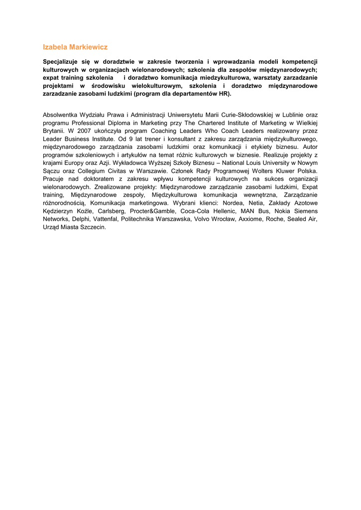 Izabela Markiewicz Specjalizuje się w doradztwie w zakresie tworzenia i wprowadzania modeli kompetencji kulturowych w organizacjach wielonarodowych; szkolenia dla zespołów międzynarodowych; expat training szkolenia i doradztwo komunikacja miedzykulturowa, warsztaty zarzadzanie projektami w środowisku wielokulturowym, szkolenia i doradztwo międzynarodowe zarzadzanie zasobami ludzkimi (program dla departamentów HR). Absolwentka Wydziału Prawa i Administracji Uniwersytetu Marii Curie-Skłodowskiej w Lublinie oraz programu Professional Diploma in Marketing przy The Chartered Institute of Marketing w Wielkiej Brytanii. W 2007 ukończyła program Coaching Leaders Who Coach Leaders realizowany przez Leader Business Institute. Od 9 lat trener i konsultant z zakresu zarządzania międzykulturowego, międzynarodowego zarządzania zasobami ludzkimi oraz komunikacji i etykiety biznesu. Autor programów szkoleniowych i artykułów na temat różnic kulturowych w biznesie. Realizuje projekty z krajami Europy oraz Azji. Wykładowca Wyższej Szkoły Biznesu – National Louis University w Nowym Sączu oraz Collegium Civitas w Warszawie. Członek Rady Programowej Wolters Kluwer Polska. Pracuje nad doktoratem z zakresu wpływu kompetencji kulturowych na sukces organizacji wielonarodowych. Zrealizowane projekty: Międzynarodowe zarządzanie zasobami ludzkimi, Expat training, Międzynarodowe zespoły, Międzykulturowa komunikacja wewnętrzna, Zarządzanie różnorodnością, Komunikacja marketingowa. Wybrani klienci: Nordea, Netia, Zakłady Azotowe Kędzierzyn Koźle, Carlsberg, Procter&Gamble, Coca-Cola Hellenic, MAN Bus, Nokia Siemens Networks, Delphi, Vattenfal, Politechnika Warszawska, Volvo Wrocław, Axxiome, Roche, Sealed Air, Urząd Miasta Szczecin.