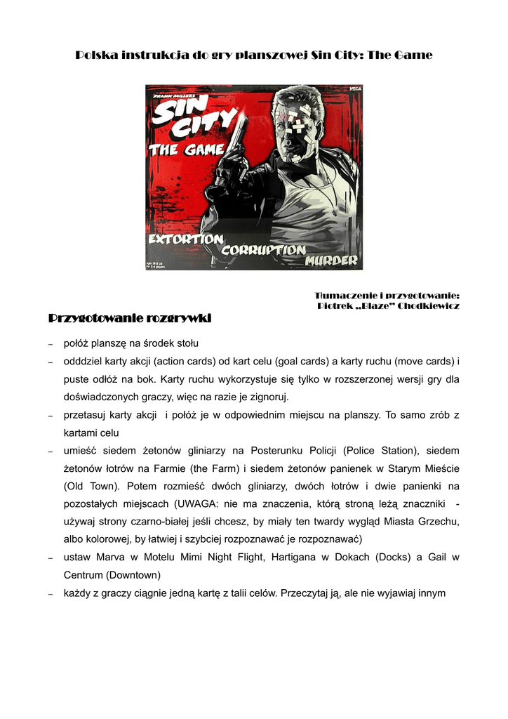 Polska instrukcja do gry planszowej Sin City: The Game Tłumaczenie i przygotowanie: Piotrek „Blaze” Chodkiewicz Przygotowanie rozgrywki – połóż planszę na środek stołu – odddziel karty akcji (action cards) od kart celu (goal cards) a karty ruchu (move cards) i puste odłóż na bok. Karty ruchu wykorzystuje się tylko w rozszerzonej wersji gry dla doświadczonych graczy, więc na razie je zignoruj. – przetasuj karty akcji i połóż je w odpowiednim miejscu na planszy. To samo zrób z kartami celu – umieść siedem żetonów gliniarzy na Posterunku Policji (Police Station), siedem żetonów łotrów na Farmie (the Farm) i siedem żetonów panienek w Starym Mieście (Old Town). Potem rozmieść dwóch gliniarzy, dwóch łotrów i dwie panienki na pozostałych miejscach (UWAGA: nie ma znaczenia, którą stroną leżą znaczniki - używaj strony czarno-białej jeśli chcesz, by miały ten twardy wygląd Miasta Grzechu, albo kolorowej, by łatwiej i szybciej rozpoznawać je rozpoznawać) – ustaw Marva w Motelu Mimi Night Flight, Hartigana w Dokach (Docks) a Gail w Centrum (Downtown) – każdy z graczy ciągnie jedną kartę z talii celów. Przeczytaj ją, ale nie wyjawiaj innym – na samym końcu przekaż Gladys (spluwa Marva) najstarszemu graczowi, albo temu, który zabił najwięcej ludzi w swoim życiu. Gladys ma przypominać, czyja właśnie jest kolejka. Jeśli ją masz, to znaczy, że twoja. Rozgrywka Każda runda składa się z dwóch faz: rozstawiania i akcji. W fazie rozstawiania gliniarze wychodzą z Posterunku na patrol rewirów i zbieranie łapówek, łotry wychodzą z farmy i wykonują brudną robotę dla szefów, a panienki ze Starego Miasta wyruszają w interesach. Potem nadchodzi faza druga – zaczyna się akcja, bohaterowie atakują, ludzie giną. Takie jest życie w Mieście Grzechu. Każdy z graczy ma własną, tajną kartę celu. Czyli roboty do wykonania. Po osiągnięciu celu, ciągnie się kolejny. Pierwszy z graczy, który osiągnie trzy cele, wygrywa. Faza pierwsza: Rozstawianie Zaczyna gracz, który ma Gladys. Załóżmy, że posiadasz ją ty, czytajacy te słowa. Musisz wykonać jedną (i tylko jedną) z następujących akcji: 1) Zabrać gliniarza z Posterunku Policji i położyć go na dowolnym innym polu w mieście 2) Zabrać łotra z Farmy i położyć go na dowolnym innym polu w mieście 3) Zabrać panienkę ze Starego Miasta i położyć ją na dowolnym innym polu w mieście PODPOWIEDŹ 1: Sprawdź swój cel na karcie i próbuj przekładać znaczniki, tak by go osiągnąć Gdy skończysz, gracz po twojej lewej stronie musi wykonać jedną z trzech powyższych akcji. A potem następny i następny, itd. PODPOWIEDŹ 2: Czasem dobrze jest wykonywać posunięcia nie prowadzące do osiągnięcia celu, bo wtedy innym graczom trudniej jest zgadnąć do czego dążysz. Jest tu jednak pewien haczyk: Nie można zabrać policjanta z Posterunku, jeśli jest ich tam mniej niż pięciu. Jeśli łotrów na Farmie jest mniej niż pięciu również łotra zabrać nie możesz. I jeśli mniej niż pięć panienek znajduje się w Starym Mieście, nie możesz zabrać panienki. Nikt nie lubi zostawiać swojego terenu bez obrony. Kolejka przechodzi z gracza na gracza dopóki jednocześnie na Posterunku nie znajdzie się mniej niż pięciu gliniarzy, na Farmie mniej niż pięciu łotrów i mniej niż pięć panienek w Starym Mieście. W tym momencie kończy się rozstawianie i zaczyna faza druga. Faza druga: akcja Gracz trzymający Gladys ciągnie pierwszą kartę z góry talii akcji i czyta ją na głos. Znów zakładamy, że jesteś nim ty. Wykonaj instrukcje w kolejności, w jakiej są zapisane na karcie. Najprościej będzie czytać po jednym kawałku na raz, wykonać związaną z nim instrukcję, a potem przejść do następnego. Po wykonaniu wszystkiego, co zapisane na karcie, odrzucasz ją. Skończyła się twoja runda. Ataki Większość kart akcji stwierdza, że co najmniej jeden z bohaterów (Marv, Hartigan, lub Gail) „atakuje”. Oznacza to, że przemieszcza się po planszy i zabija ludzi po dotarciu na miejsce. Oto jak przeprowadza się atak: Rzuć kością i przesuń postać o tyle pól ile wypadło oczek. Możesz poruszyć się zgodnie ze wskazówkami zegara, albo przeciwnie do nich, ale cały czas tylko w jednym kierunku, nie zawracając w trakcie ruchu. Gdy bohater dotrze na miejsce ma z reguły miejsce niezła jatka. MARV zabija wszystkich gliniarzy i łotrów z pola na którym wylądował, ale panienki zostawia w spokoju. Żetony zabitych przenosi się na środek planszy (nazywamy tę część „liczydełkiem”) HARTIGAN zabija wszystkich gliniarzy na swoim polu a panienki odsyła bezpiecznie do Starego Miasta. Nienawidzi go wielu gliniarzy, jeszcze z czasów, gdy był jednym z nich, ale nawet najgłupszy z łotrów zostawia mu spore pole do działania. GAIL zabija wszystkich łotrów na swoim polu, a panienki odsyła bezpiecznie do Starego Miasta. Bawią ją bijatyki i lubi dowodzić, ale nie chce kłopotów z prawem. Koniec rundy Po wykonaniu wszystkich instrukcji na karcie akcji, każdy sprawdza czy osiągnął swój cel. Wszyscy spełniający warunki na swojej karcie celu wykładają ją na stół koszulką do dołu i ciągną kolejną. Jeśli jacyś gracze mają w tej chwili przed sobą trzy odsłonięte karty celu, gra kończy się ich zwycięstwem! Jeśli jednak nie wyłoniony został zwycięzca, przełóż wszystkich gliniarzy z liczydełka na Posterunek, łotrów na Farmę, a panienki do Starego Miasta. Nie wracają do życia. Po prostu każdego dnia pojawia się ich w Mieście Grzechu coraz więcej. Przekaż Gladys graczowi po lewej stronie i zacznijcie nową rundę. Gra toczy się do chwili, gdy ktoś zrealizuje trzy cele. Warianty zasad dla doświadczonych graczy Oto opcjonalne zasady do wykorzystania w waszych rozgrywkach Sin City. Radzimy rozpocząć granie w wariancie „karty ruchu” gdy tylko dobrze zaznajomicie się z ro
