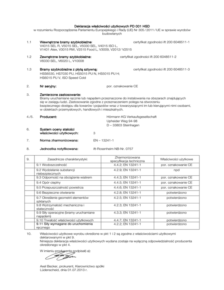 Deklaracja właściwości użytkowych PD 001 HSD w rozumieniu Rozporządzenia Parlamentu Europejskiego i Rady (UE) Nr 305 / 2011 / UE w sprawie wyrobów budowlanych 1.1 Wewnętrzne bramy szybkobieżne: certyfikat zgodności ift 200 6048511-1 szybkobieżne V4015 SEL R, V5015 SEL, V5030 SEL, V4015 ISO L, V1401 Atex, V3015 RW, V2515 Food L, V3009, V2012/ V2515 1.2 Zewnętrzne bramy szybkobieżne: V6030 SEL, V6020 L, V10008 1.3 Bramy szybkobieżne z płytą sztywną: HSS6530, HS7030 PU, HS5015 PU N, HS5015 PU H; HS6015 PU V, ISO Speed Cold 2. Nr seryjny: 3. Zamierzone zastosowanie: Bramy uruchamiane ręcznie lub napędem przeznaczone do instalowania na obszarach znajdujących się w zasięgu ludzi. Zastosowanie zgodne z przeznaczeniem polega na stworzeniu bezpiecznego dostępu dla towarów i pojazdów wraz z towarzyszącymi im lub kierującymi nimi osobami, w obiektach przemysłowych, handlowych i mieszkalnych. 4./5. Producent: 6. System oceny stałości właściwości użytkowych: użytkowych: 3 7. Norma zharmonizowana: EN – 13241-1 8. Jednostka notyfikowana: ift-Rosenheim NB-Nr. 0757 9. certyfikat zgodności ift 200 6048511-2 por. oznakowanie CE Hörmann KG Verkaufsgesellschaft Upheider Weg 94-98 D – 33803 Steinhagen Zasadnicze charakterystyki: 9.1 Wodoszczelność 10. certyfikat zgodności ift 200 6048511-3 Zharmonizowana specyfikacja techniczna 4.4.2; EN 13241-1 Właściwości użytkowe por. oznakowanie CE 9.2 Wydzielanie substancji niebezpiecznych 9.3 Odporność na obciążenie wiatrem 4.2.9; EN 13241-1 npd 4.4.3; EN 13241-1 por. oznakowanie CE 9.4 Opór cieplny 4.4.5; EN 13241-1 por. oznakowanie CE 9.5 Przepuszczalność powietrza 4.4.6; EN 13241-1 por. oznakowanie CE 9.6 Bezpieczne otwieranie 4.2.8; EN 13241-1 potwierdzono 9.7 Określenie geometrii elementów szklanych 9.8 Wytrzymałość mechaniczna i stateczność 9.9 Siły operacyjne (bramy uruchamiane napędem) 9.10 Trwałość właściwości użytkowych 9.11 Siły wymagane do uruchomienia ręcznego 4.2.5; EN 13241-1 potwierdzono 4.2.3; EN 13241-1 potwierdzono 4.3.3; EN 13241-1 potwierdzono 4.4.7; EN 13241-1 4.2.2; EN 13241-1 potwierdzono potwierdzono Właściwości użytkowe wyrobu określone w pkt 1 i 2 są zgodne z właściwościami użytkowymi deklarowanymi w pkt 9. Niniejsza deklaracja właściwości użytkowych wydana zostaje na wyłączną odpowiedzialność producenta określonego w pkt 4. W imieniu producenta podpisał(-a): Axel Becker, prokurent, Kierownictwo spółki Lüdenscheid, dnia 01.07.2013 r. Deklaracja właściwości użytkowych PD 001 HSD w rozumieniu Rozporządzenia Parlamentu Europejskiego i Rady (UE) Nr 305 / 2011 / UE w sprawie wyrobów budowlanych 1.4 Wewnętrzne bramy szybkobieżne: V6015 TR 1.5 Zewnętrzne bramy szybkobieżne: V4011, V5013, V4014 certyfikat zgodności TÜV-Nord 4432508555011-004 1.6 1.7 Bramy szybkobieżne z płytą sztywną: H5020, H3530 certyfikat zgodności TÜV-Nord 4432508555011-004 2. Nr seryjny: 3. Zamierzone zastosowanie: Bramy uruchamiane ręcznie lub napędem przeznaczone do instalowania na obszarach znajdujących się w zasięgu ludzi. Zastosowanie zgodne z przeznaczeniem polega na stworzeniu bezpiecznego dostępu dla towarów i pojazdów wraz z towarzyszącymi im lub kierującymi nimi osobami, w obiektach przemysłowych, handlowych i mieszkalnych. 4./5. Producent: 6. System oceny stałości właściwości użytkowych: 3 7. Norma zharmonizowana: EN – 13241-1 8. Jednostka notyfikowana: ift-Rosenheim NB-Nr. 0757 9. certyfikat zgodności TÜV-Nord 4432508555011-012 por. oznakowanie CE Hörmann KG Verkaufsgesellschaft Upheider Weg 94-98 D – 33803 Steinhagen Zasadnicze charakterystyki: 9.1 Wodoszczelność 10. Zharmonizowana specyfikacja techniczna 4.4.2; EN 13241-1 Właściwości użytkowe por. oznakowanie CE 9.2 Wydzielanie substancji niebezpiecznych 9.3 Odporność na obciążenie wiatrem 4.2.9; EN 13241-1 npd 4.4.3; EN 13241-1 por. oznakowanie CE 9.4 Opór cieplny 4.4.5; EN 13241-1 por. oznakowanie CE 9.5 Przepuszczalność powietrza 4.4.6; EN 13241-1 por. oznakowanie CE 9.6 Bezpieczne otwieranie 4.2.8; EN 13241-1 potwierdzono 9.7 Określenie geometrii elementów szklanych 9.8 Wytrzymałość mechaniczna i stateczność 9.9 Siły operacyjne (bramy uruchamiane napędem) 9.10 Trwałość właściwości użytkowych 9.11 Siły wymagane do uruchomienia ręcznego 4.2.5; EN 13241-1 potwierdzono 4.2.3; EN 13241-1 potwierdzono 4.3.3; EN 13241-1 potwierdzono 4.4.7; EN 13241-1 4.2.2; EN 13241-1 potwierdzono potwierdzono Właściwości użytkowe wyrobu określone w pkt 1 i 2 są zgodne z właściwościami użytkowymi deklarowanymi w pkt 9. Niniejsza deklaracja właściwości użytkowych wydana zostaje na wyłączną odpowiedzialność producenta określonego w pkt 4. W imieniu producenta podpisał(-a): Axel Becker, prokurent, Kierownictwo spółki Lüdenscheid, dnia 01.07.2013 r.