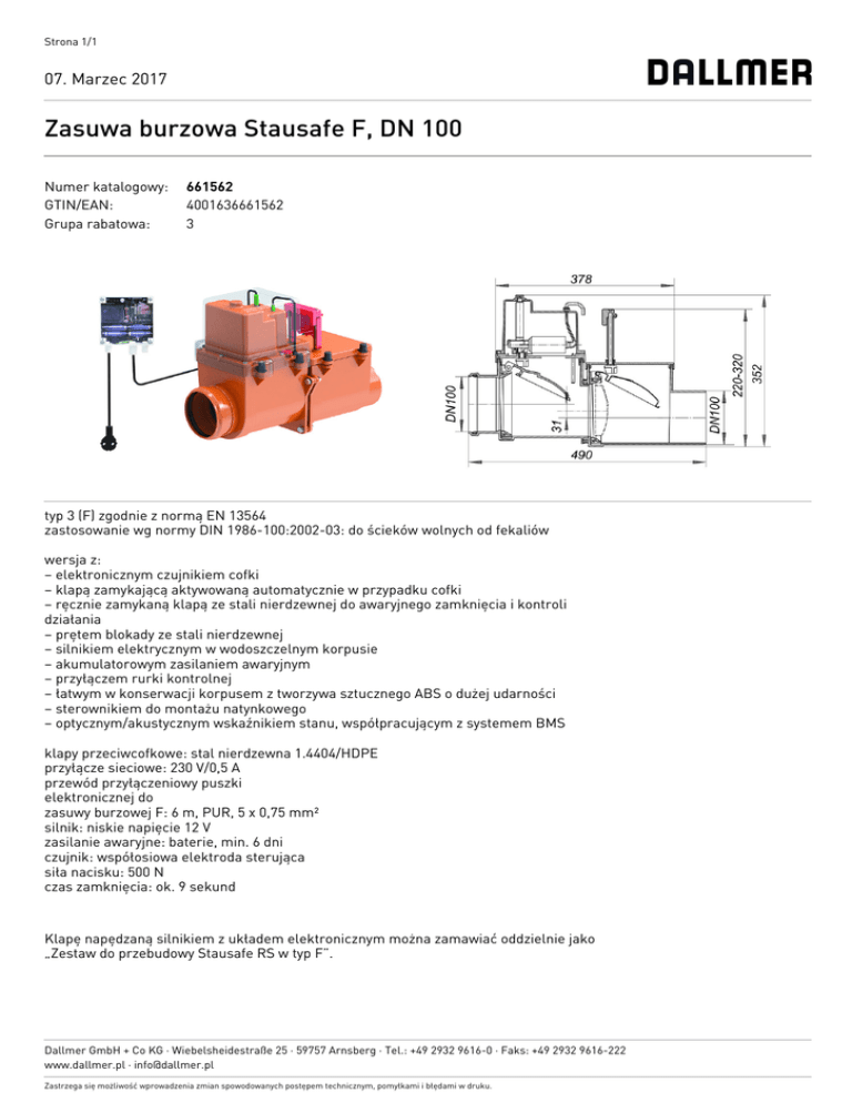 Strona 1/1 07. Marzec 2017 Zasuwa burzowa Stausafe F, DN 100 Numer katalogowy: GTIN/EAN: Grupa rabatowa: 661562 4001636661562 3 typ 3 (F) zgodnie z normą EN 13564 zastosowanie wg normy DIN 1986-100:2002-03: do ścieków wolnych od fekaliów wersja z: – elektronicznym czujnikiem cofki – klapą zamykającą aktywowaną automatycznie w przypadku cofki – ręcznie zamykaną klapą ze stali nierdzewnej do awaryjnego zamknięcia i kontroli działania – prętem blokady ze stali nierdzewnej – silnikiem elektrycznym w wodoszczelnym korpusie – akumulatorowym zasilaniem awaryjnym – przyłączem rurki kontrolnej – łatwym w konserwacji korpusem z tworzywa sztucznego ABS o dużej udarności – sterownikiem do montażu natynkowego – optycznym/akustycznym wskaźnikiem stanu, współpracującym z systemem BMS klapy przeciwcofkowe: stal nierdzewna 1.4404/HDPE przyłącze sieciowe: 230 V/0,5 A przewód przyłączeniowy puszki elektronicznej do zasuwy burzowej F: 6 m, PUR, 5 x 0,75 mm² silnik: niskie napięcie 12 V zasilanie awaryjne: baterie, min. 6 dni czujnik: współosiowa elektroda sterująca siła nacisku: 500 N czas zamknięcia: ok. 9 sekund Klapę napędzaną silnikiem z układem elektronicznym można zamawiać oddzielnie jako „Zestaw do przebudowy Stausafe RS w typ F”. Dallmer GmbH + Co KG · Wiebelsheidestraße 25 · 59757 Arnsberg · Tel.: +49 2932 9616-0 · Faks: +49 2932 9616-222 www.dallmer.pl · [email protected] Zastrzega się możliwość wprowadzenia zmian spowodowanych postępem technicznym, pomyłkami i błędami w druku.