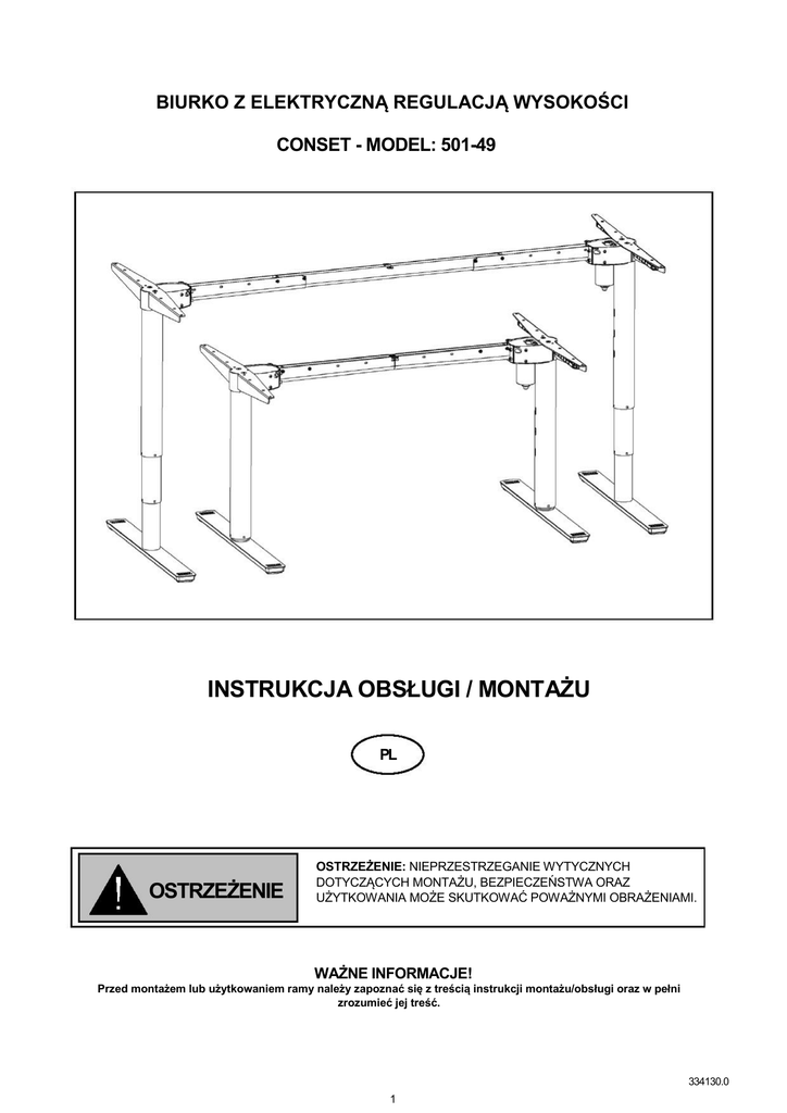 BIURKO Z ELEKTRYCZNĄ REGULACJĄ WYSOKOŚCI CONSET - MODEL: 501-49 INSTRUKCJA OBSŁUGI / MONTAŻU PL OSTRZEŻENIE OSTRZEŻENIE: NIEPRZESTRZEGANIE WYTYCZNYCH DOTYCZĄCYCH MONTAŻU, BEZPIECZEŃSTWA ORAZ UŻYTKOWANIA MOŻE SKUTKOWAĆ POWAŻNYMI OBRAŻENIAMI. WAŻNE INFORMACJE! Przed montażem lub użytkowaniem ramy należy zapoznać się z treścią instrukcji montażu/obsługi oraz w pełni zrozumieć jej treść. 334130.0 1 SPIS TREŚCI 1. BEZPIECZEŃSTWO I OSTRZEŻENIA 2. UŻYTKOWANIE 3. KONFIGURACJA I MONTAŻ 4. OBSŁUGA 5. KONSERWACJA I WADY 6. DANE TECHNICZNE 7. CZĘŚCI 8. INSTRUKCJA MONTAŻU 9. DEKLARACJA ZGODNOŚCI 1. BEZPIECZEŃSTWO I OSTRZEŻENIA Niniejszy stół został wyprodukowany zgodnie z wymogami dotyczącymi bezpieczeństwa. Niewłaściwe użytkowanie może uszkodzić stół oraz stanowić zagrożenie dla zdrowia. Prosimy o zapoznanie się z treścią instrukcji obsługi przed rozpoczęciem użytkowania stołu. Instrukcja zawiera ważne informacje dotyczące bezpieczeństwa, użytkowania oraz konserwacji. Uważna lektura instrukcji pomoże uniknąć szkód oraz zminimalizuje zagrożenie dla Ciebie i Twojej Rodziny. Prosimy o zachowanie instrukcji i przekazanie jej przyszłym użytkownikom stołu. 2. UŻYTKOWANIE Stoły z elektryczną regulacją wysokości mogą służyć jako stanowiska pracy jedynie w warunkach niskiej wilgotności powierza (0-40˚C; 20-90% względnej wilgotności). Stół można dowolnie regulować w celu uzyskania najbardziej ergonomicznej powierzchni pracy. Rama została wyprodukowana do użytku określonego w instrukcji obsługi; ramy nie należy użytkować w warunkach wysokiej wilgotności powietrza ani w celu podnoszenia osób. Użytkownik, który nie przestrzega instrukcji czyni to na własną odpowiedzialność! Nie należy kłaść się ani ruszać pod ramą stołu, ani siadać lub stać na ramie. DZIECI mogą korzystać z ramy jedynie pod nadzorem osoby dorosłej. Odpowiedzialność: Producent nie ponosi odpowiedzialności za szkody lub straty spowodowane użytkowaniem lub obchodzeniem się z ramą w sposób niezgodny z wytycznymi zawartymi w niniejszej instrukcji obsługi. 3. KONFIGURACJA I MONTAŻ Po dokonaniu montażu stołu (patrz: instrukcja montażu, ROZDZIAŁ 8), należy zamocować regulowane stopki, by wypoziomować stół oraz zapobiec jego przesuwaniu. Stół należy podłączyć do gniazda 100-240 VAC. Stół jest wówczas gotowy do użytku. Należy zwrócić uwagę, by kable nie zostały zacięte. Stół należy umieścić w bezpiecznej odległości od ram okiennych, grzejników, mebli, itp., by zapobiec wypadkom. Pod stołem nie należy umieszczać przedmiotów wyższych niż 55 cm. Jeżeli chcesz przemieścić stół, należy najpierw zdemontować blat. NIE NALEŻY podnosić stołu za blat! 4. OBSŁUGA PODNOSZENIE/OBNIŻANIE: Podnoszenie oraz obniżanie ramy odbywa się za pomocą przycisku 2 5. KONSERWACJA I WADY Stół nie wymaga regularnej konserwacji poza tą opisaną w ROZDZIALE 2. Stół należy czyścić za pomocą wilgotnej ścierki. Jeżeli podczas ruchu mechanizmu użytkownik usłyszy zgrzytający dźwięk, należy ZAPRZESTAĆ korzystania z biurka oraz skontaktować się z dostawcą. 6. DANE TECHNICZNE Rama, tworzywo: Stal, lakierowana proszkowo / Chrom Waga: 23 kg (25 kg wraz z opakowaniem) Szerokość 120-200 cm Głębokość 70-120 cm (w zależności od kształtu) Wysokość (ramy) 60-123 cm Prędkość ˜32 mm/sek. (bez obciążenia) FMAX = Maksymalne obciążenie 100 kg (na ramie) Cykl pracy: 10% na 50% maks. obciążenia na ramie lub 2 min pracy ciągłej Użytkowanie: Za pomocą mikroprzełączników Zasilanie: 100-240 VAC / 50/60 Hz Pobieranie prądu w trybie czuwania: < 1 Watt Powyższe dane mogą ulec zmianie w zależności od lokalnej temperatury, wilgotności oraz poziomu napięcia 7. CZĘŚCI 3 3 INSTRUKCJA MONTAŻU 8. 1 8 1a 1b 2 7 7 3 1 2 9 e) x 4 6 4 ciąg dalszy . ciąg dalszy .. 4 5 c) x 1 a) x 2 b) x 2 5 5 ciąg dalszy . ciąg dalszy .. 3 6 2 4 d) x 16 Szyny na kable f) x 2 Montaż stołu został zakończony. Instrukcje użytkowania zostały zawarte w ROZDZIALE 2. 9. DEKLARACJA ZGODNOŚCI Niniejszym oświadczamy, na własną odpowiedzialność, że poniższy produkt: - Biurko ConSet do pracy w pozycji siedzącej oraz stojącej, model 501-49 został wyprodukowany zgodnie z: - Rozporządzeniem 2006/42/EF Parlamentu Europejskiego i Rady, dotyczącego urządzeń mechanicznych, oraz zgodnie ze zmianami zawartymi w Rozporządzeniu 95/16/EF W związku z powyższym użytkownik powinien mieć świadomość, iż: - stół do pracy w pozycji siedzącej oraz stojącej uważany jest za urządzenie mechaniczne, oraz: ze stołu można korzystać dopiero wówczas, gdy zostanie zmontowany zgodnie z wytycznymi zawartymi w niniejszej instrukcji obsługi. Producent: ConSet A/S Staalvej 14-16 DK-6900 Skjern Denmark Tel: +45 9680 0080, Fax: +45 9680 0081 www.conset.com, [email protected] 6 Wyłączny dystrybutor w Polsce KRYZA Technologies & Enterprises ul. Orla 31a/6 75-727 Koszalin, POLAND tel. +48 502 649 749 tel. +48 94 347 34 43 fax +48 94 712 61 34 e-mail: [email protected] www.meble-ruchome.pl www.conset.pl 7