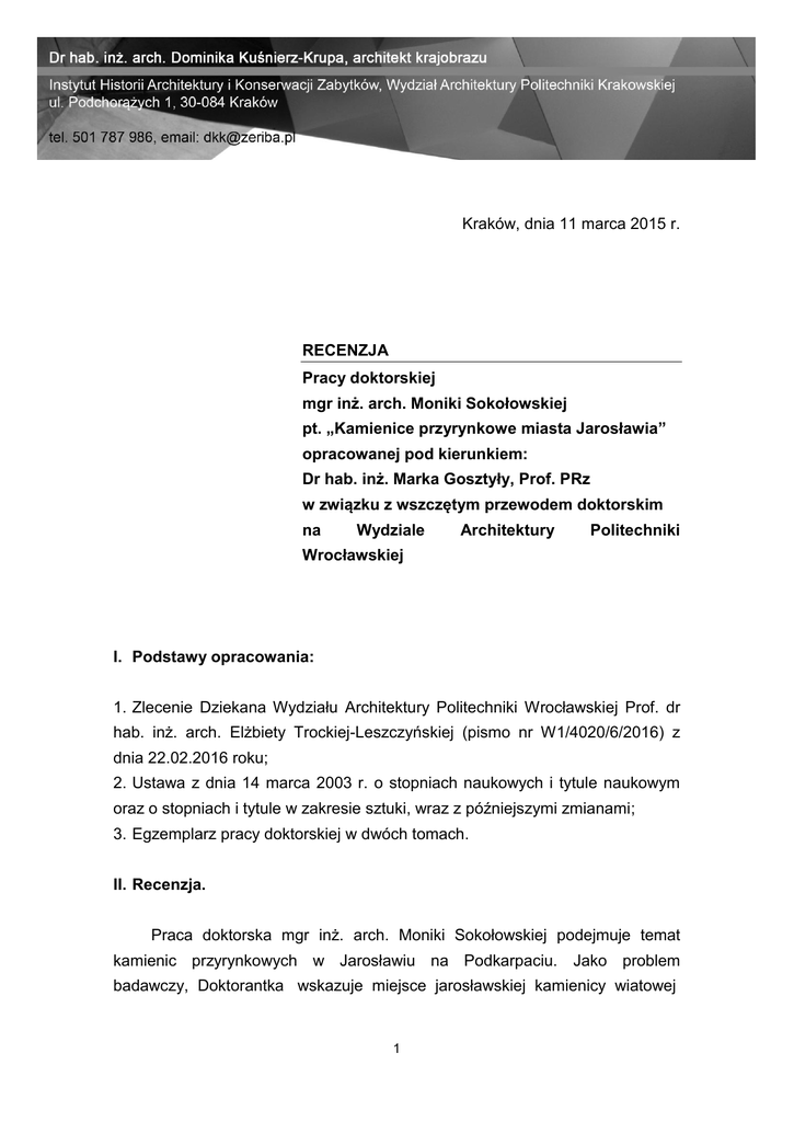 Kraków, dnia 11 marca 2015 r. RECENZJA Pracy doktorskiej mgr inż. arch. Moniki Sokołowskiej pt. „Kamienice przyrynkowe miasta Jarosławia” opracowanej pod kierunkiem: Dr hab. inż. Marka Gosztyły, Prof. PRz w związku z wszczętym przewodem doktorskim na Wydziale Architektury Politechniki Wrocławskiej I. Podstawy opracowania: 1. Zlecenie Dziekana Wydziału Architektury Politechniki Wrocławskiej Prof. dr hab. inż. arch. Elżbiety Trockiej-Leszczyńskiej (pismo nr W1/4020/6/2016) z dnia 22.02.2016 roku; 2. Ustawa z dnia 14 marca 2003 r. o stopniach naukowych i tytule naukowym oraz o stopniach i tytule w zakresie sztuki, wraz z późniejszymi zmianami; 3. Egzemplarz pracy doktorskiej w dwóch tomach. II. Recenzja. Praca doktorska mgr inż. arch. Moniki Sokołowskiej podejmuje temat kamienic przyrynkowych w Jarosławiu na Podkarpaciu. Jako problem badawczy, Doktorantka wskazuje miejsce jarosławskiej kamienicy wiatowej 1 pośród innych obiektów budownictwa mieszczańskiego w centrach miast historycznych na terenie Europy. Za tezę pracy obiera Ona stwierdzenie, że wykształcony Jarosławiu w u schyłku XVII wieku model kamienicy mieszczańskiej ma unikalną formę przestrzenną oraz układ funkcjonalny na tle innych typów kamienic mieszczańskich występujących na terenie Europy. Prócz udowodnienia obranej tezy Doktoranta wskazuje także inne cele badawcze swojej pracy. Są to: - określenie wpływu czynników gospodarczych, społecznych oraz wydarzeń historycznych na zmiany programów architektoniczno- funkcjonalnych, formę i wystrój nowożytnej kamienicy mieszczańskiej w Jarosławiu; - podjęcie próby ustalenia rodowodu historycznego jarosławskiej kamienicy wiatowej w kontekście przemian mieszczańskiej architektury europejskiej; - przeprowadzenie analizy metrologicznej rynku w Jarosławiu, wyznaczenie miar jarosławskich, których użyto do wyznaczenia rynku oraz działek przyrynkowych; - podjęcie próby rekonstrukcji układu lokacyjnego Jarosławia w oparciu o wyznaczone wcześniej miary; - przeprowadzenie próby rekonstrukcji układu kamienicy z końca XVII wieku z uwzględnieniem późniejszych zmian, w oparciu o zgromadzony materiał badawczy; - przeprowadzenie analizy typologicznej jarosławskich kamienic przyrynkowych oraz - usystematyzowanie stanu wiedzy i materiałów badawczych dotyczących przedmiotowych kamienic. Recenzowana praca zawarta jest w dwóch tomach. W pierwszym Autorka zamieściła tekst, w drugim natomiast „Katalog kamienic przyrynkowych miasta Jarosławia”. Tom pierwszy liczy 132 strony wraz z materiałem ilustracyjnym (w skład którego wchodzi 51 rycin, 8 fotografii i 3 tabele); przypisami w ilości 57 oraz nieponumerowanymi w tekście; bibliografią; listą skrótów; streszczeniem oraz 8 aneksami. Tom drugi liczy 98 stron i jest jak wyżej napisano katalogiem z obszernym materiałem ilustracyjnym w ilości 80 fotografii oraz 49 rycin. 2 Układ merytoryczny przedmiotowej pracy jest jasny i klarowny, a struktura podziału treści odpowiada wymogom prac doktorskich. Tom pierwszy rozpoczyna, w formie Wstępu, Rozdział 1, w którym Doktorantka charakteryzuje „Przedmiot pracy”, stawia wymienioną wyżej tezę badawczą, a także opisuje cele badań i konstrukcję pracy. W rozdziale tym Autorka przedstawia również metody, którymi posłużyła się podczas prowadzenia badań nad podjętą problematyką. Były to studia historyczne, w tym kwerendy w archiwach, analizy historyczno-urbanistyczne, badania terenowe, analizy porównawcze oraz „analiza pomiarowa planu miasta” czyli analiza metrologiczna układu urbanistycznego. Rozdział 2 charakteryzowanego tomu dotyczy stanu badań nad podjętą problematyką. Doktoranta wymienia osobno materiały archiwalne, publikacje oraz dokumentacje naukowe, które przeanalizowała podczas pisania pracy. Wskazuje także miejsce przechowywania najważniejszych archiwaliów związanych z historią miasta. Rozdział 3 zatytułowany „Jarosław w panoramie dziejów - krótki rys historyczny” dotyczy historii miasta. Został on podzielony na pięć podrozdziałów. W pierwszym opisano początki osadnictwa na terenie późniejszego miasta do okresu wczesnego Średniowiecza. Drugi dotyczy okresu Średniowiecza. W kolejnym Autorka opisała dzieje miasta w czasach nowożytnych czyli między XVI a XVIII wiekiem. Podrozdział czwarty został poświecony dziejom miasta w wieku XIX oraz XX, a ostatni zaś czasom współczesnym. Rozdział następny zatytułowany „Rodowód kamienicy środkowoeuropejskiej” podzielno na pięć podrozdziałów. Podrozdział pierwszy dotyczy tła historycznego formowania się ośrodków miejskich na terenie Środkowej Europy. W kolejnym Autorka opisała genezę kamienicy środkowoeuropejskiej, charakteryzując dom wolnostojący oraz dom szeregowy. W podrozdziale 3 Doktoranta porównuje kamienicę północnoeuropejską (in. dolnoniemiecką) i środkowoeuropejską (górnoniemiecką), charakteryzując przy tym przedmiotowe typy domów. Następny podrozdział poświecony został zagadnieniom nowożytnej kamienicy środkowoeuropejskiej. Autorka opisuje w nim domy z terenu Moraw, Jihlavy, Śląska, Görlitz oraz Małopolski i Polski Południowo - Wschodniej, a także koncepcję wpływów jakie na architekturę 3 kamienic Jarosławia mógł mieć Bliski Wschód co wiązało się ze stosunkami handlowymi miasta z imperium osmańskim. Rozdział 5 dotyczy współczesnego programu funkcjonalnego i architektonicznego kamienic Jarosławia. Autorka w rozdziale tym zwraca uwagę na fakt, że obecnie jarosławski rynek, a co za tym idzie także historyczne kamienice nie spełniają już pierwotnie przyjętej funkcji, co wiąże się z ich przekształceniami. Rozdział 6 Doktorantka poświeciła tematyce rynku, w tym analizie metrologicznej oraz wyznaczeniu miar jarosławskich. W rozdziale tym Autorka przedstawiała najpierw stan badań dotyczących opisywanej problematyki, a następnie, w 