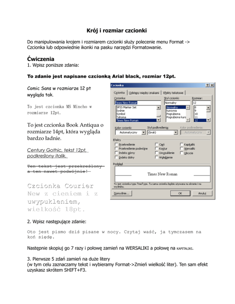 Krój i rozmiar czcionki Do manipulowania krojem i rozmiarem czcionki służy polecenie menu Format -> Czcionka lub odpowiednie ikonki na pasku narzędzi Formatowanie. Ćwiczenia 1. Wpisz poniższe zdania: To zdanie jest napisane czcionką Arial black, rozmiar 12pt. Comic Sans w rozmiarze 12 pt wygląda tak. To jest czcionka MS Mincho w rozmiarze 12pt. To jest czcionka Book Antiqua o rozmiarze 14pt, która wygląda bardzo ładnie. Century Gothic, tekst 12pt, podkreślony italik. Ten tekst jest przekreślony a ten nawet podwójnie! Czcionka Courier New z cieniem i z uwypukleniem, wielkość 18pt. 2. Wpisz następujące zdanie: Oto jest pismo dziś pisane w nocy. Czytaj waść, ja tymczasem na koń siędę. Następnie skopiuj go 7 razy i połowę zamień na WERSALIKI a połowę na KAPITALIKI. 3. Pierwsze 5 zdań zamień na duże litery (w tym celu zaznaczamy tekst i wybieramy Format->Zmień wielkość liter). Ten sam efekt uzyskasz skrótem SHIFT+F3.